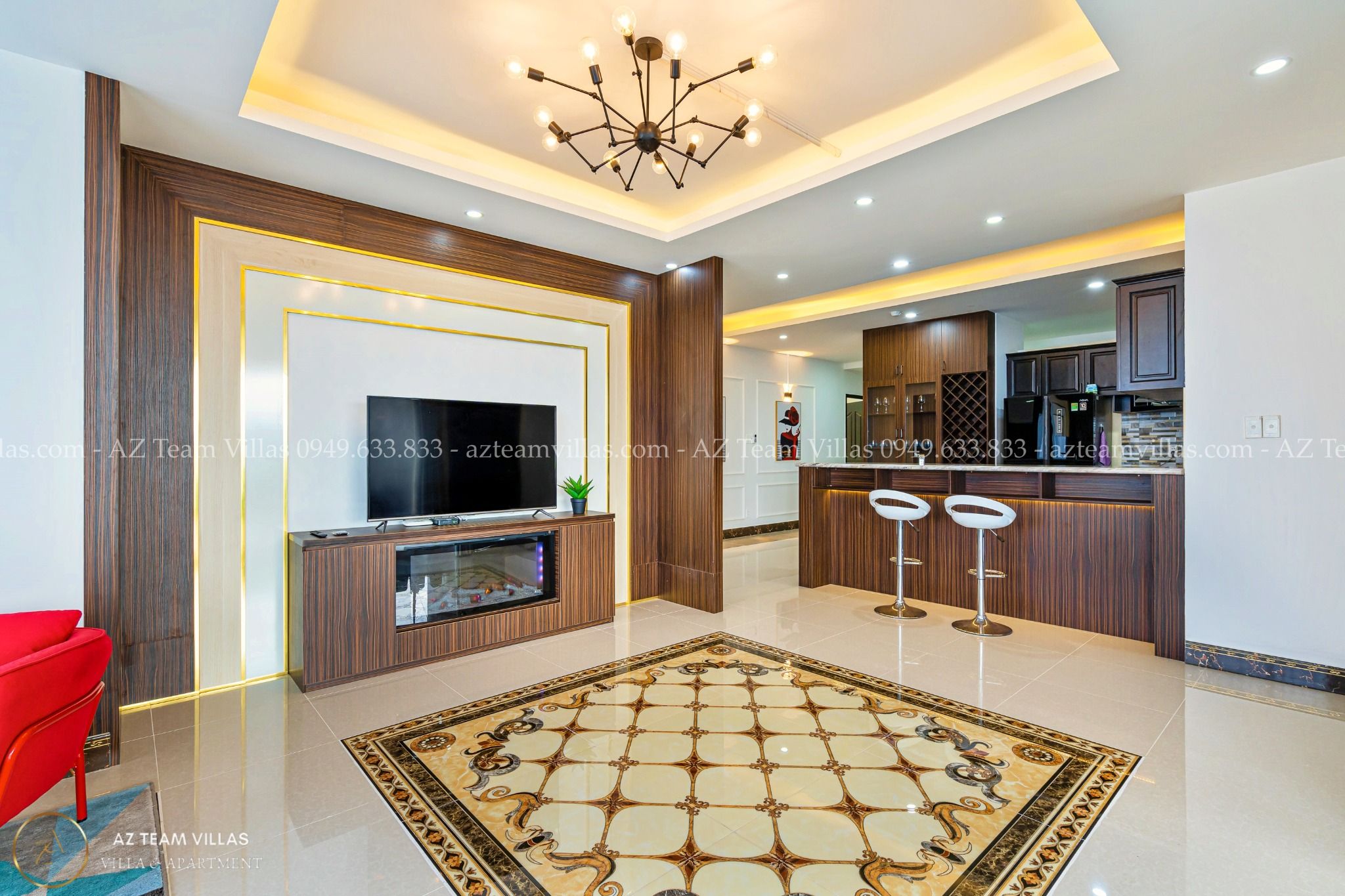- khu vực phòng khách rộng rãi và thoáng mát, với sofa da, bàn trà, tivi màn hình cong và kệ sách. Bạn có thể xem phim, đọc sách hoặc trò chuyện với bạn bè trong không gian này.