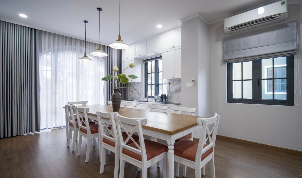 - Bếp đầy đủ thiết bị (tủ lạnh, lò vi sóng, lò nướng, nồi cơm điện)