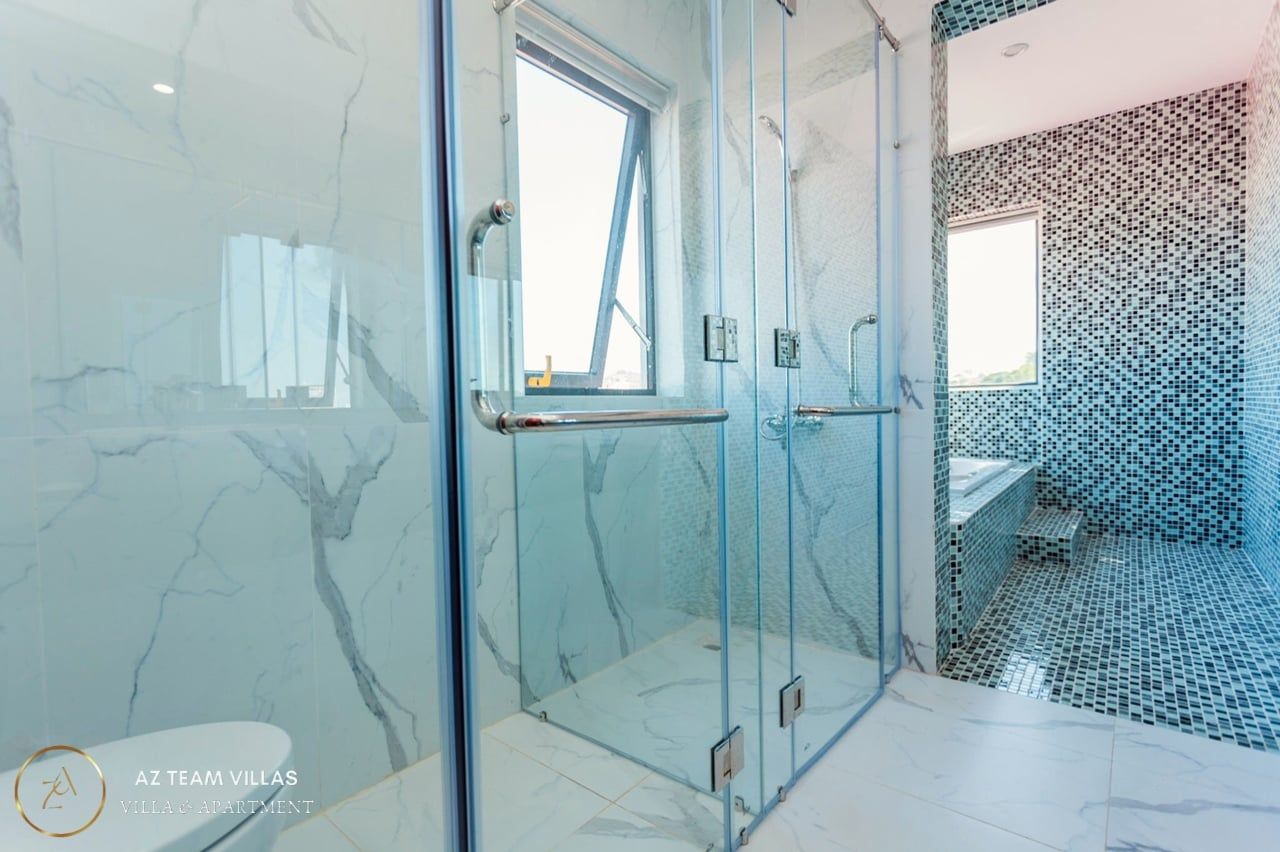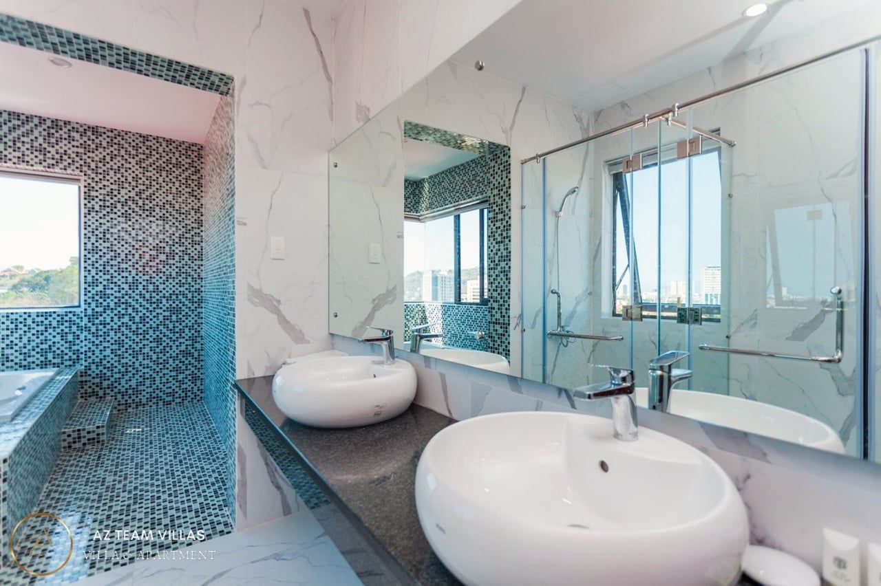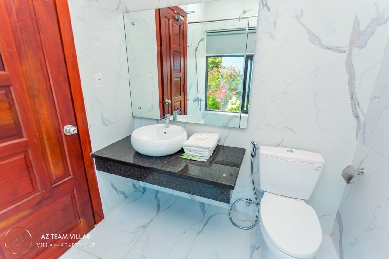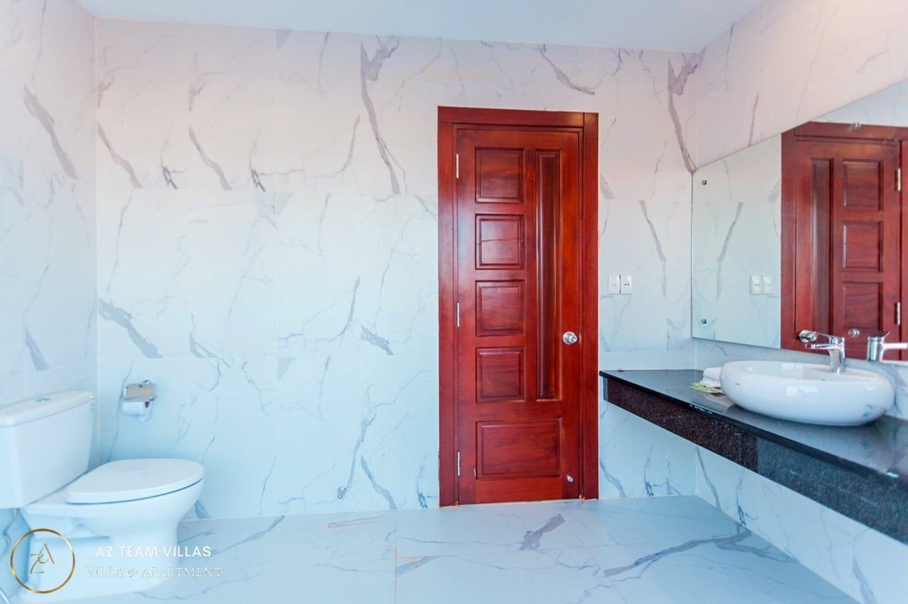 Villa gồm 5 phòng ngủ, 5 giường kích thước 1m8, 5 nệm thêm và 5 WC