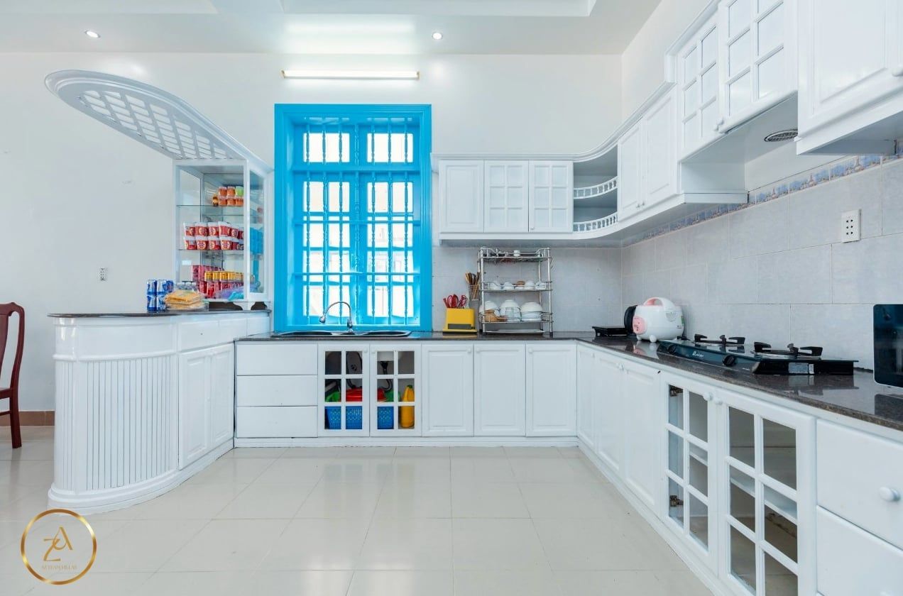 - Bếp cung cấp đầy đủ dụng cụ nấu ăn: lò vi sóng, lò nướng, nồi cơm điện, ấm đun nước điện, tủ lạnh, bát đĩa