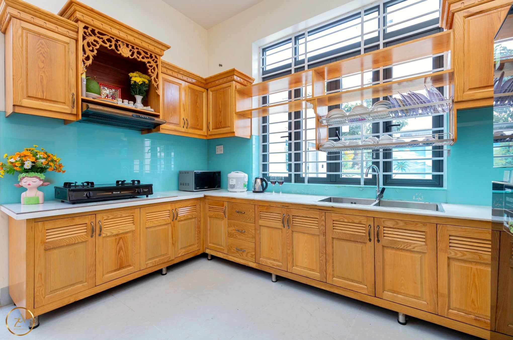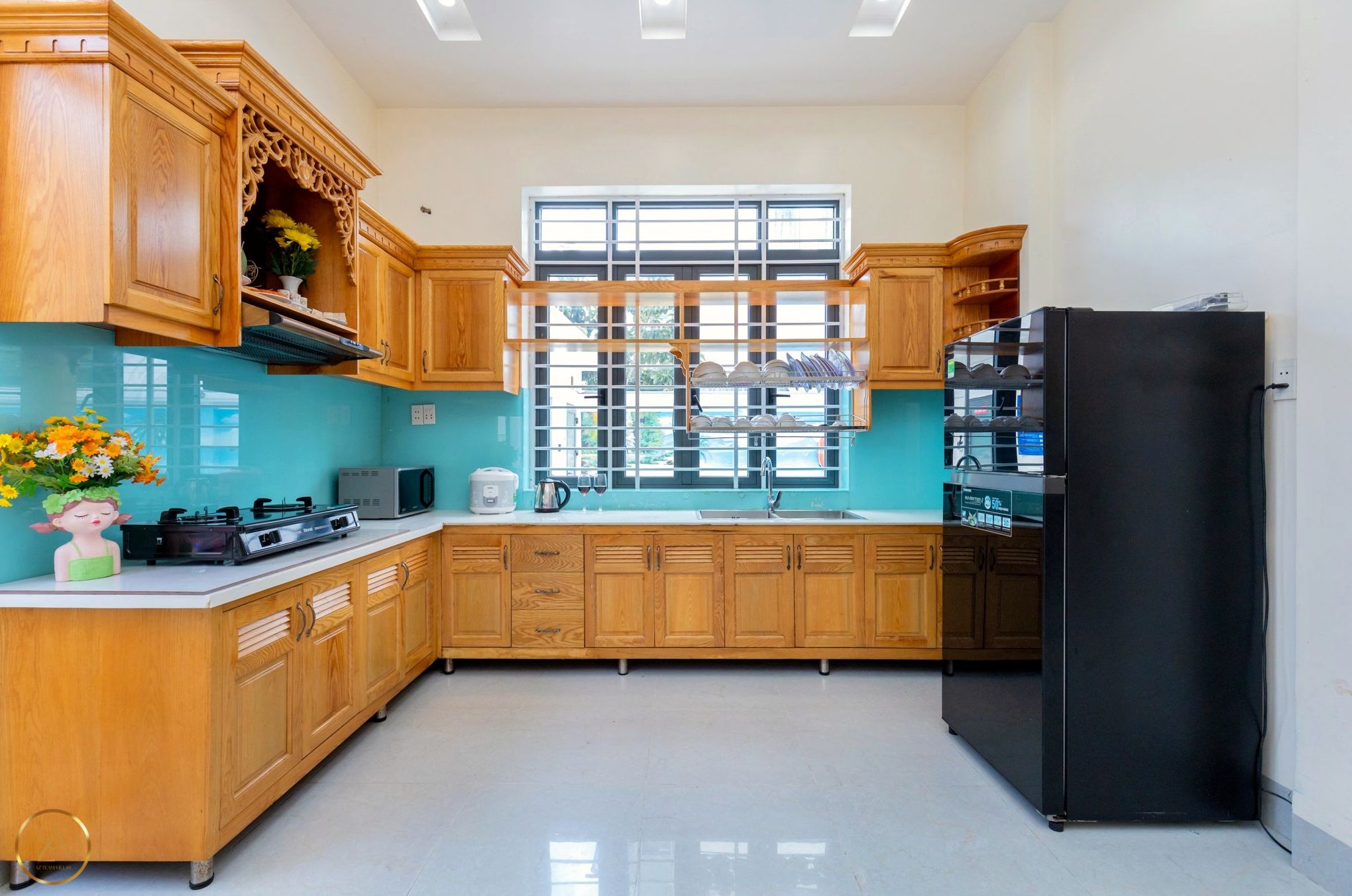 - Bếp cung cấp đầy đủ dụng cụ nấu ăn: lò vi sóng, lò nướng, nồi cơm điện, ấm đun nước điện, tủ lạnh, bát đĩa