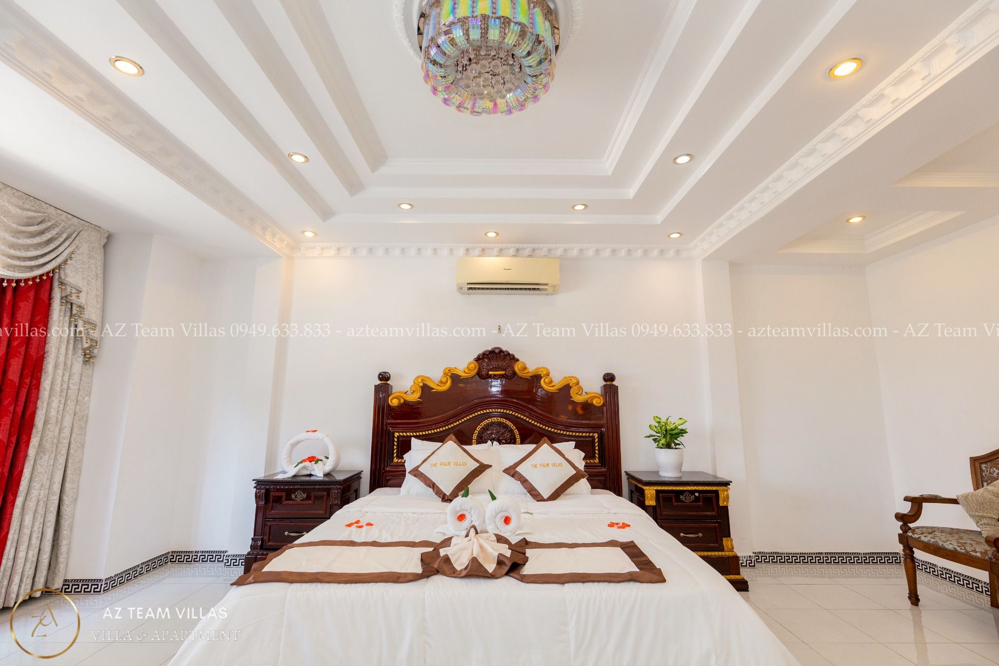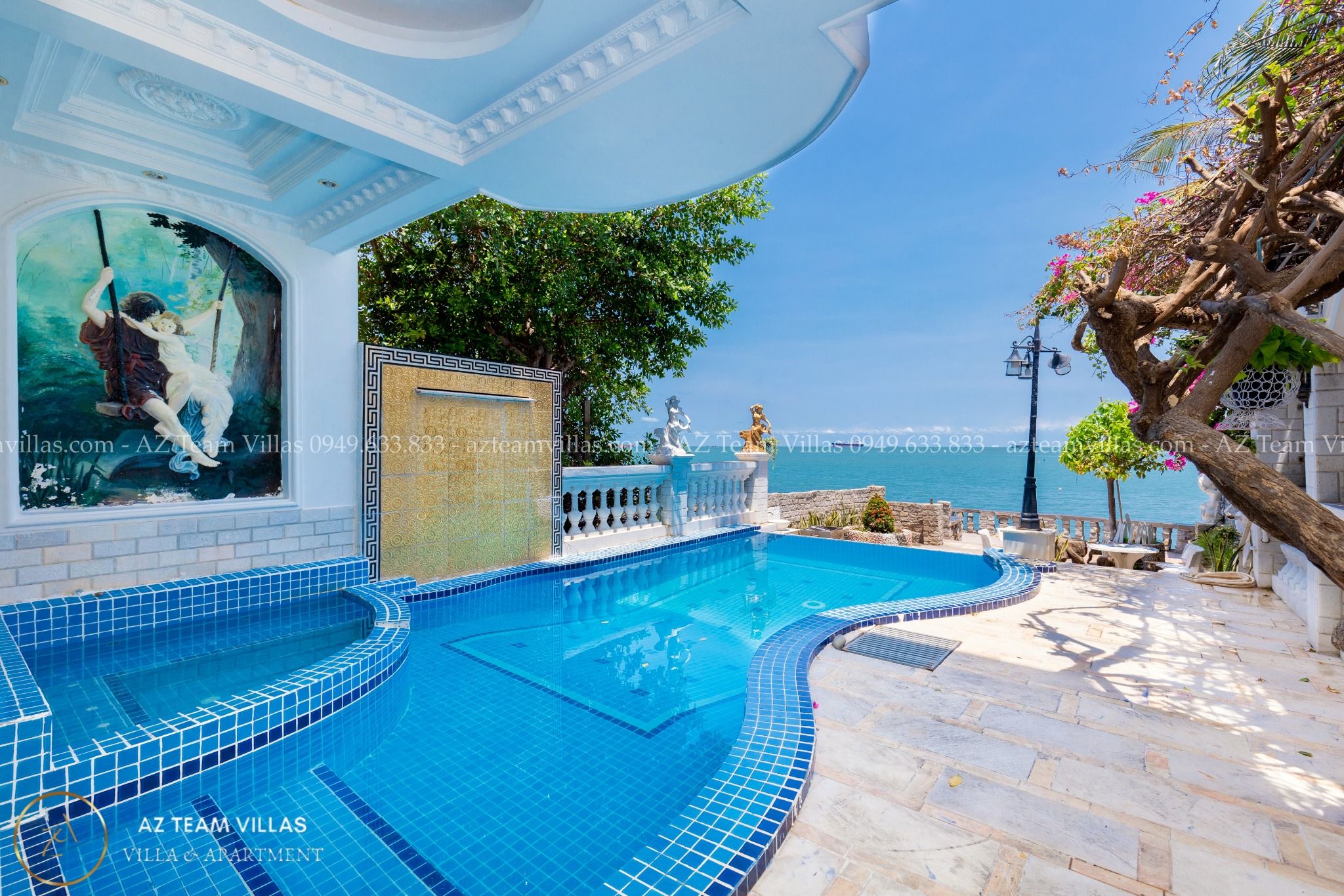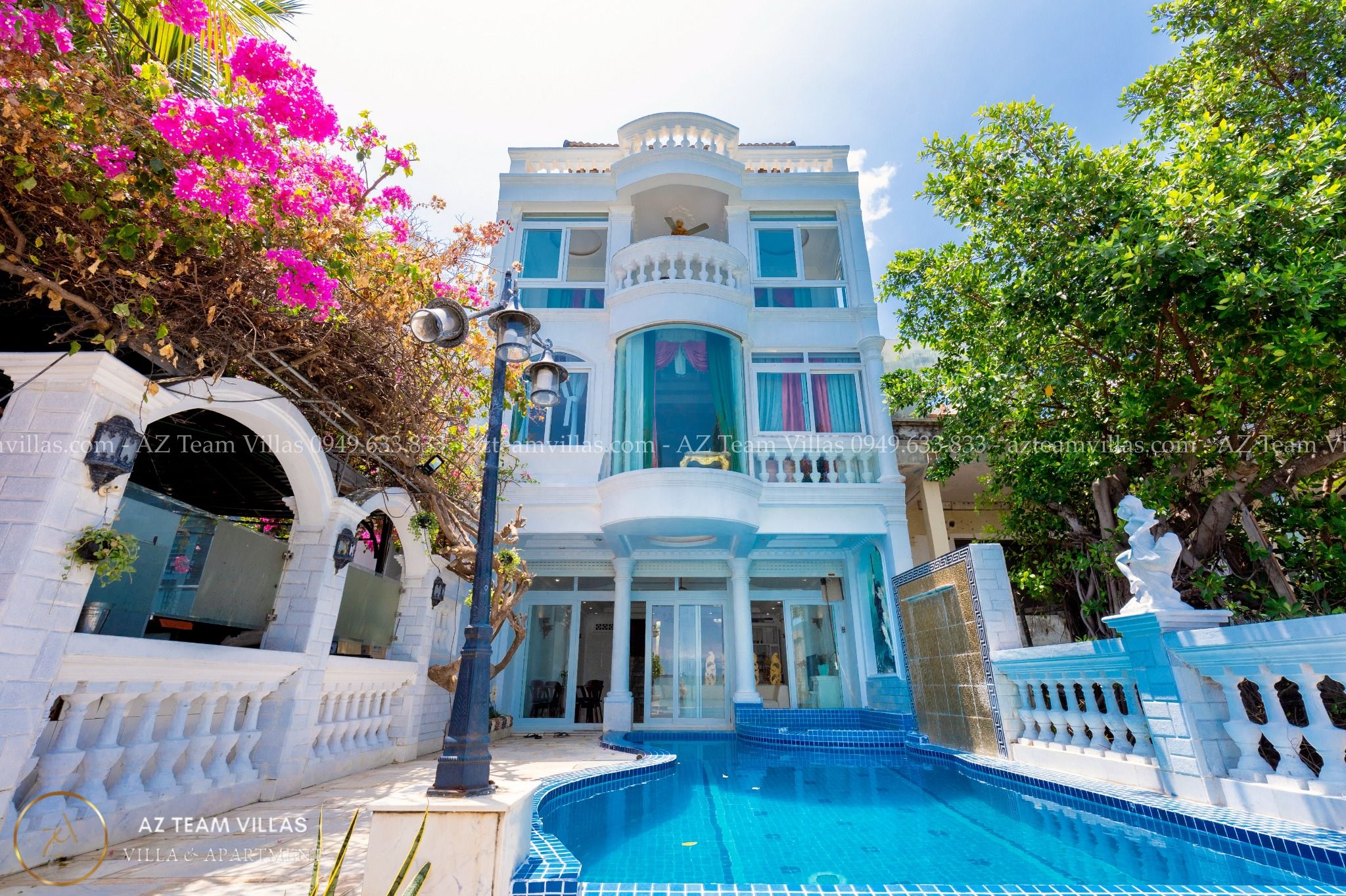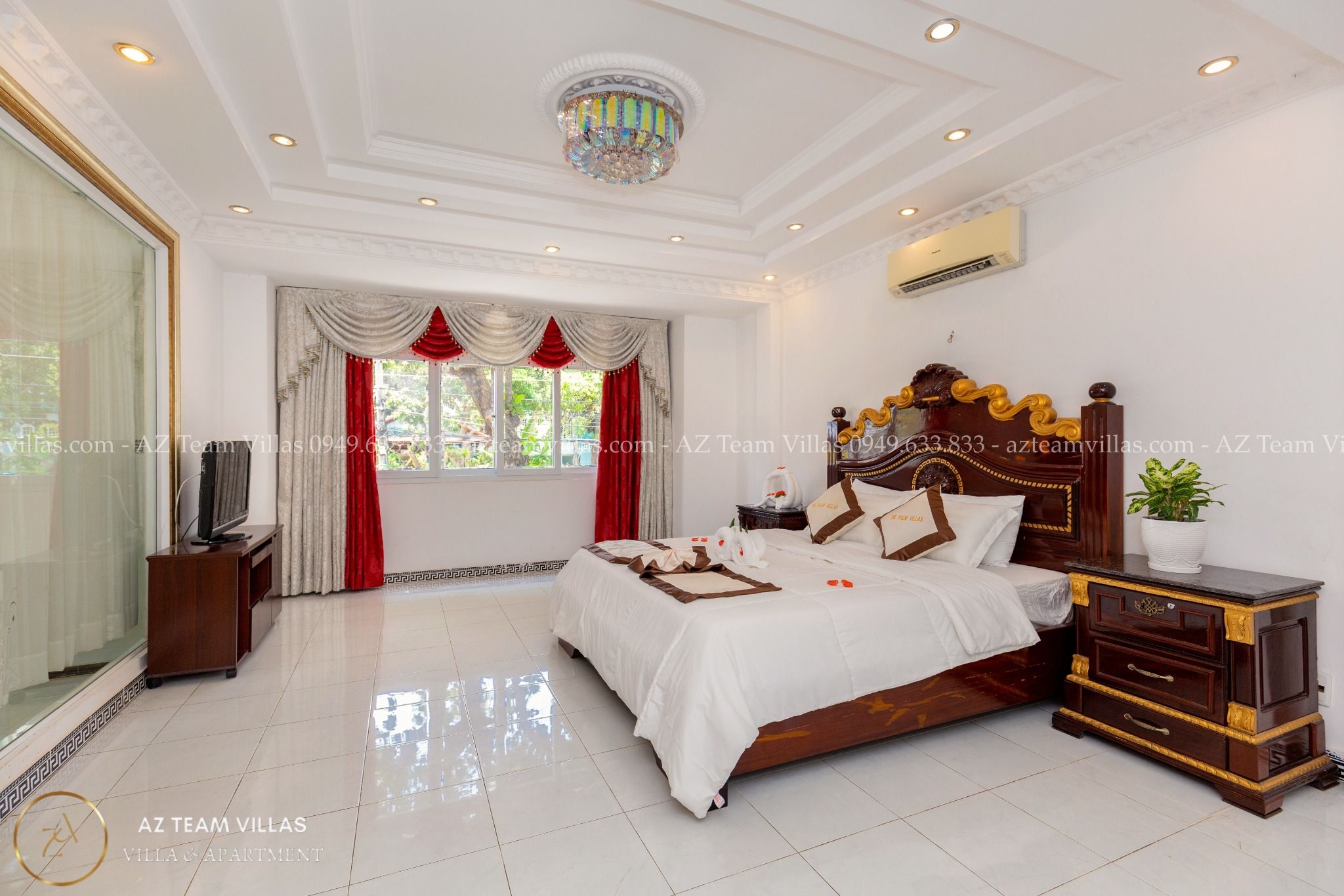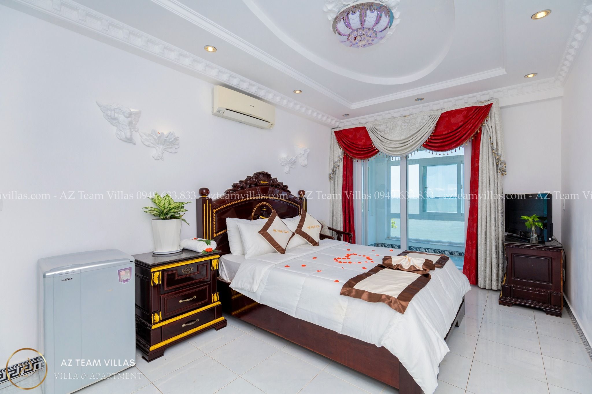Là một Villa sang trọng và hiện đại, nằm ngay sát bãi biển Bãi Dâu, Vũng Tàu. Biệt thự có diện tích 300 m2, gồm 5 phòng ngủ, 6 nhà vệ sinh, phòng khách, nhà bếp và sân hiên. Mỗi phòng ngủ đều có giường đôi cực lớn, máy lạnh, tivi và phòng tắm riêng. Phòng khách rộng rãi và thoáng mát, có sofa, bàn ăn và cửa sổ lớn nhìn ra hồ bơi và biển. Nhà bếp được trang bị đầy đủ tiện nghi như tủ lạnh, bếp điện, lò vi sóng và máy pha cà phê. Sân hiên là nơi lý tưởng để thư giãn và thưởng thức không khí biển, có ghế đẩu, bàn ghế và máy nướng BBQ. Biệt thự còn có hồ bơi riêng rộng 30 m2, nằm trong khuôn viên xanh mát và yên tĩnh. Từ biệt thự, chỉ cần đi bộ vài bước là đến được bãi biển Bãi Dâu, nơi có cát trắng mịn và nước trong xanh. Đây là sự lựa chọn hoàn hảo cho những ai muốn tận hưởng kỳ nghỉ sang trọng và thoải mái tại Vũng Tàu