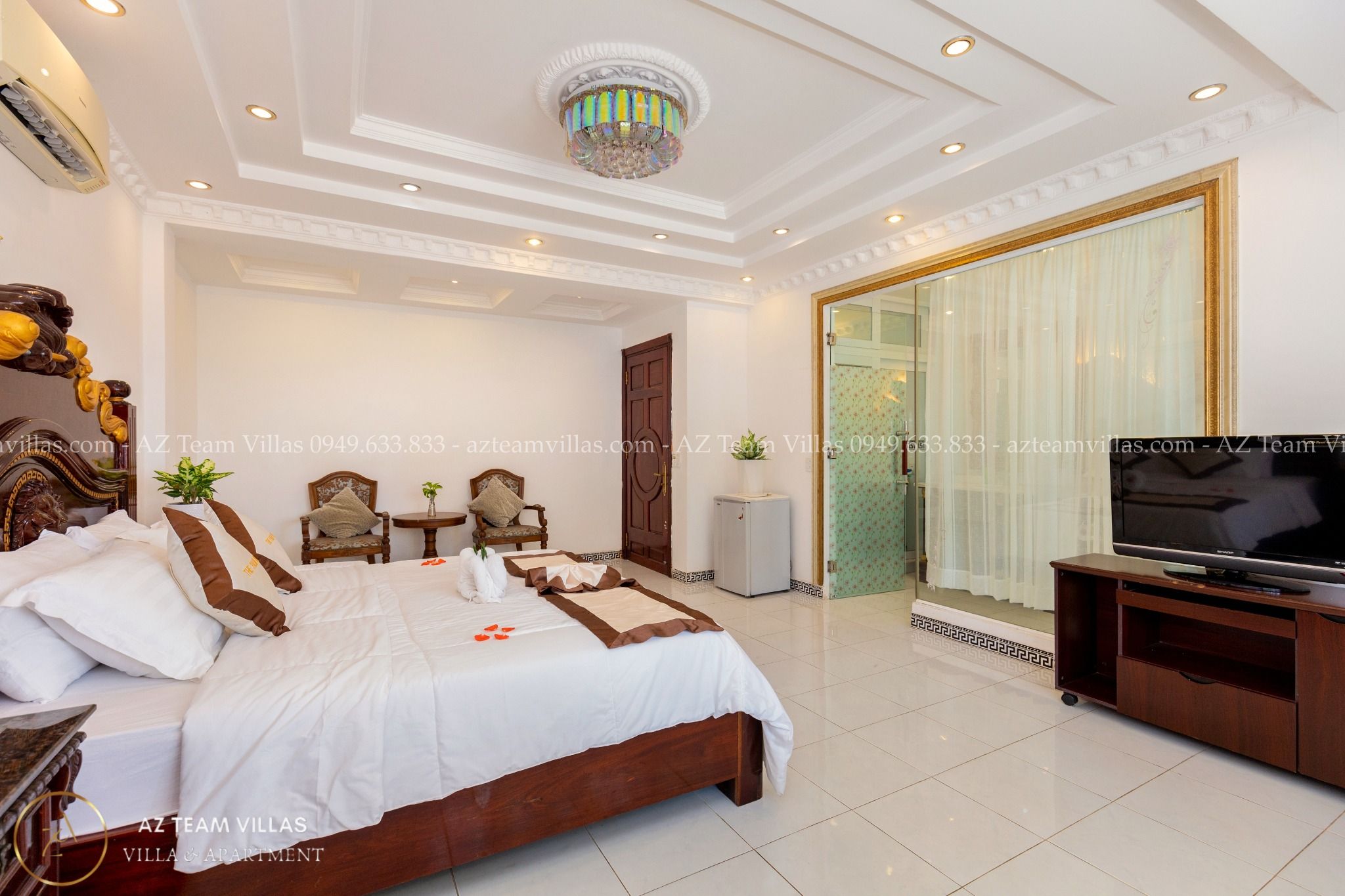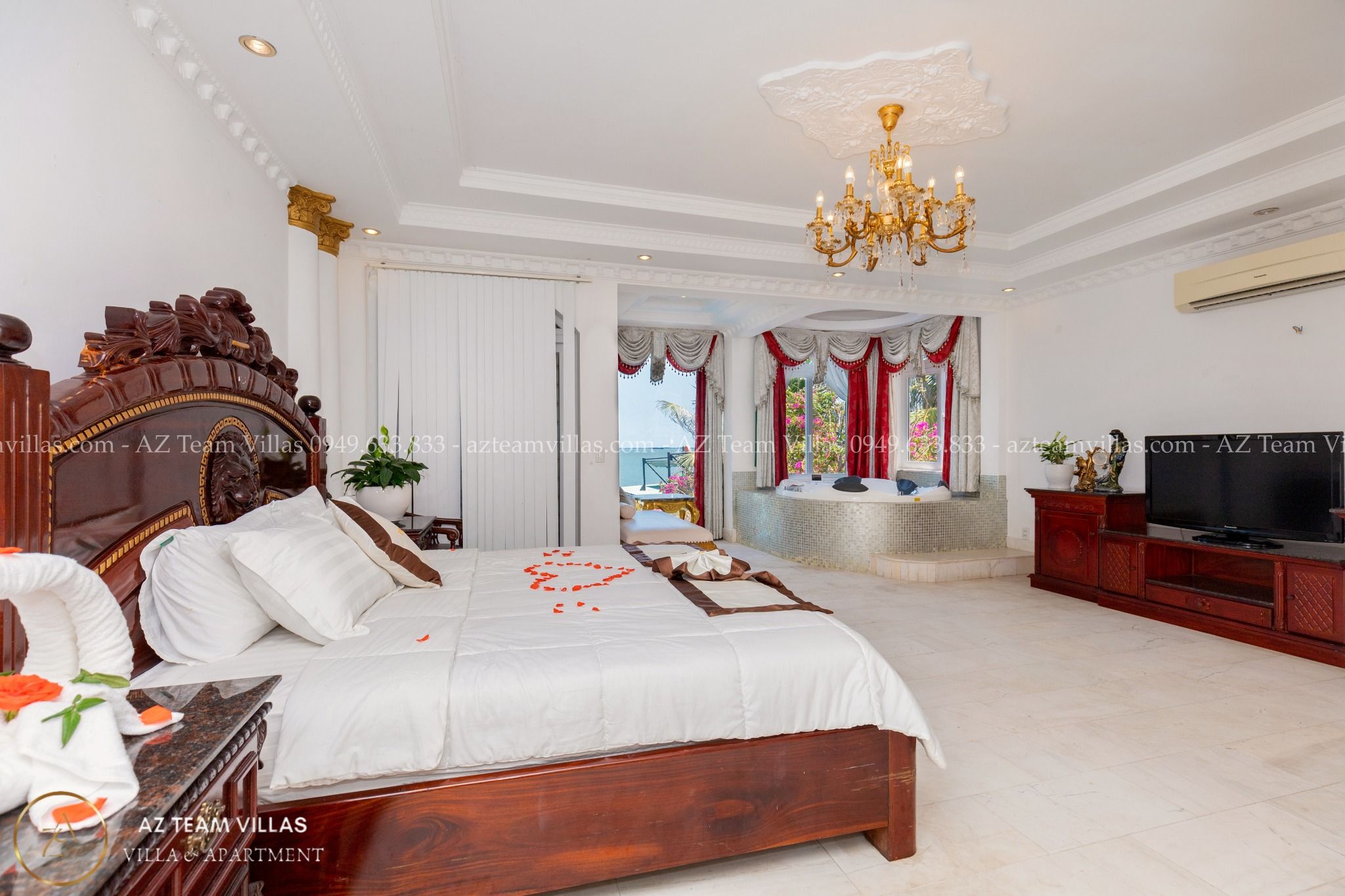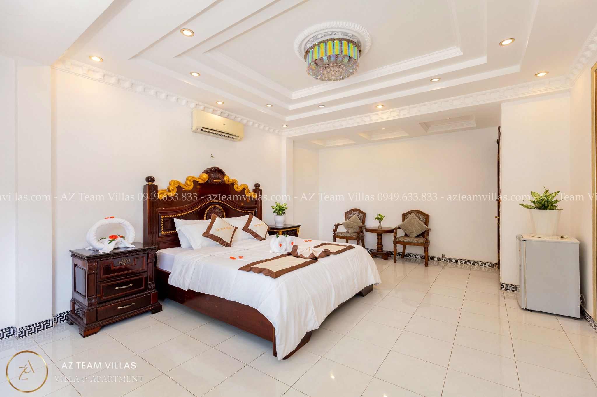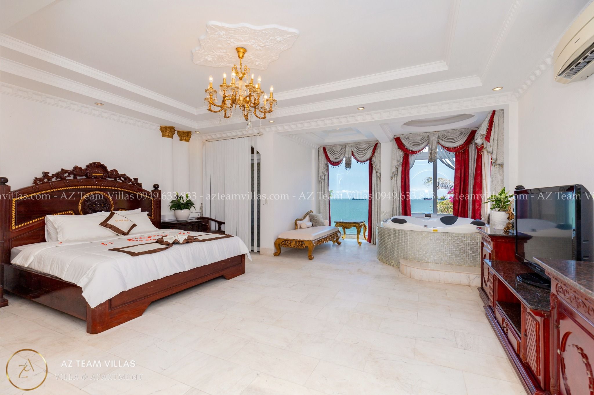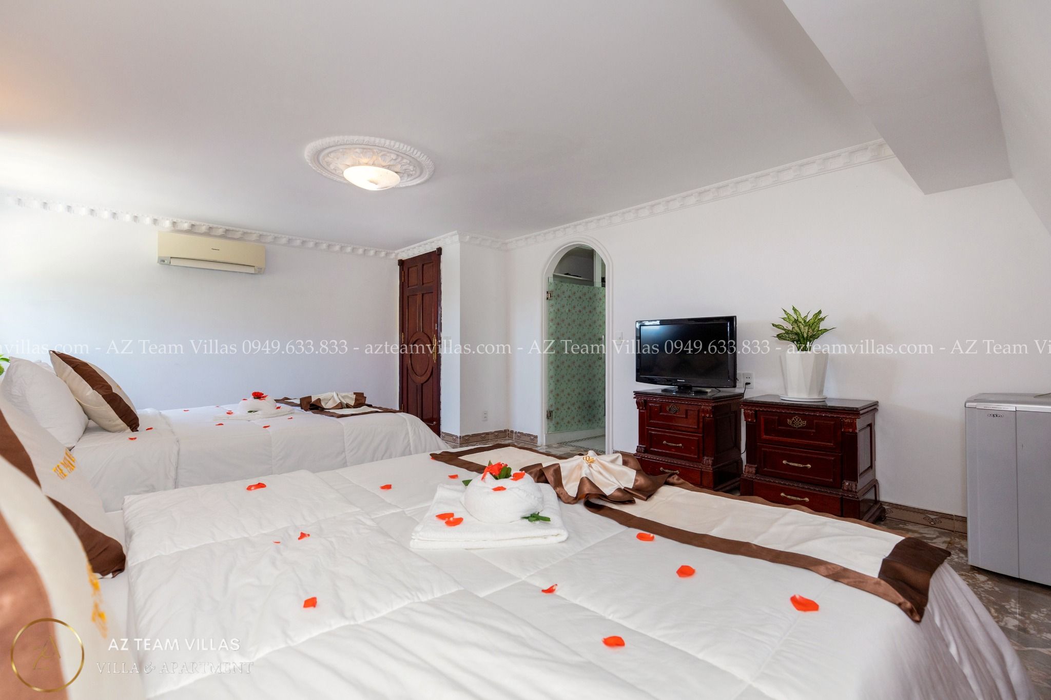 Là một Villa sang trọng và hiện đại, nằm ngay sát bãi biển Bãi Dâu, Vũng Tàu. Biệt thự có diện tích 300 m2, gồm 5 phòng ngủ, 6 nhà vệ sinh, phòng khách, nhà bếp và sân hiên. Mỗi phòng ngủ đều có giường đôi cực lớn, máy lạnh, tivi và phòng tắm riêng. Phòng khách rộng rãi và thoáng mát, có sofa, bàn ăn và cửa sổ lớn nhìn ra hồ bơi và biển. Nhà bếp được trang bị đầy đủ tiện nghi như tủ lạnh, bếp điện, lò vi sóng và máy pha cà phê. Sân hiên là nơi lý tưởng để thư giãn và thưởng thức không khí biển, có ghế đẩu, bàn ghế và máy nướng BBQ. Biệt thự còn có hồ bơi riêng rộng 30 m2, nằm trong khuôn viên xanh mát và yên tĩnh. Từ biệt thự, chỉ cần đi bộ vài bước là đến được bãi biển Bãi Dâu, nơi có cát trắng mịn và nước trong xanh. Đây là sự lựa chọn hoàn hảo cho những ai muốn tận hưởng kỳ nghỉ sang trọng và thoải mái tại Vũng Tàu
