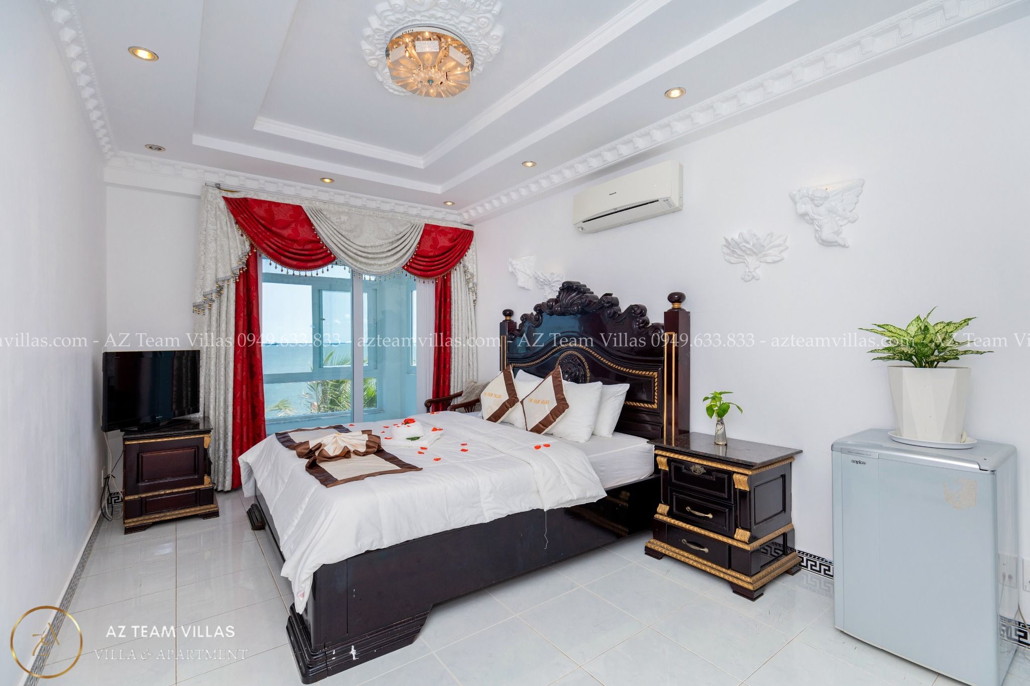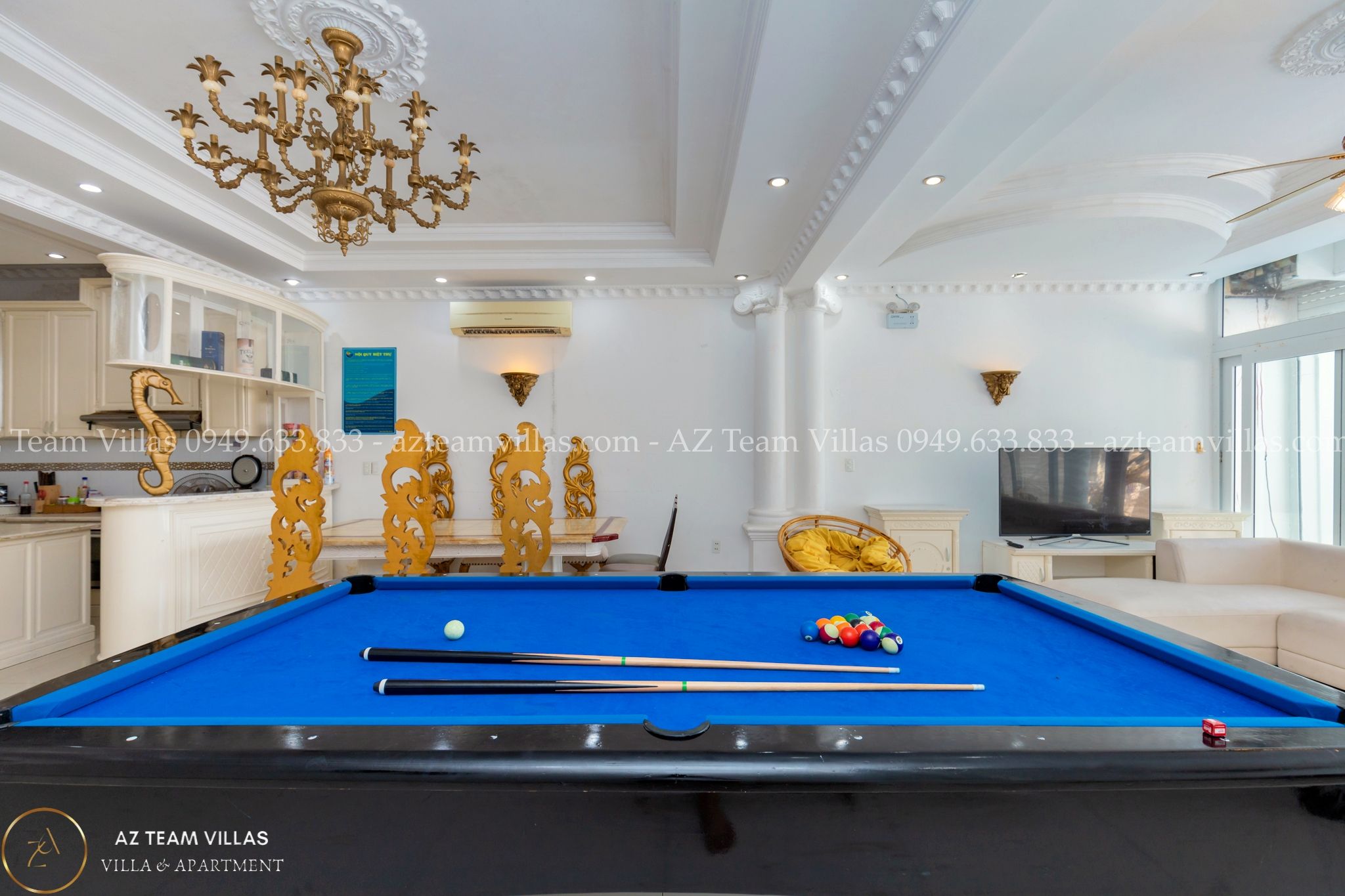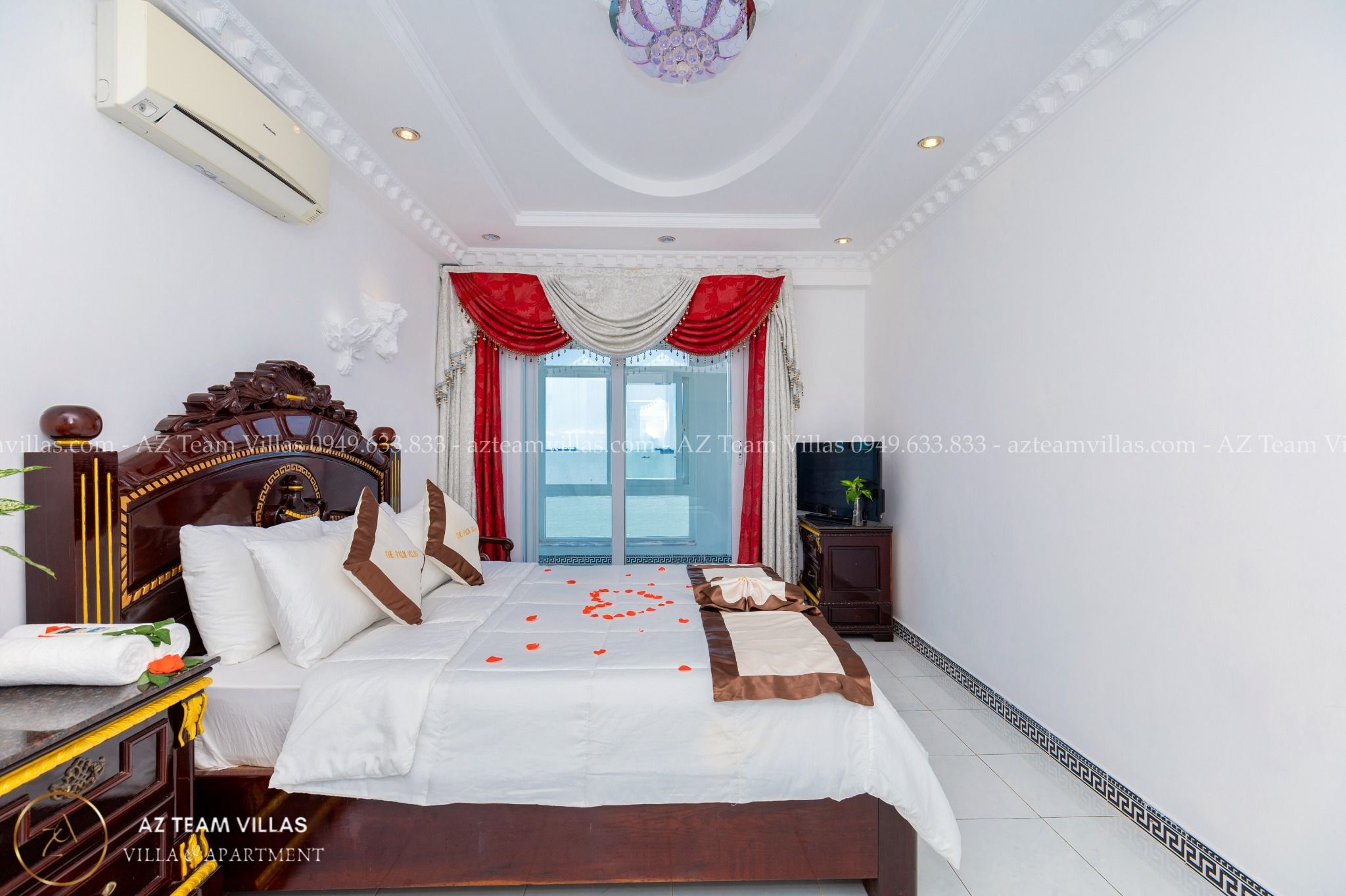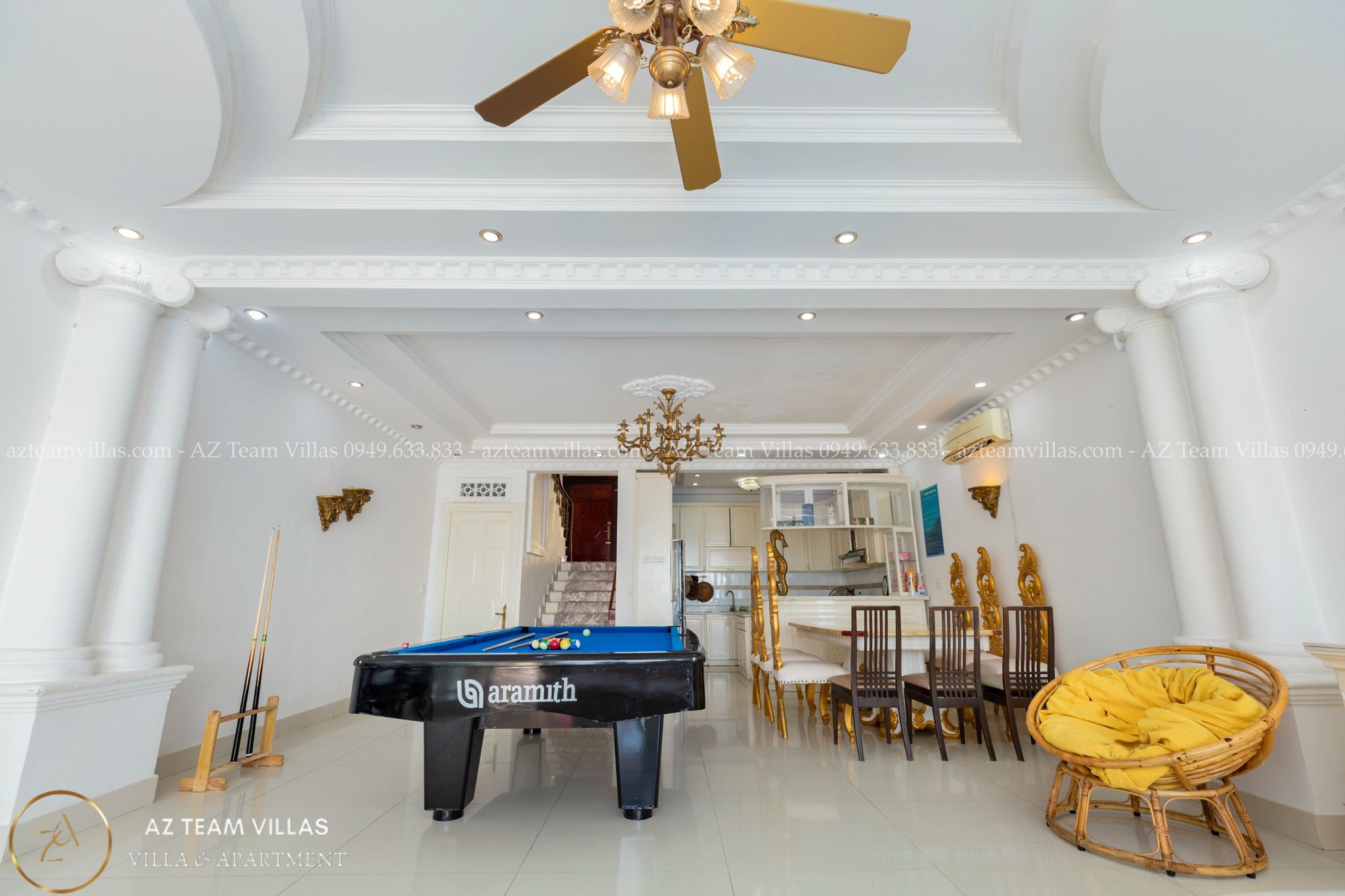Là một Villa sang trọng và hiện đại, nằm ngay sát bãi biển Bãi Dâu, Vũng Tàu. Biệt thự có diện tích 300 m2, gồm 5 phòng ngủ, 6 nhà vệ sinh, phòng khách, nhà bếp và sân hiên. Mỗi phòng ngủ đều có giường đôi cực lớn, máy lạnh, tivi và phòng tắm riêng. Phòng khách rộng rãi và thoáng mát, có sofa, bàn ăn và cửa sổ lớn nhìn ra hồ bơi và biển. Nhà bếp được trang bị đầy đủ tiện nghi như tủ lạnh, bếp điện, lò vi sóng và máy pha cà phê. Sân hiên là nơi lý tưởng để thư giãn và thưởng thức không khí biển, có ghế đẩu, bàn ghế và máy nướng BBQ. Biệt thự còn có hồ bơi riêng rộng 30 m2, nằm trong khuôn viên xanh mát và yên tĩnh. Từ biệt thự, chỉ cần đi bộ vài bước là đến được bãi biển Bãi Dâu, nơi có cát trắng mịn và nước trong xanh. Đây là sự lựa chọn hoàn hảo cho những ai muốn tận hưởng kỳ nghỉ sang trọng và thoải mái tại Vũng Tàu