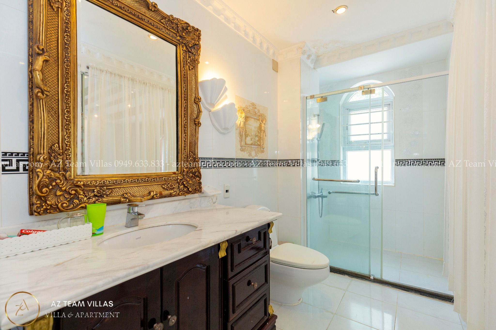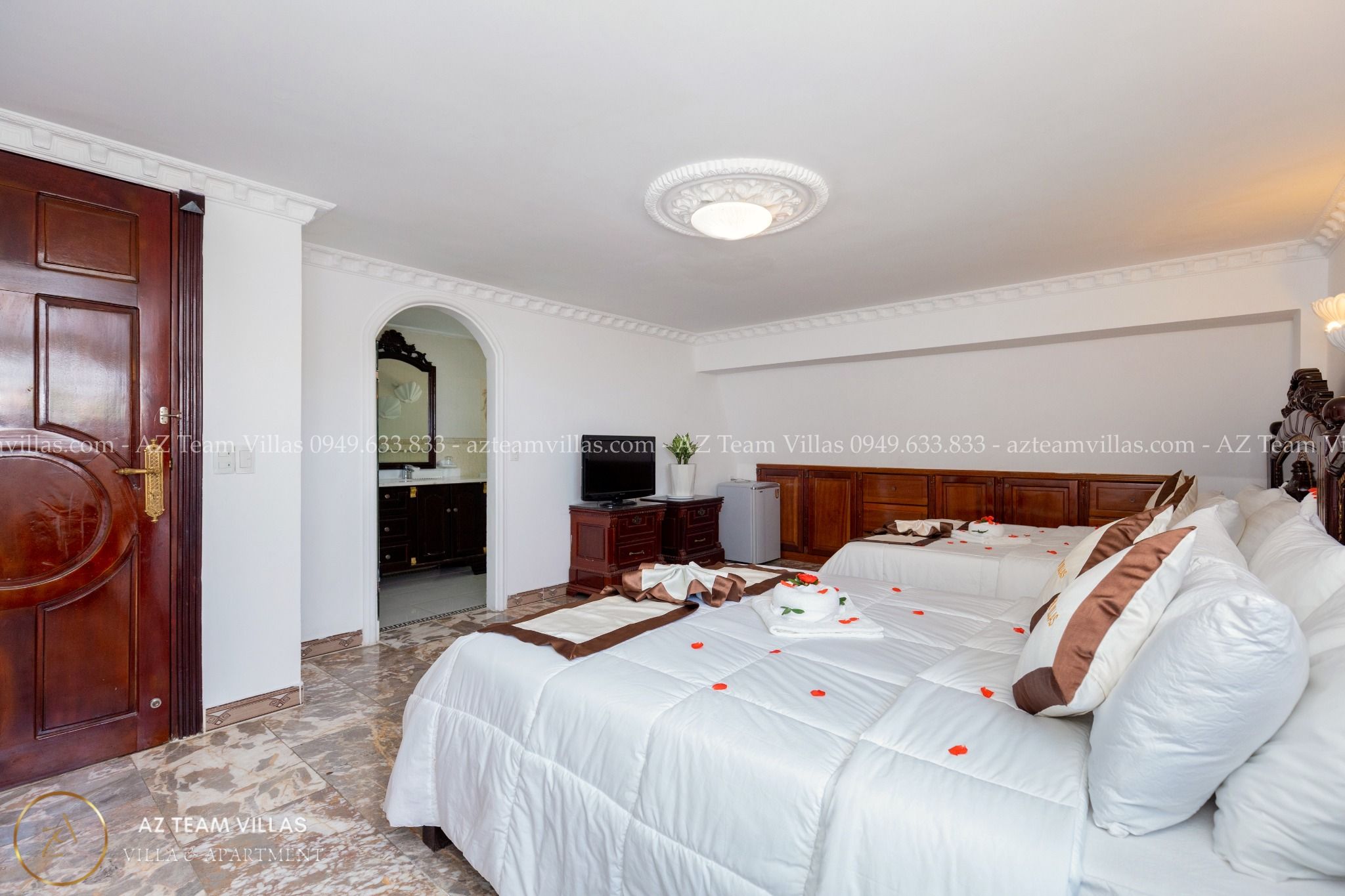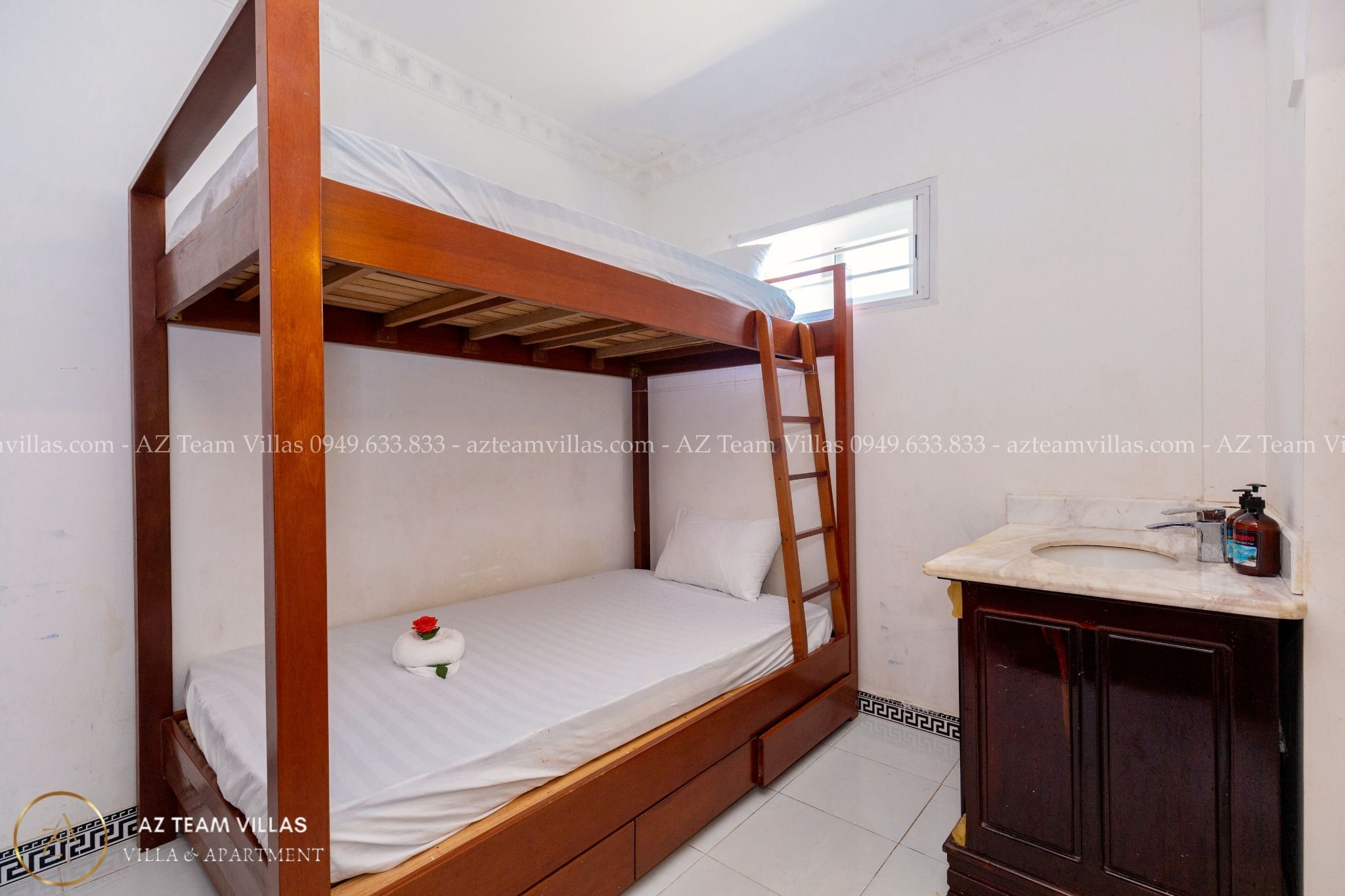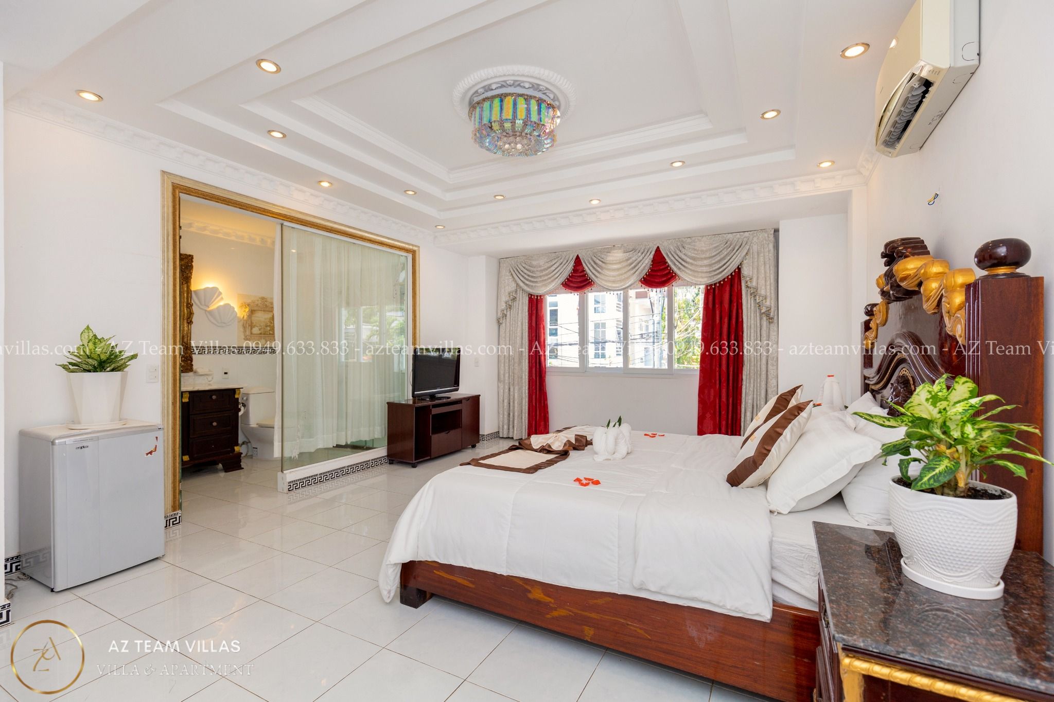 Là một Villa sang trọng và hiện đại, nằm ngay sát bãi biển Bãi Dâu, Vũng Tàu. Biệt thự có diện tích 300 m2, gồm 5 phòng ngủ, 6 nhà vệ sinh, phòng khách, nhà bếp và sân hiên. Mỗi phòng ngủ đều có giường đôi cực lớn, máy lạnh, tivi và phòng tắm riêng. Phòng khách rộng rãi và thoáng mát, có sofa, bàn ăn và cửa sổ lớn nhìn ra hồ bơi và biển. Nhà bếp được trang bị đầy đủ tiện nghi như tủ lạnh, bếp điện, lò vi sóng và máy pha cà phê. Sân hiên là nơi lý tưởng để thư giãn và thưởng thức không khí biển, có ghế đẩu, bàn ghế và máy nướng BBQ. Biệt thự còn có hồ bơi riêng rộng 30 m2, nằm trong khuôn viên xanh mát và yên tĩnh. Từ biệt thự, chỉ cần đi bộ vài bước là đến được bãi biển Bãi Dâu, nơi có cát trắng mịn và nước trong xanh. Đây là sự lựa chọn hoàn hảo cho những ai muốn tận hưởng kỳ nghỉ sang trọng và thoải mái tại Vũng Tàu