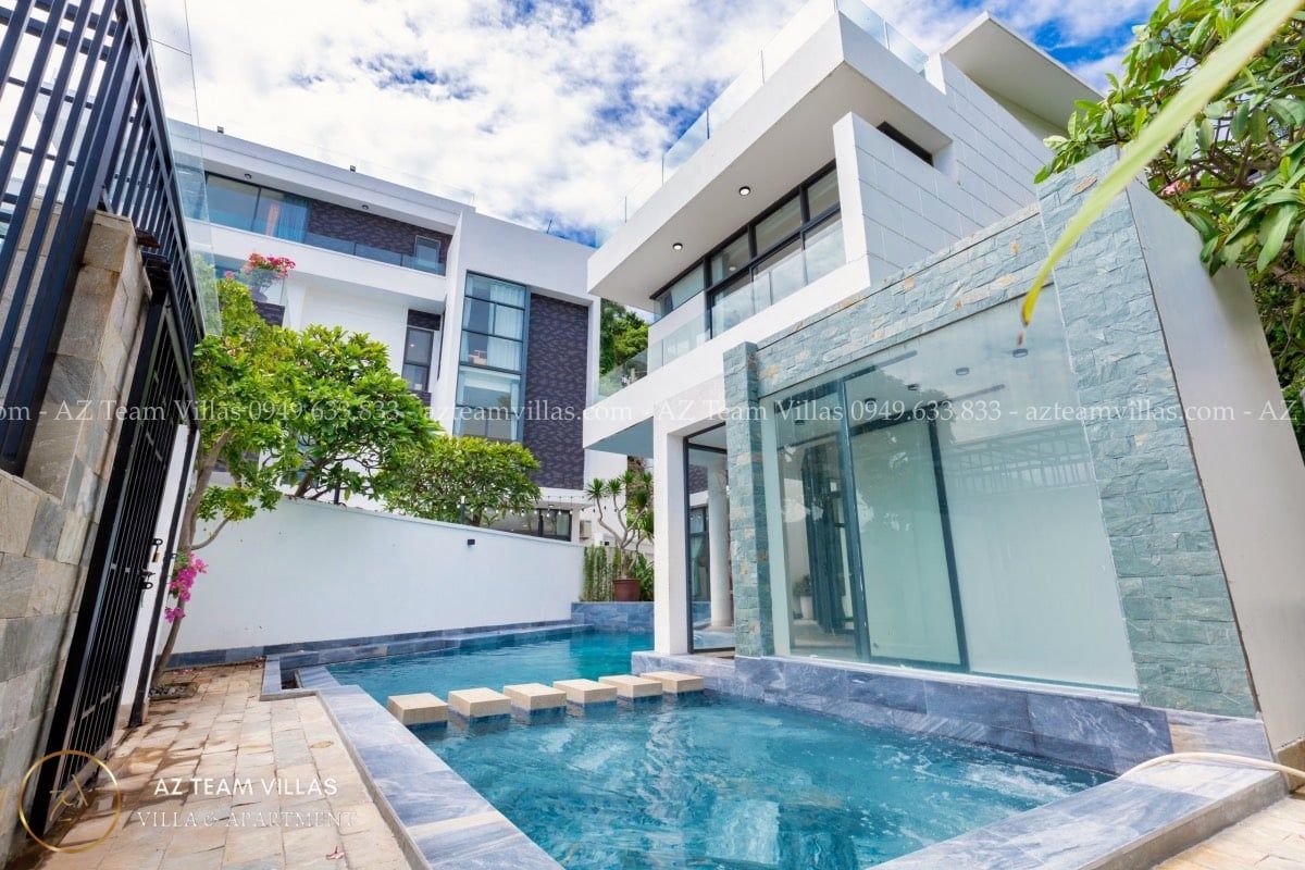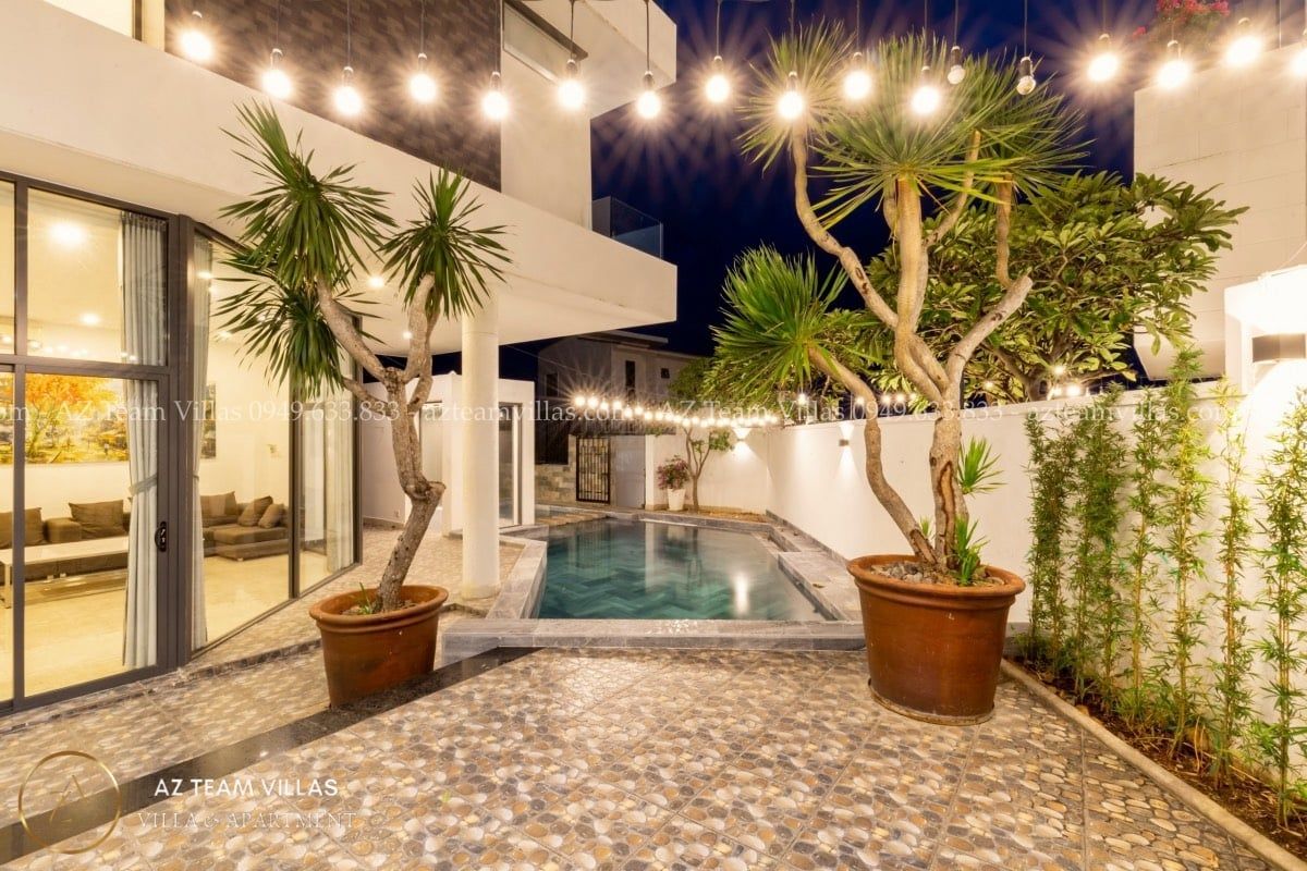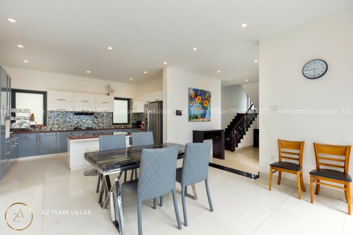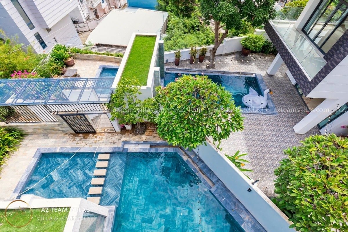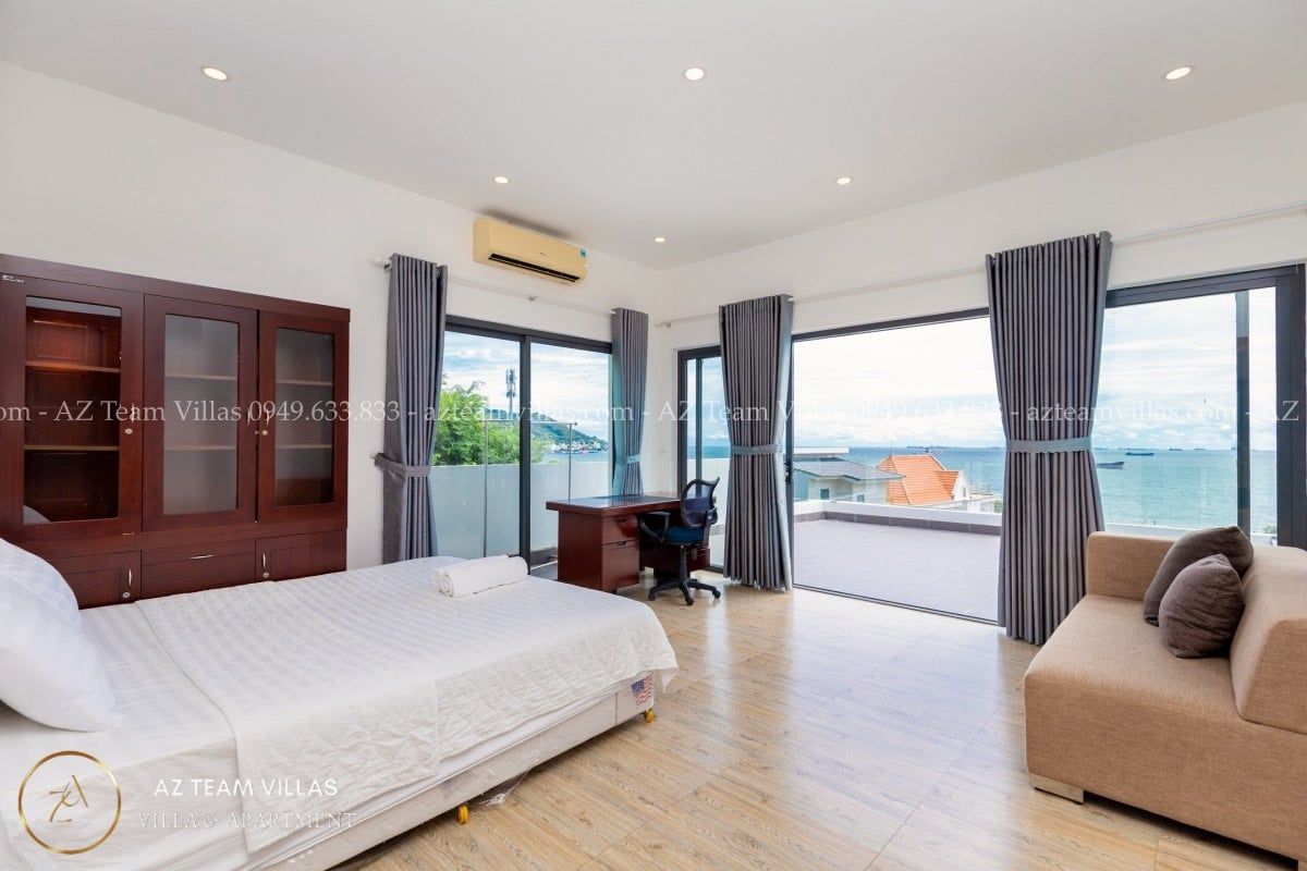 Là một Villa sang trọng và hiện đại, nằm ngay sát bãi biển Bãi Dâu, Vũng Tàu. Biệt thự có diện tích 300 m2, gồm 5 phòng ngủ, 6 nhà vệ sinh, phòng khách, nhà bếp và sân hiên. Mỗi phòng ngủ đều có giường đôi cực lớn, máy lạnh, tivi và phòng tắm riêng. Phòng khách rộng rãi và thoáng mát, có sofa, bàn ăn và cửa sổ lớn nhìn ra hồ bơi và biển. Nhà bếp được trang bị đầy đủ tiện nghi như tủ lạnh, bếp điện, lò vi sóng và máy pha cà phê. Sân hiên là nơi lý tưởng để thư giãn và thưởng thức không khí biển, có ghế đẩu, bàn ghế và máy nướng BBQ. Biệt thự còn có hồ bơi riêng rộng 30 m2, nằm trong khuôn viên xanh mát và yên tĩnh. Từ biệt thự, chỉ cần đi bộ vài bước là đến được bãi biển Bãi Dâu, nơi có cát trắng mịn và nước trong xanh. Đây là sự lựa chọn hoàn hảo cho những ai muốn tận hưởng kỳ nghỉ sang trọng và thoải mái tại Vũng Tàu