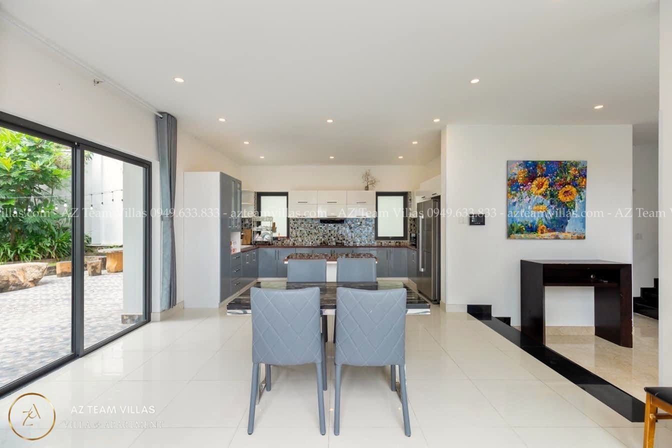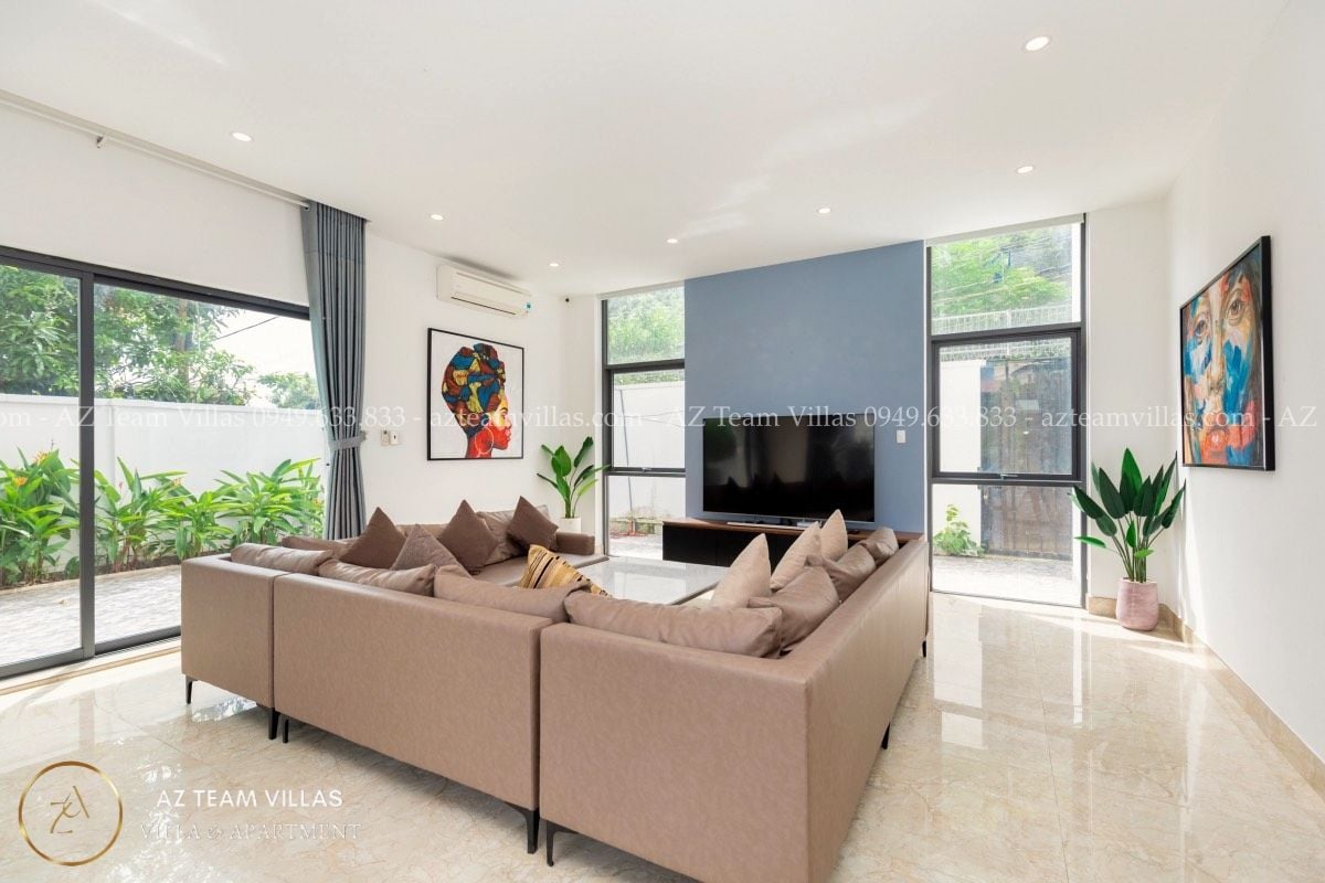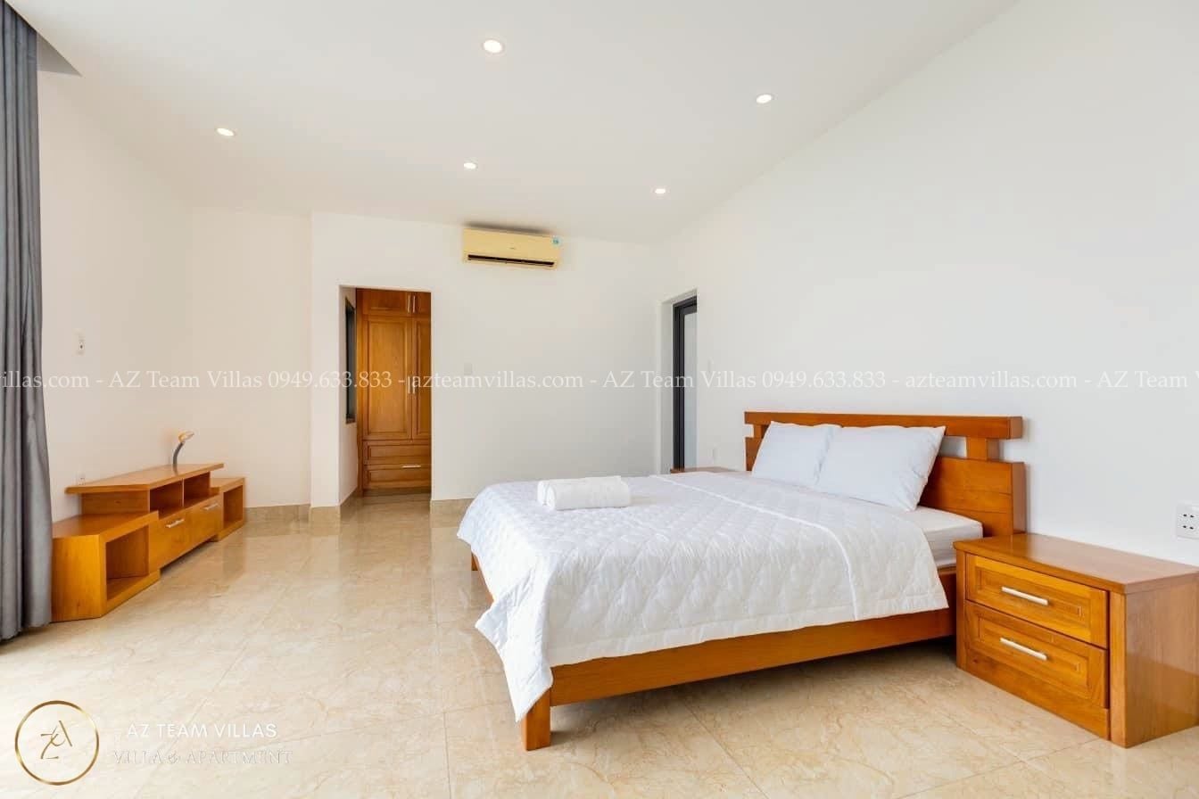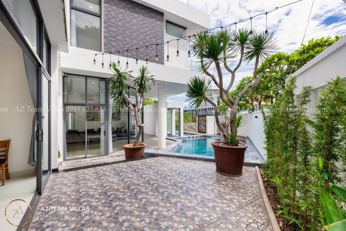 Là một Villa sang trọng và hiện đại, nằm ngay sát bãi biển Bãi Dâu, Vũng Tàu. Biệt thự có diện tích 300 m2, gồm 5 phòng ngủ, 6 nhà vệ sinh, phòng khách, nhà bếp và sân hiên. Mỗi phòng ngủ đều có giường đôi cực lớn, máy lạnh, tivi và phòng tắm riêng. Phòng khách rộng rãi và thoáng mát, có sofa, bàn ăn và cửa sổ lớn nhìn ra hồ bơi và biển. Nhà bếp được trang bị đầy đủ tiện nghi như tủ lạnh, bếp điện, lò vi sóng và máy pha cà phê. Sân hiên là nơi lý tưởng để thư giãn và thưởng thức không khí biển, có ghế đẩu, bàn ghế và máy nướng BBQ. Biệt thự còn có hồ bơi riêng rộng 30 m2, nằm trong khuôn viên xanh mát và yên tĩnh. Từ biệt thự, chỉ cần đi bộ vài bước là đến được bãi biển Bãi Dâu, nơi có cát trắng mịn và nước trong xanh. Đây là sự lựa chọn hoàn hảo cho những ai muốn tận hưởng kỳ nghỉ sang trọng và thoải mái tại Vũng Tàu