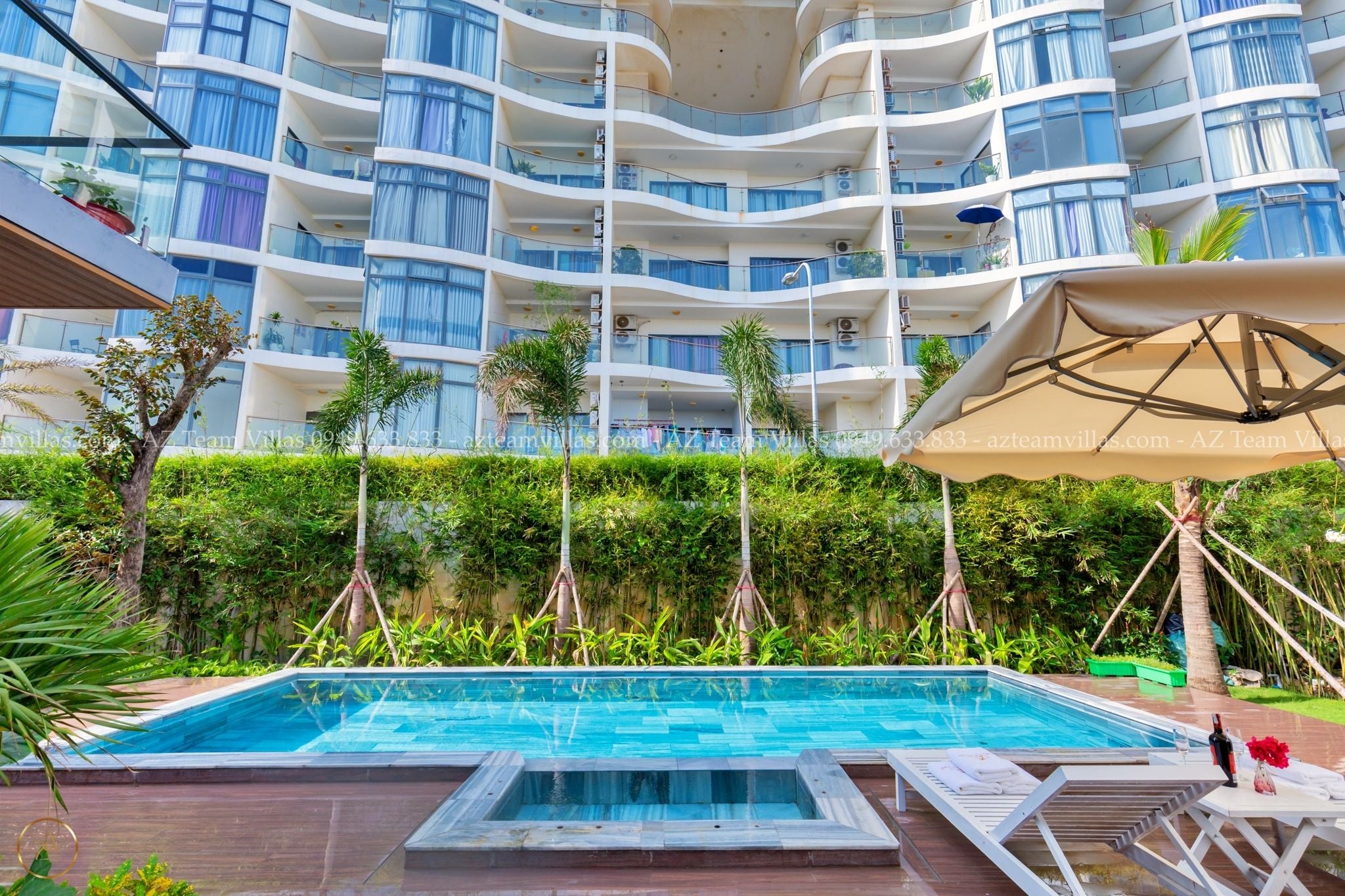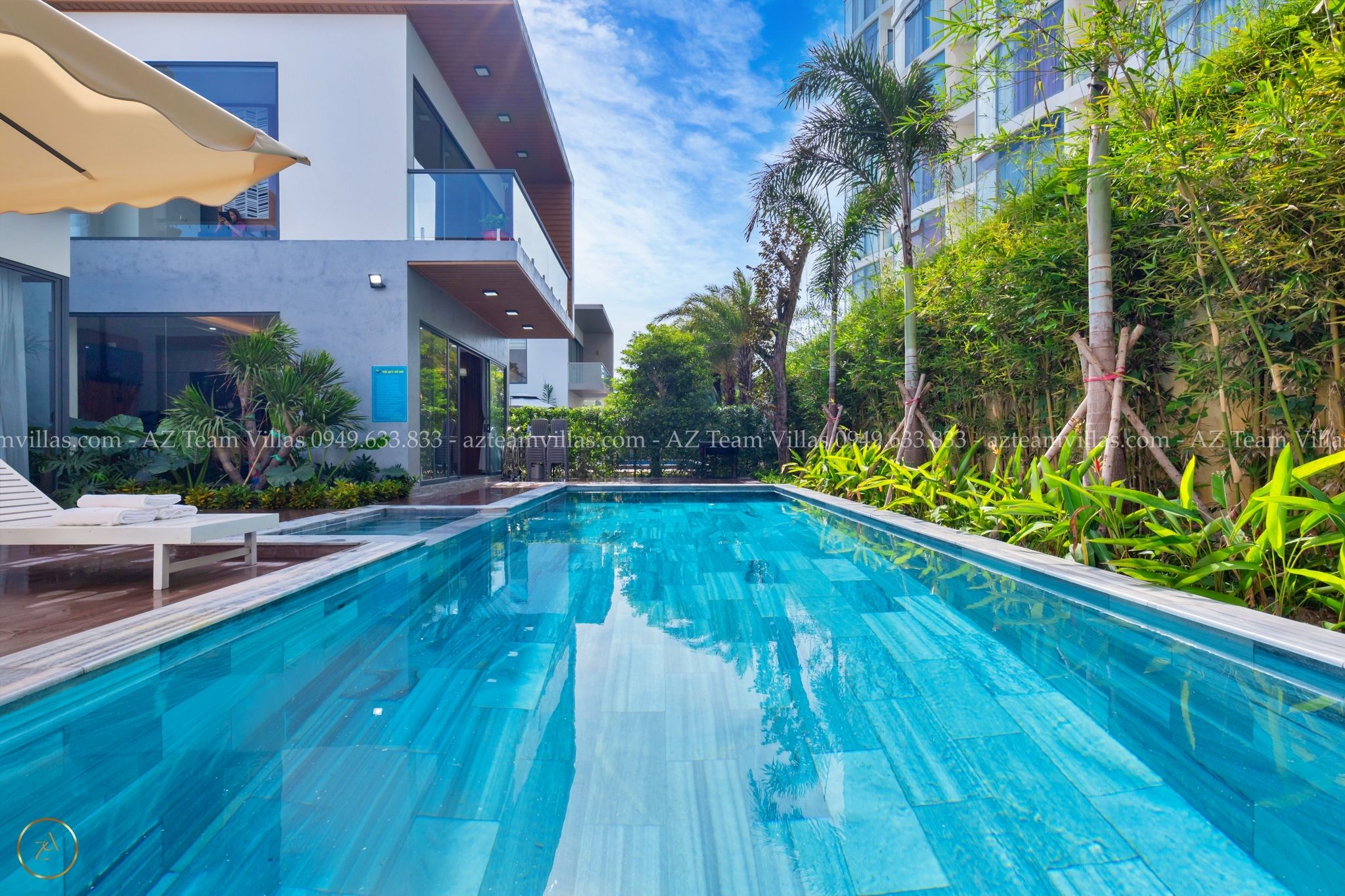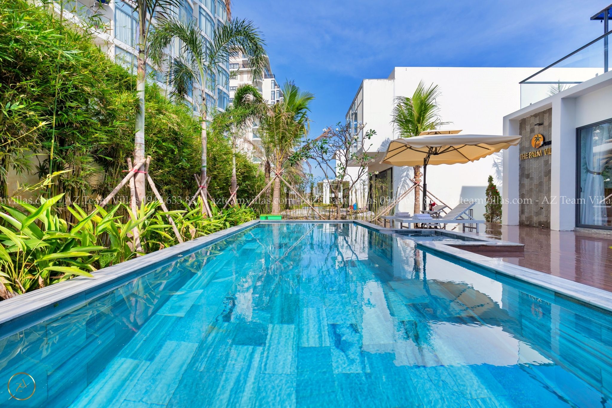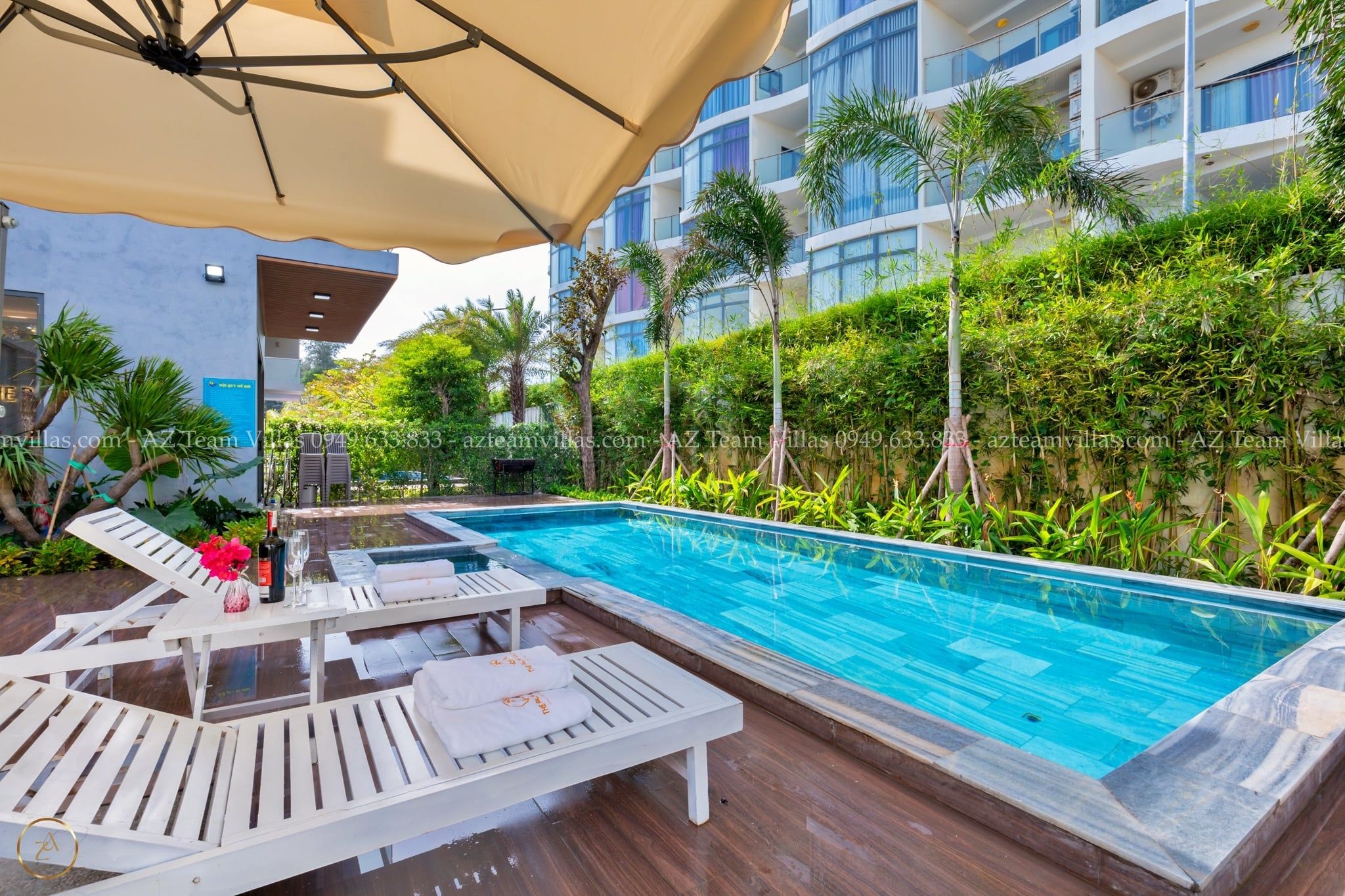 - Hồ bơi 40 m2 có ghế tắm nắng, dù che cỡ lớn