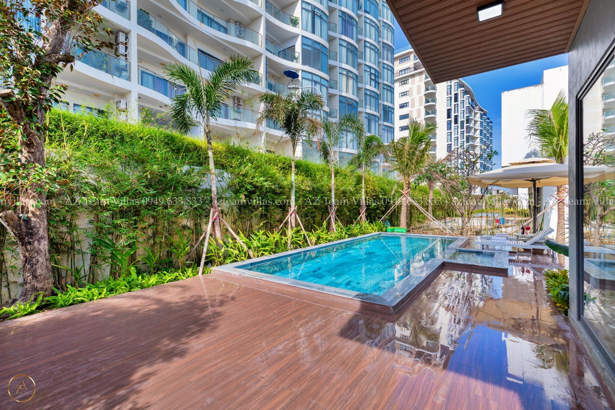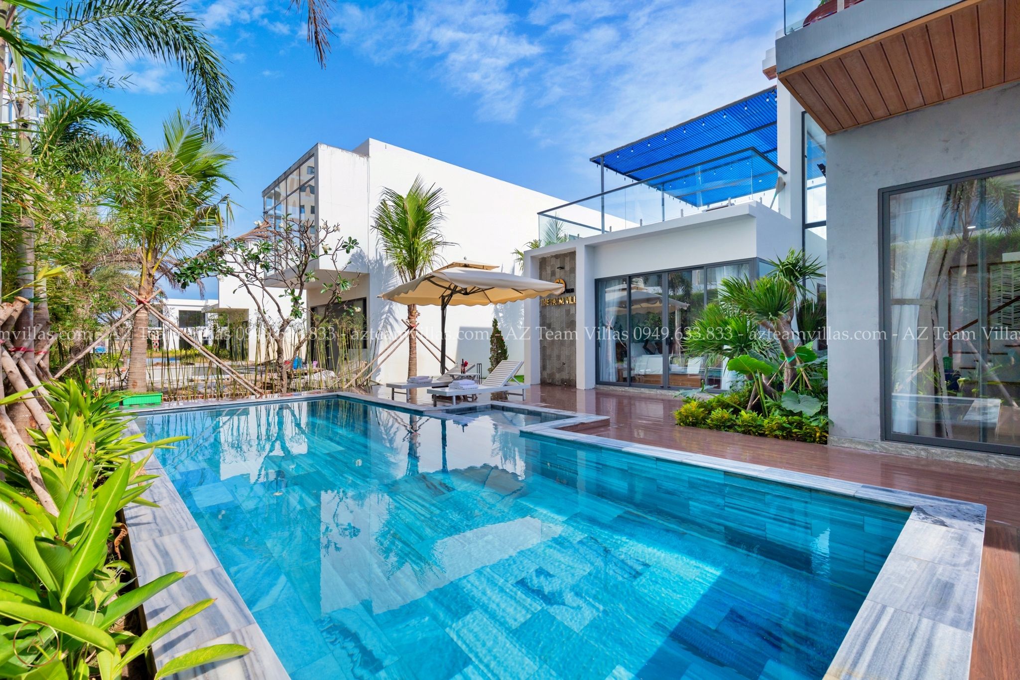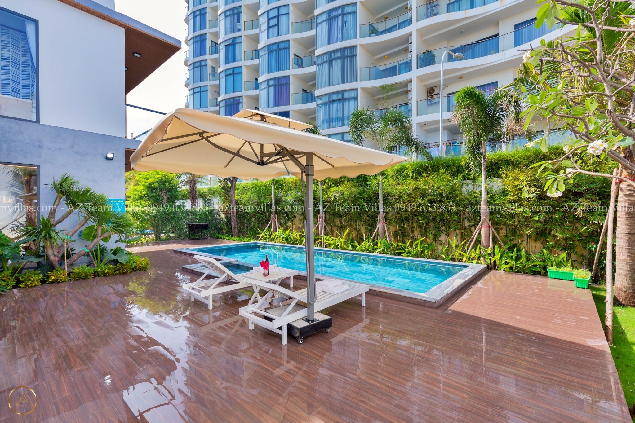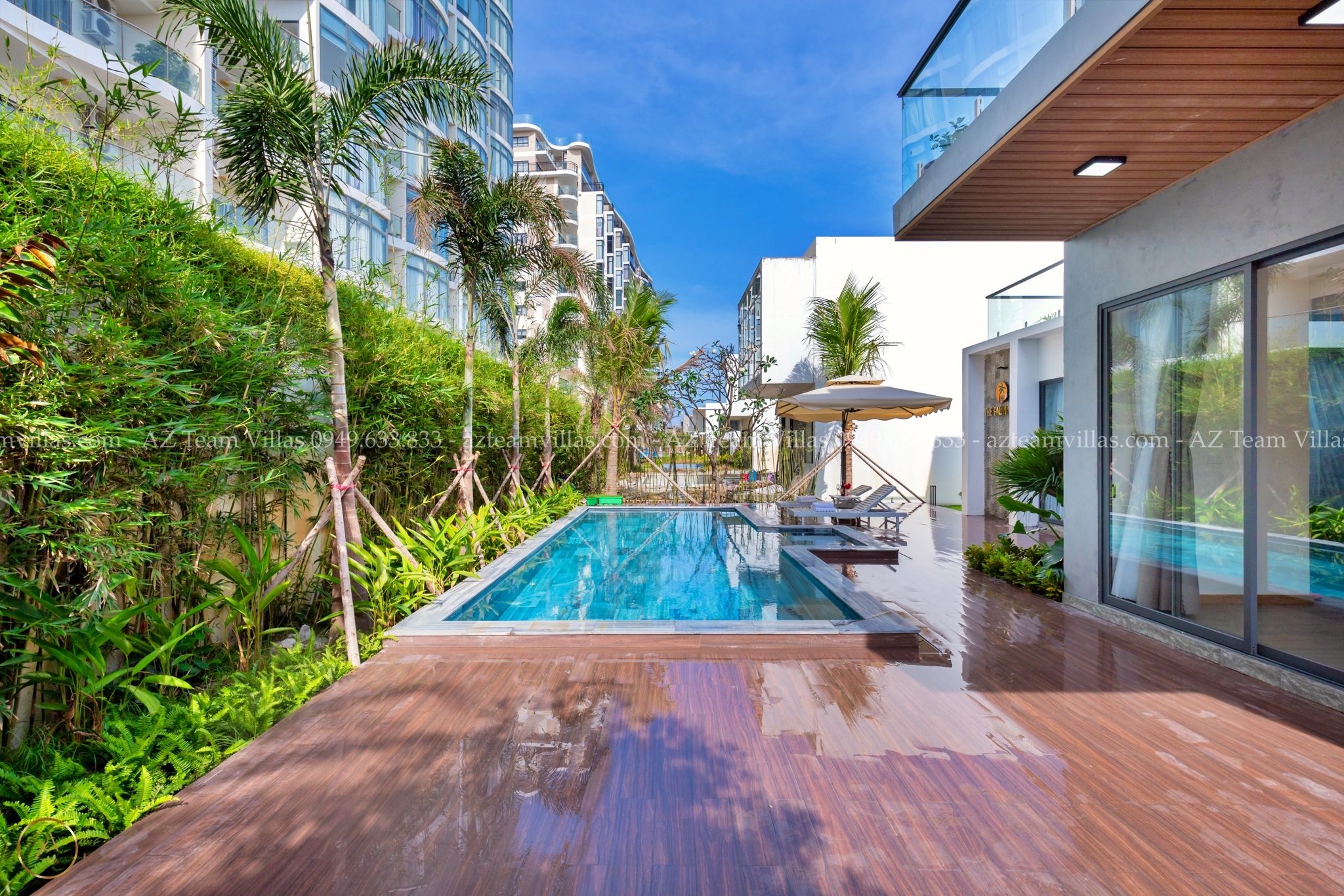 - Hồ bơi 40 m2 có ghế tắm nắng, dù che cỡ lớn