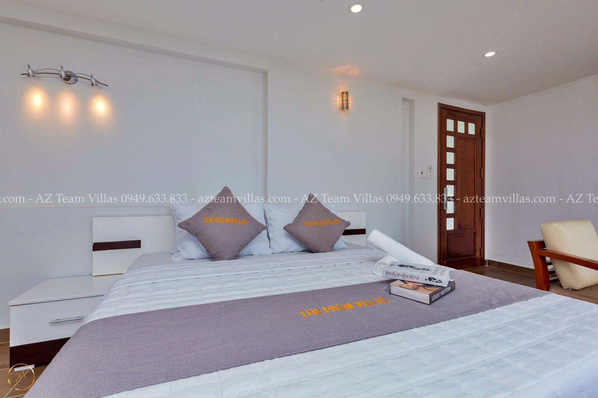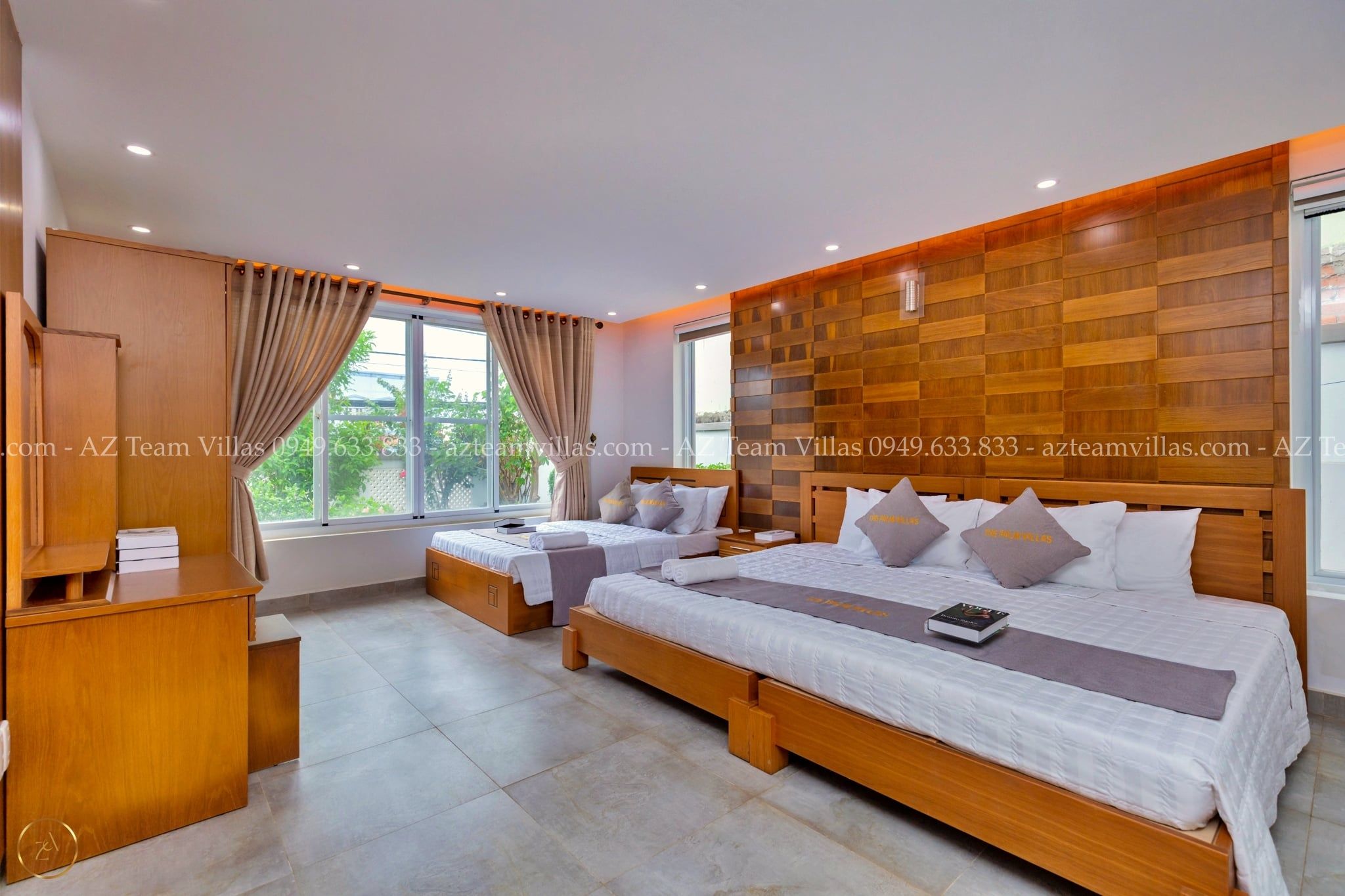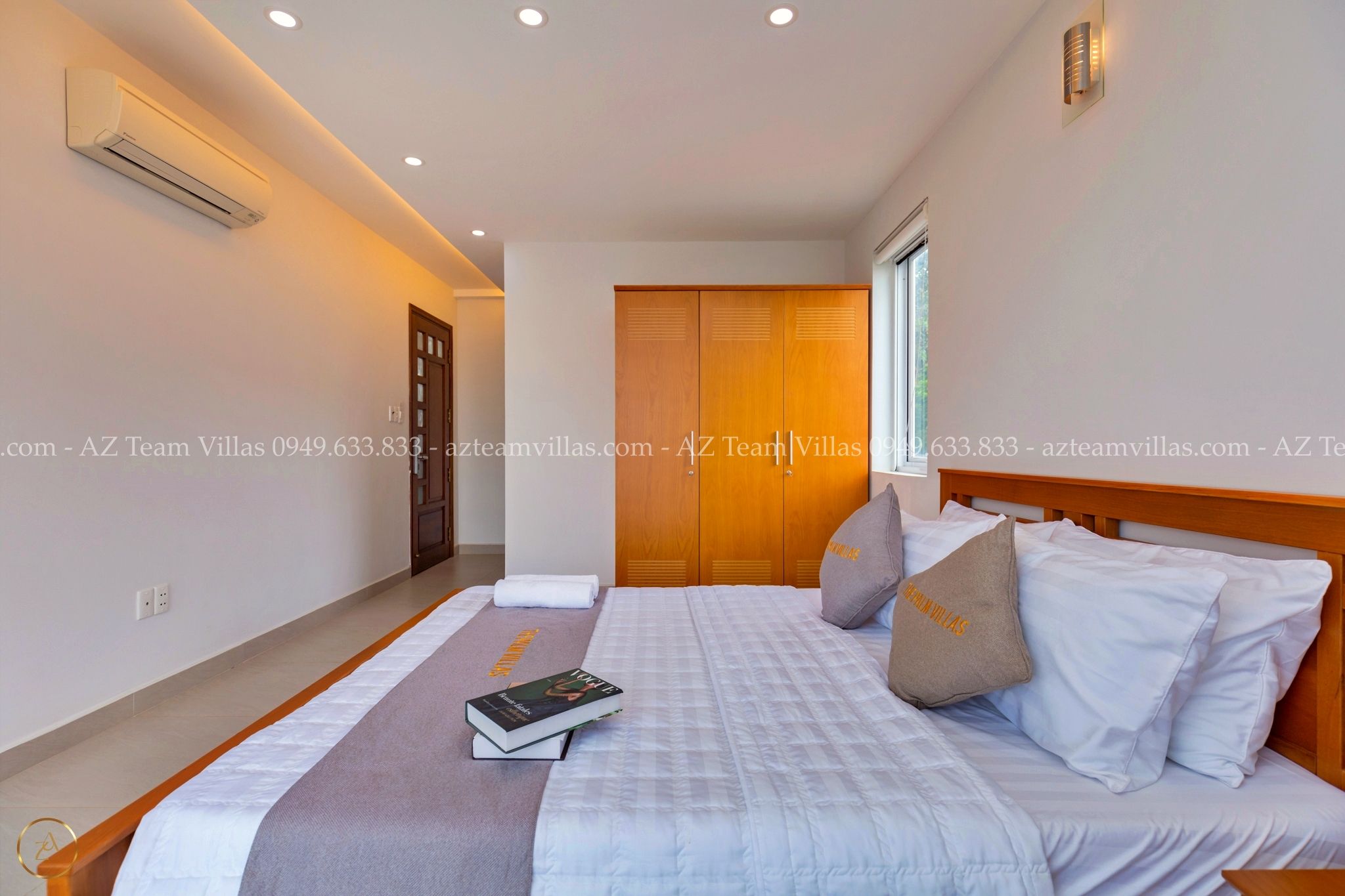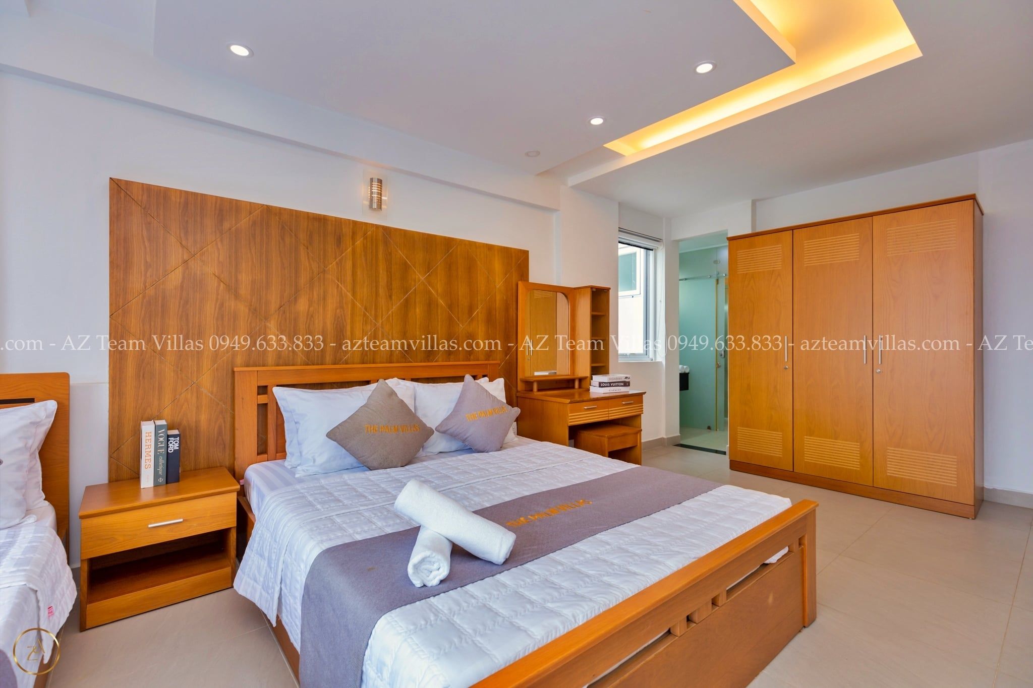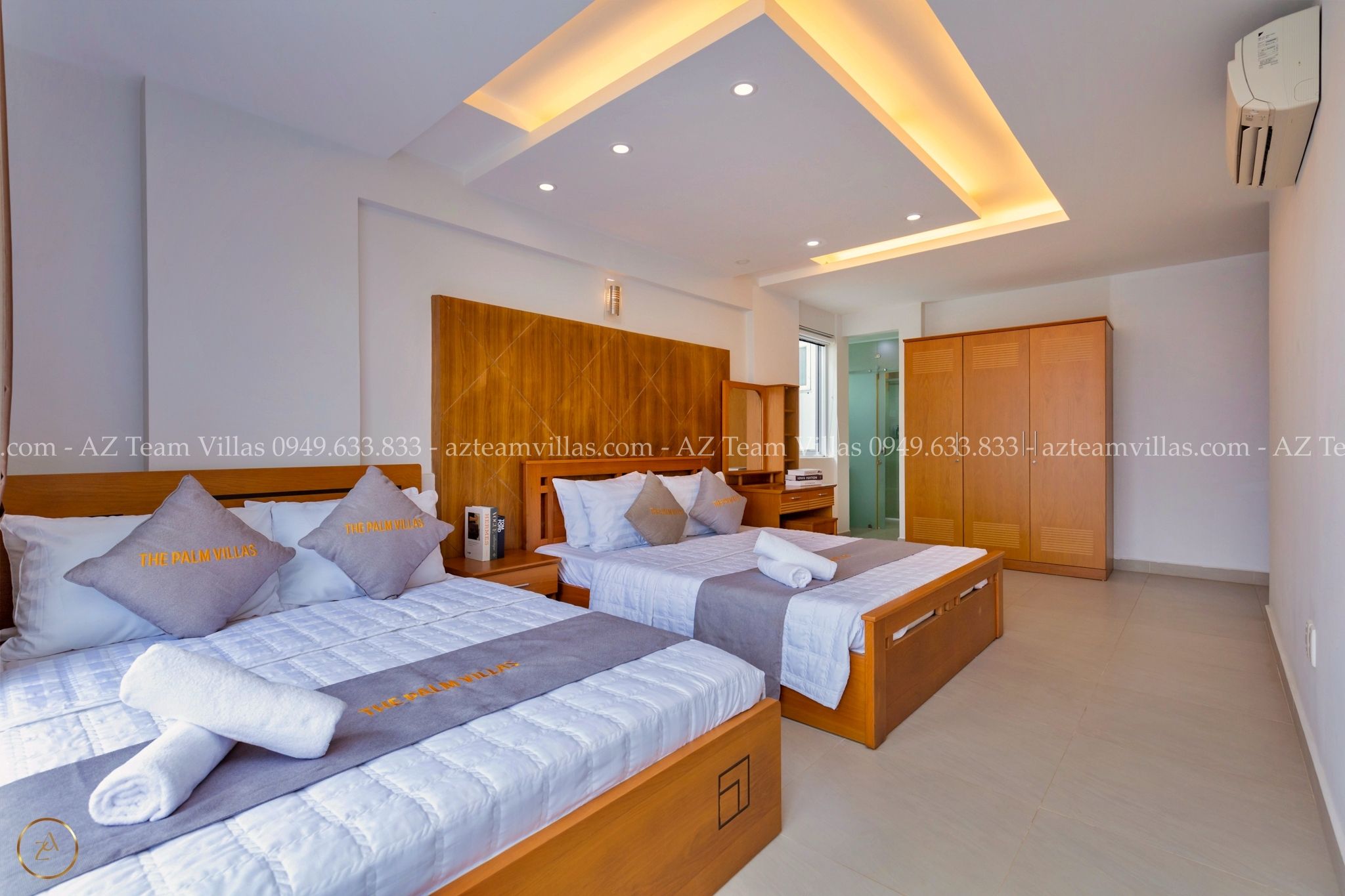Là một biệt thự sang trọng và hiện đại, nằm ngay sát bãi biển Bãi Dâu, Vũng Tàu. Biệt thự có diện tích 450 m2, gồm 5 phòng ngủ, 6 nhà vệ sinh, phòng khách, nhà bếp và sân hiên. Mỗi phòng ngủ đều có giường đôi cực lớn, máy lạnh, tivi và phòng tắm riêng. Phòng khách rộng rãi và thoáng mát, có sofa, bàn ăn và cửa sổ lớn nhìn ra hồ bơi và biển. Nhà bếp được trang bị đầy đủ tiện nghi như tủ lạnh, bếp điện, lò vi sóng và máy pha cà phê. Sân hiên là nơi lý tưởng để thư giãn và thưởng thức không khí biển, có ghế đẩu, bàn ghế và máy nướng BBQ. Biệt thự còn có hồ bơi riêng rộng 50 m2, nằm trong khuôn viên xanh mát và yên tĩnh. Từ biệt thự, chỉ cần đi bộ vài bước là đến được bãi biển Bãi Dâu, nơi có cát trắng mịn và nước trong xanh. Đây là sự lựa chọn hoàn hảo cho những ai muốn tận hưởng kỳ nghỉ sang trọng và thoải mái tại Vũng Tàu.