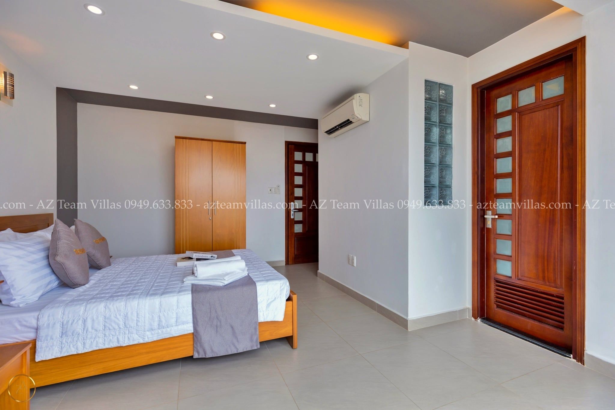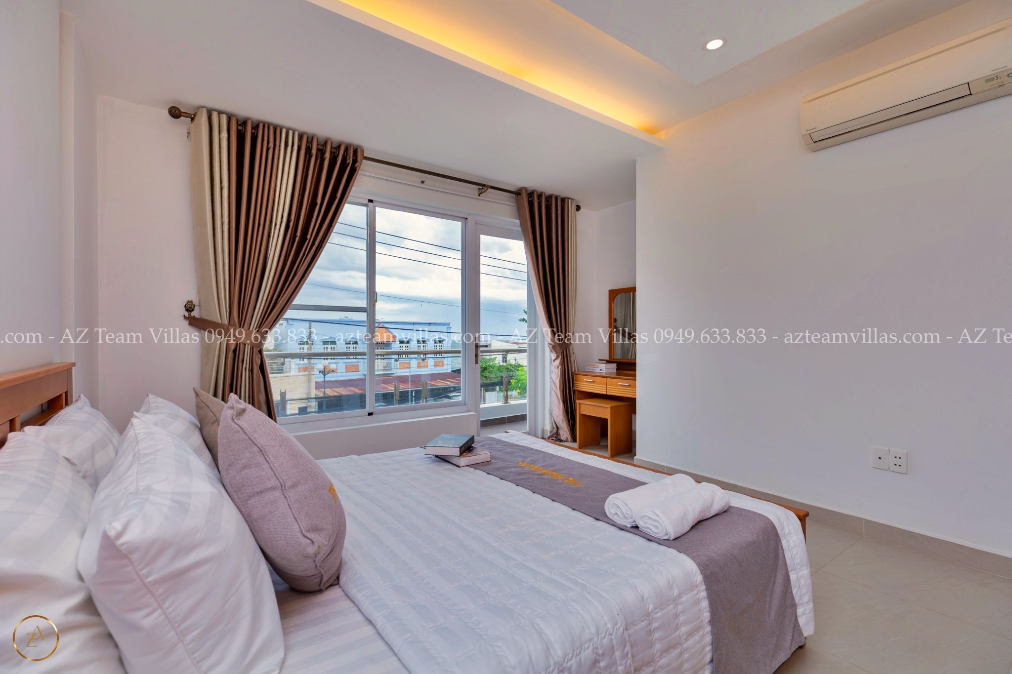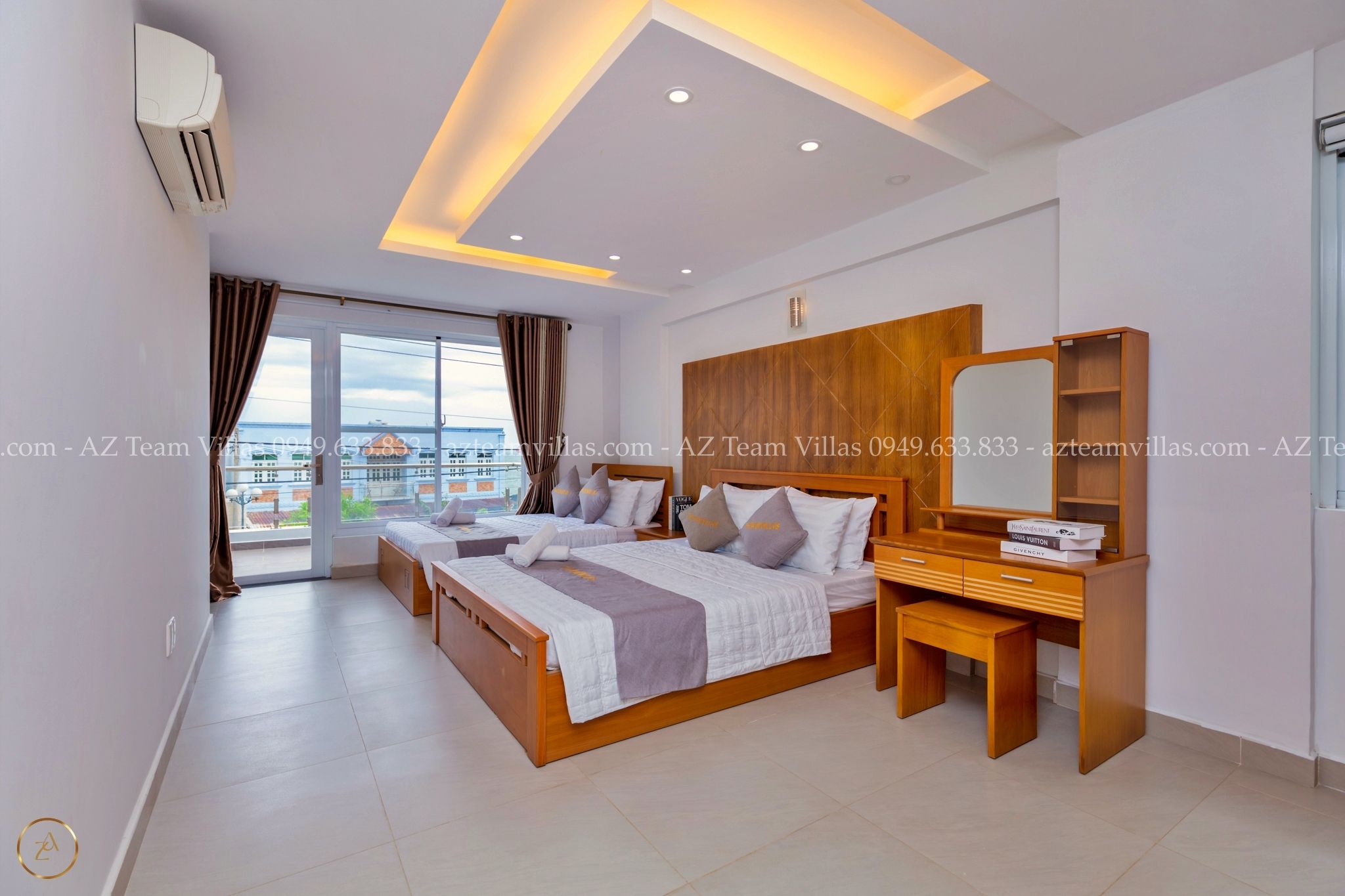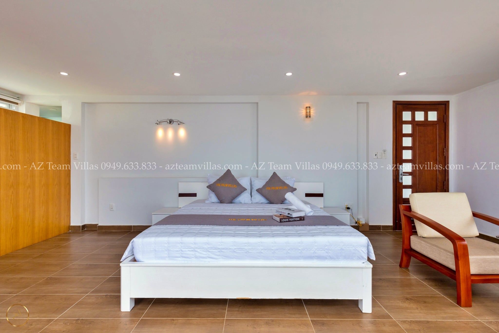 Là một biệt thự sang trọng và hiện đại, nằm ngay sát bãi biển Bãi Dâu, Vũng Tàu. Biệt thự có diện tích 450 m2, gồm 5 phòng ngủ, 6 nhà vệ sinh, phòng khách, nhà bếp và sân hiên. Mỗi phòng ngủ đều có giường đôi cực lớn, máy lạnh, tivi và phòng tắm riêng. Phòng khách rộng rãi và thoáng mát, có sofa, bàn ăn và cửa sổ lớn nhìn ra hồ bơi và biển. Nhà bếp được trang bị đầy đủ tiện nghi như tủ lạnh, bếp điện, lò vi sóng và máy pha cà phê. Sân hiên là nơi lý tưởng để thư giãn và thưởng thức không khí biển, có ghế đẩu, bàn ghế và máy nướng BBQ. Biệt thự còn có hồ bơi riêng rộng 50 m2, nằm trong khuôn viên xanh mát và yên tĩnh. Từ biệt thự, chỉ cần đi bộ vài bước là đến được bãi biển Bãi Dâu, nơi có cát trắng mịn và nước trong xanh. Đây là sự lựa chọn hoàn hảo cho những ai muốn tận hưởng kỳ nghỉ sang trọng và thoải mái tại Vũng Tàu.