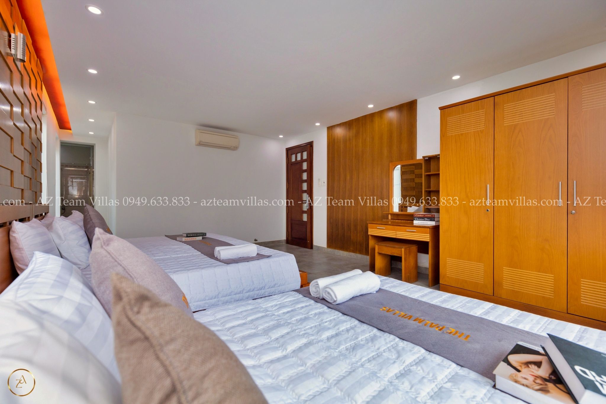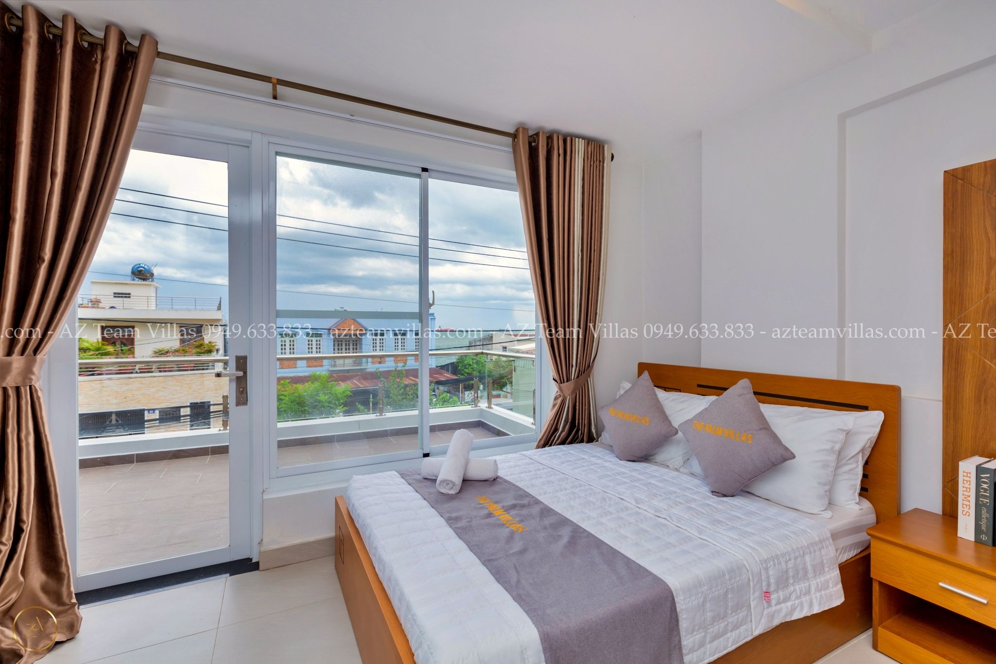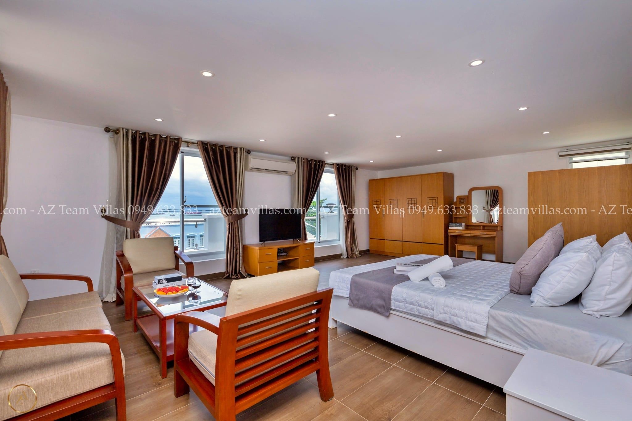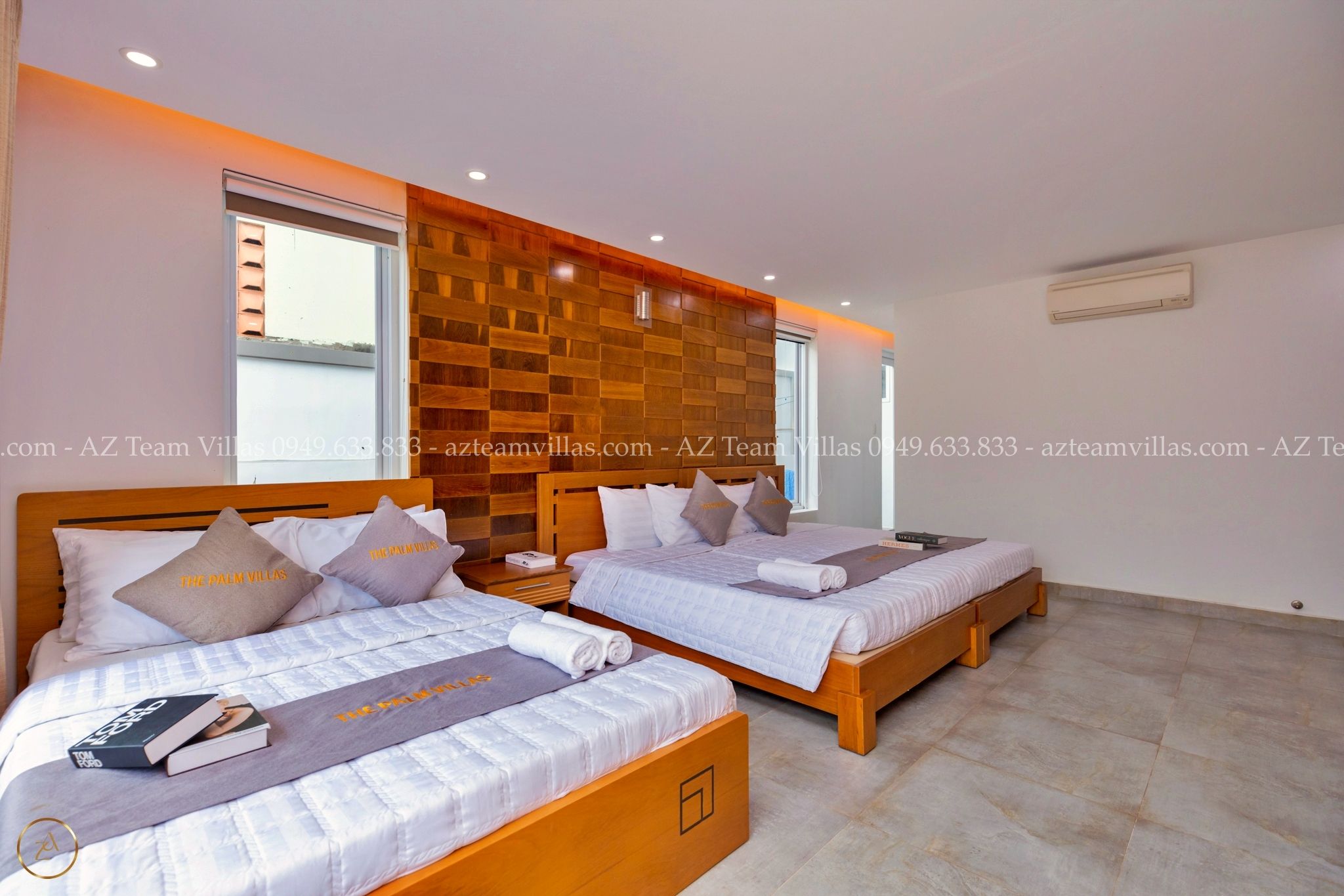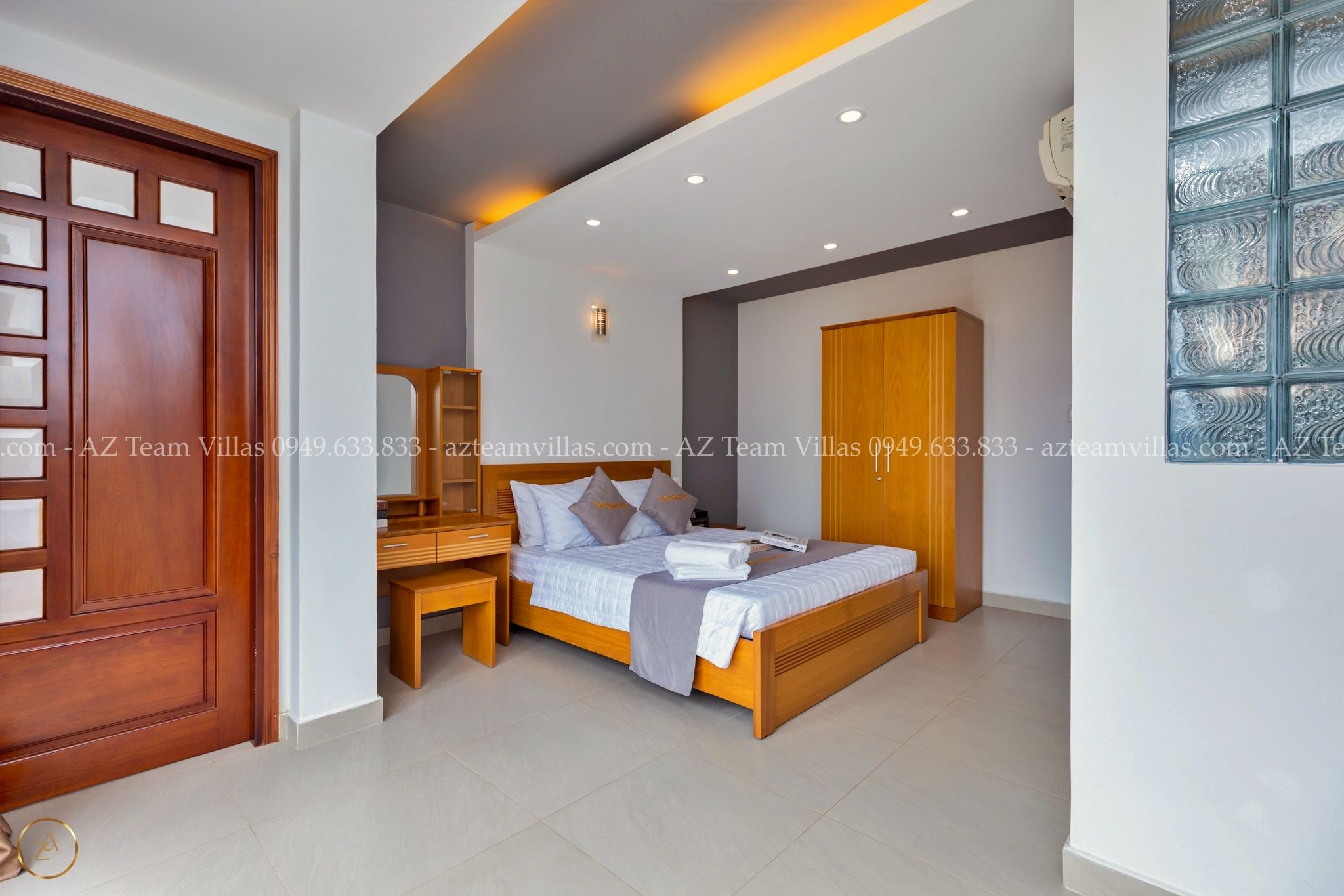 Là một biệt thự sang trọng và hiện đại, nằm ngay sát bãi biển Bãi Dâu, Vũng Tàu. Biệt thự có diện tích 450 m2, gồm 5 phòng ngủ, 6 nhà vệ sinh, phòng khách, nhà bếp và sân hiên. Mỗi phòng ngủ đều có giường đôi cực lớn, máy lạnh, tivi và phòng tắm riêng. Phòng khách rộng rãi và thoáng mát, có sofa, bàn ăn và cửa sổ lớn nhìn ra hồ bơi và biển. Nhà bếp được trang bị đầy đủ tiện nghi như tủ lạnh, bếp điện, lò vi sóng và máy pha cà phê. Sân hiên là nơi lý tưởng để thư giãn và thưởng thức không khí biển, có ghế đẩu, bàn ghế và máy nướng BBQ. Biệt thự còn có hồ bơi riêng rộng 50 m2, nằm trong khuôn viên xanh mát và yên tĩnh. Từ biệt thự, chỉ cần đi bộ vài bước là đến được bãi biển Bãi Dâu, nơi có cát trắng mịn và nước trong xanh. Đây là sự lựa chọn hoàn hảo cho những ai muốn tận hưởng kỳ nghỉ sang trọng và thoải mái tại Vũng Tàu.
