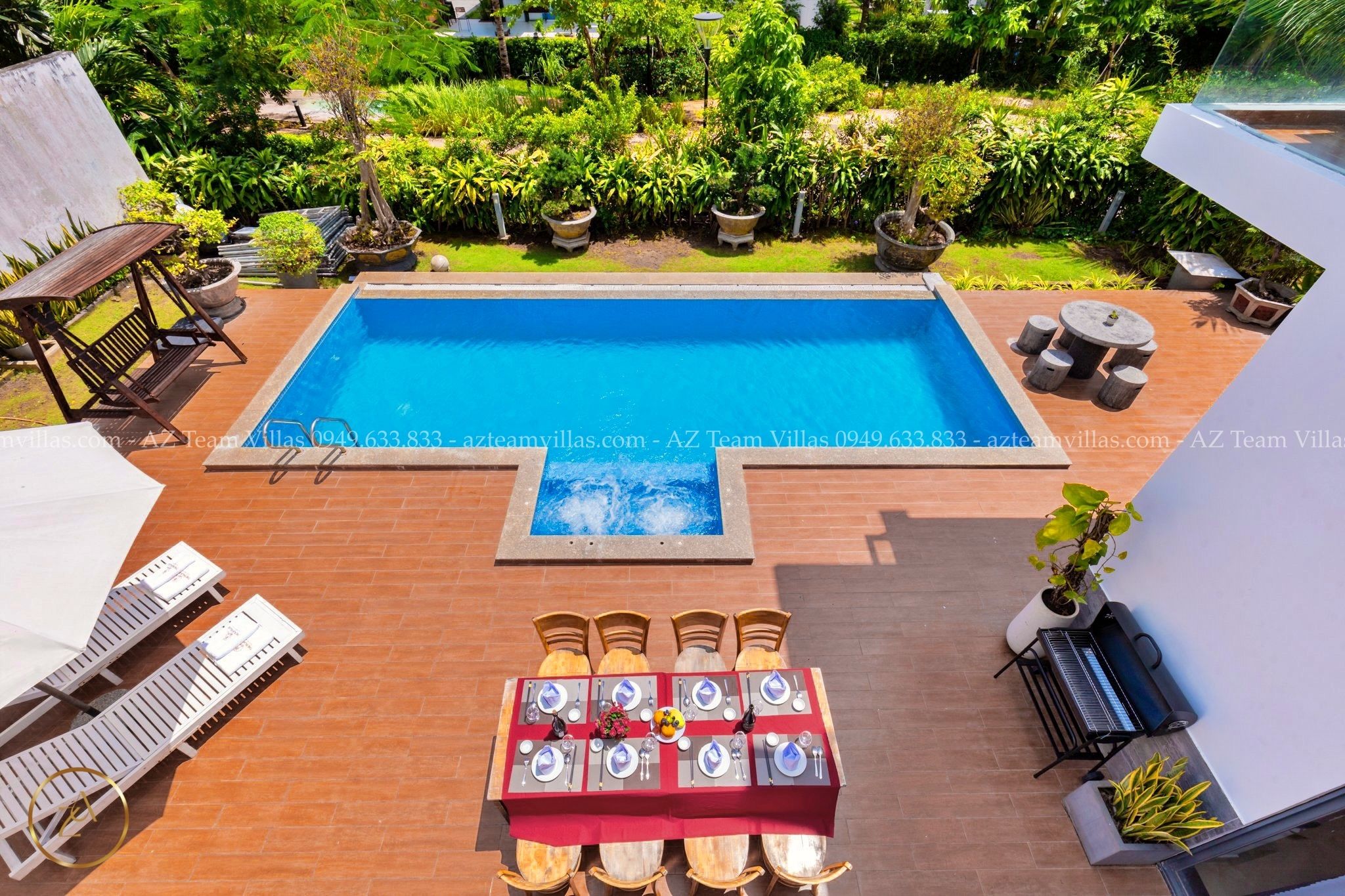 - Hồ bơi 40 m2 có ghế tắm nắng, dù che cỡ lớn
