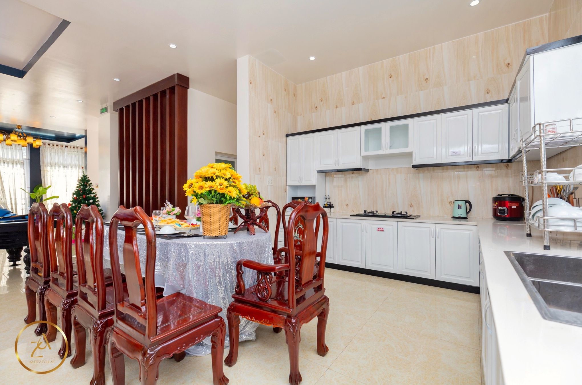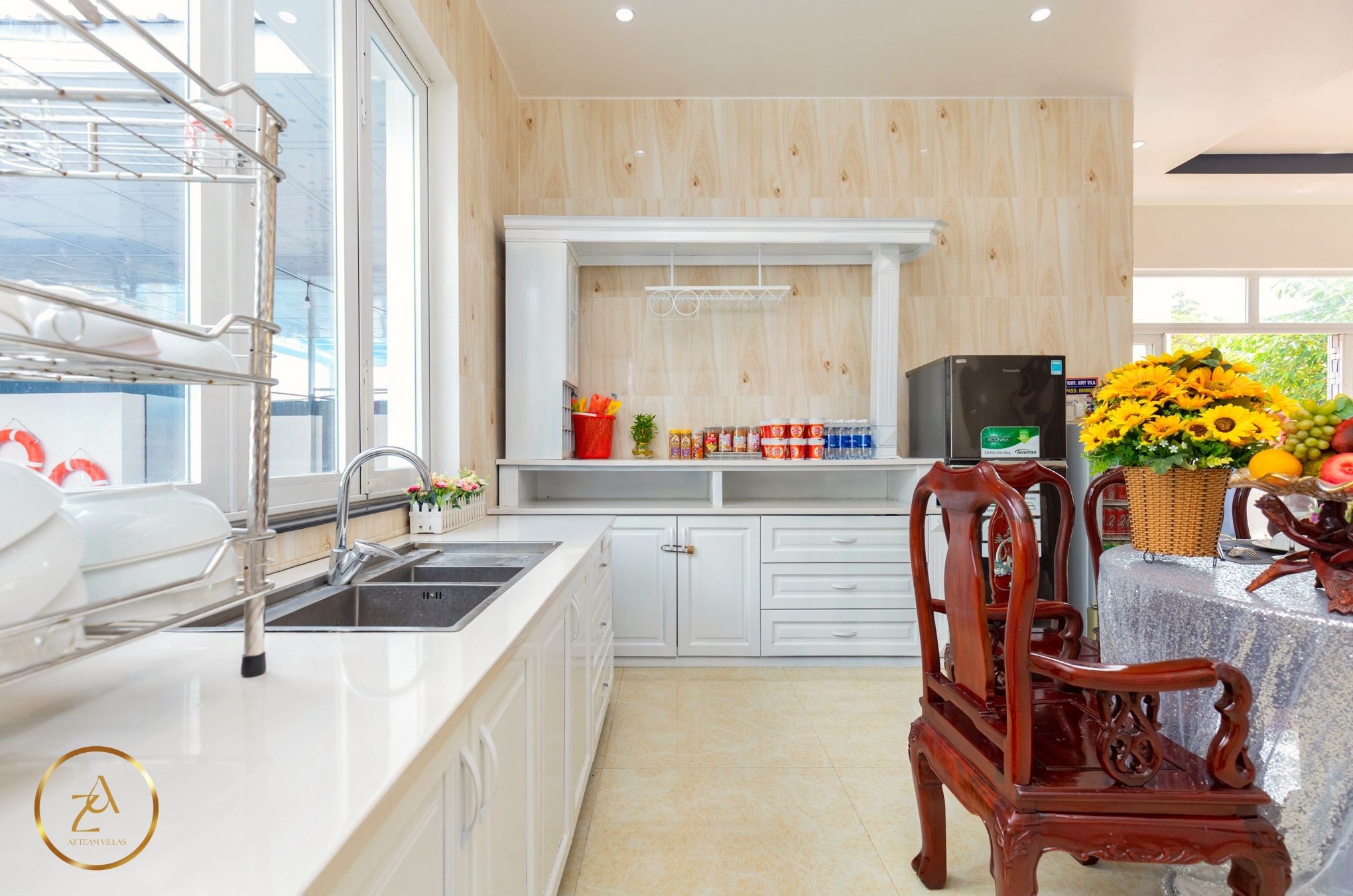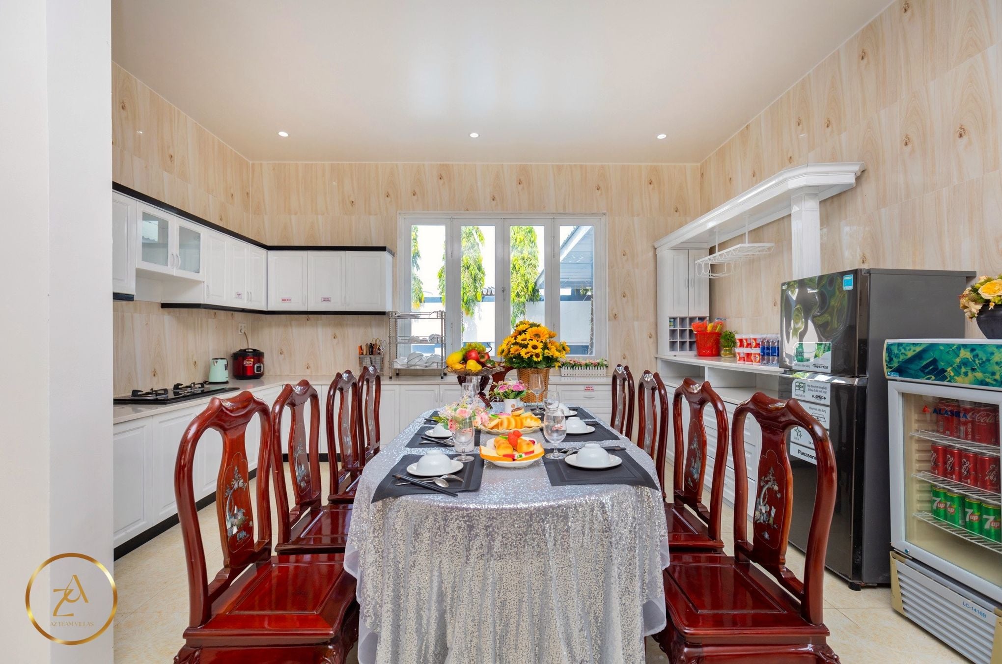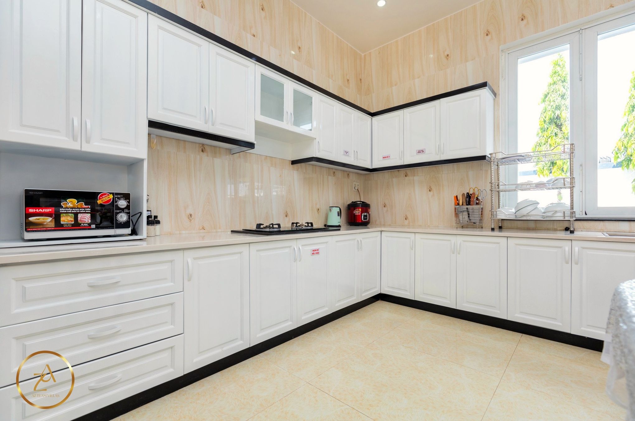 - Bếp cung cấp đầy đủ dụng cụ nấu ăn: lò vi sóng, lò nướng, nồi cơm điện, ấm đun nước điện, tủ lạnh, bát đĩa