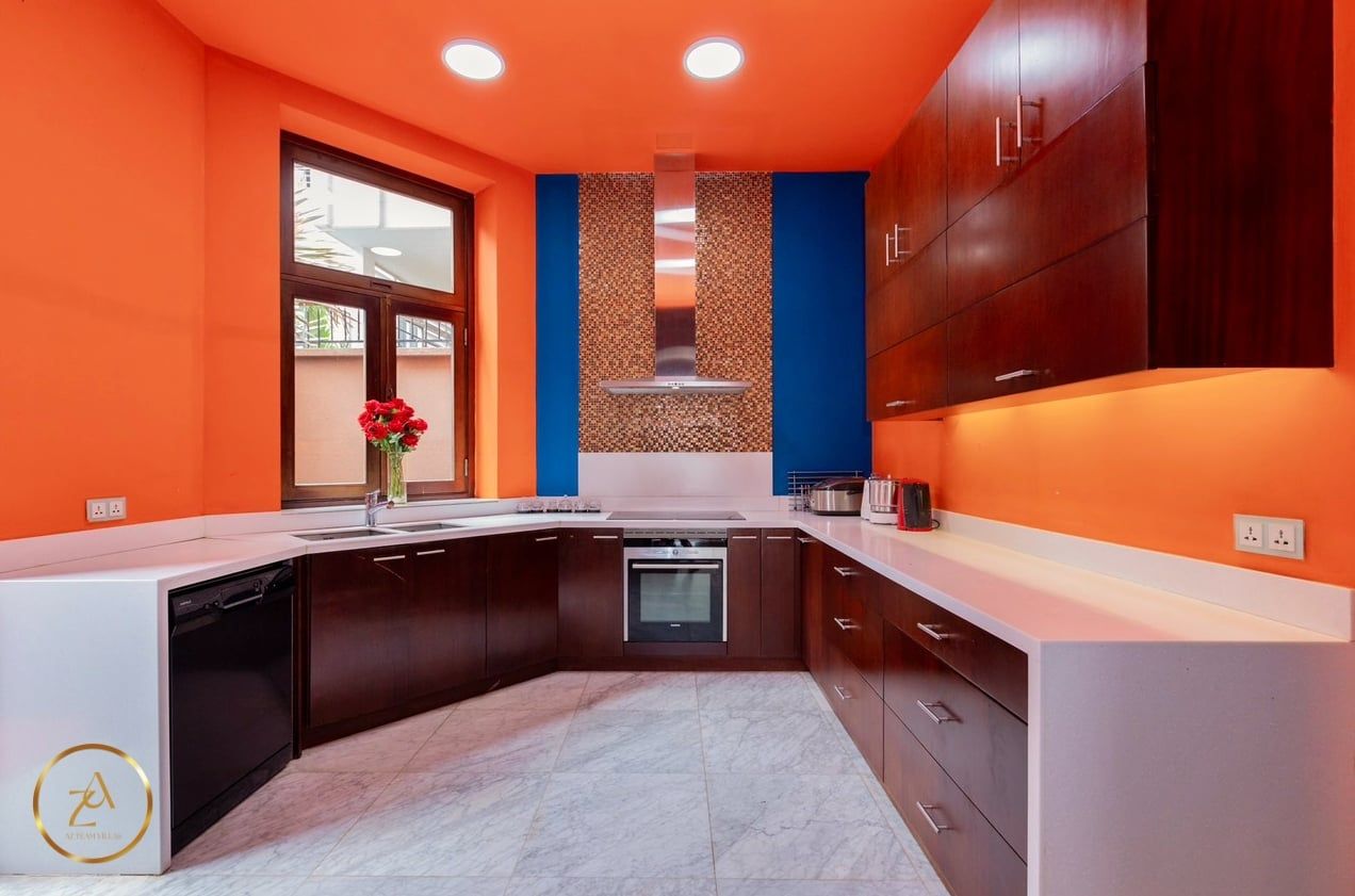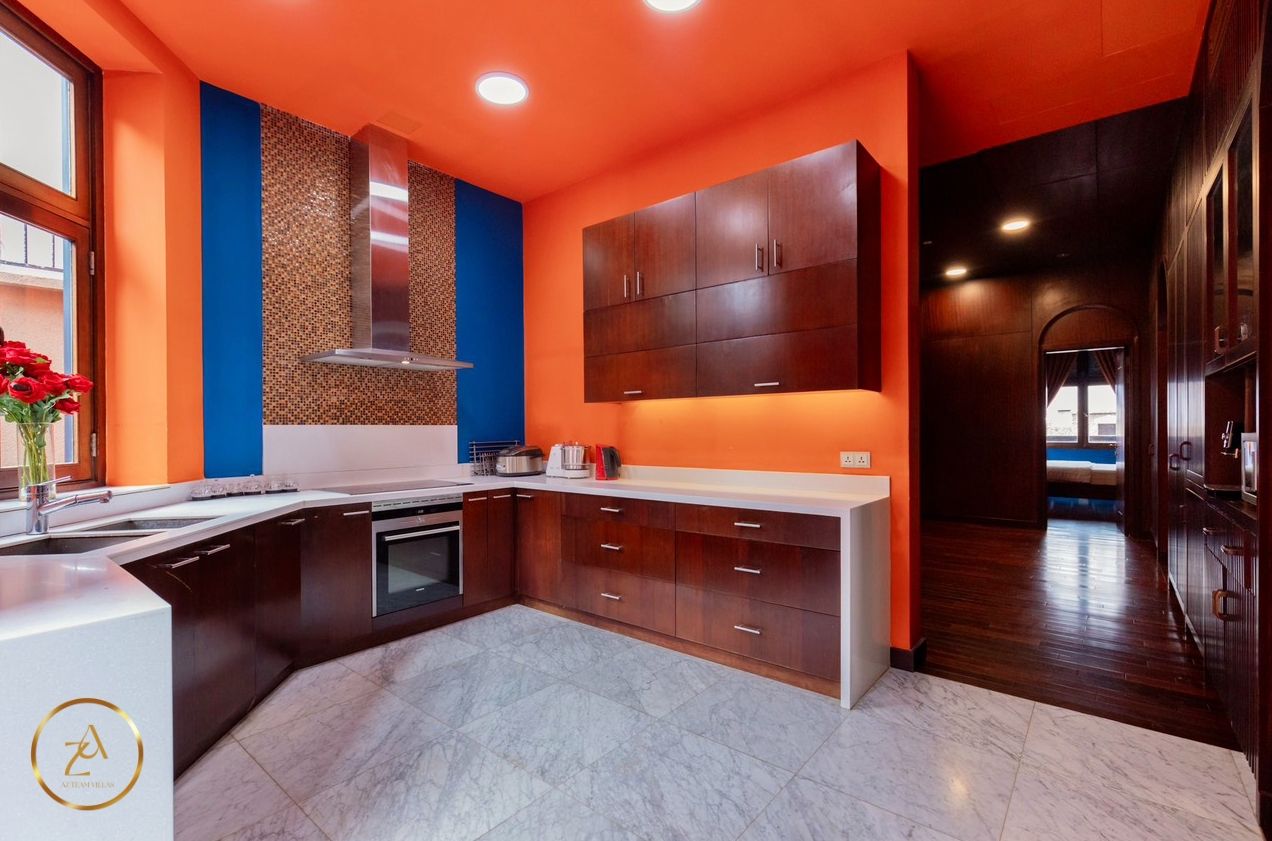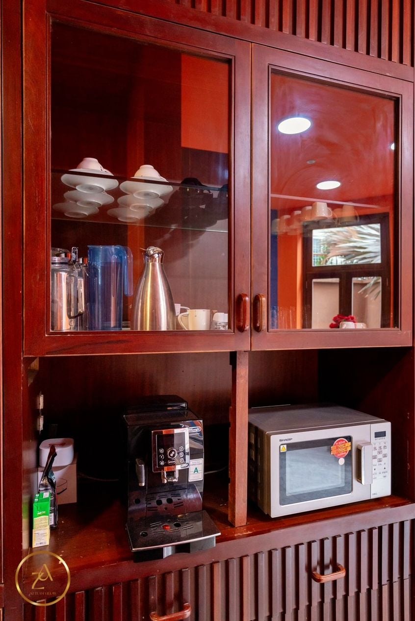 - Bếp cung cấp đầy đủ dụng cụ nấu ăn: lò vi sóng, lò nướng, nồi cơm điện, ấm đun nước điện, tủ lạnh, bát đĩa