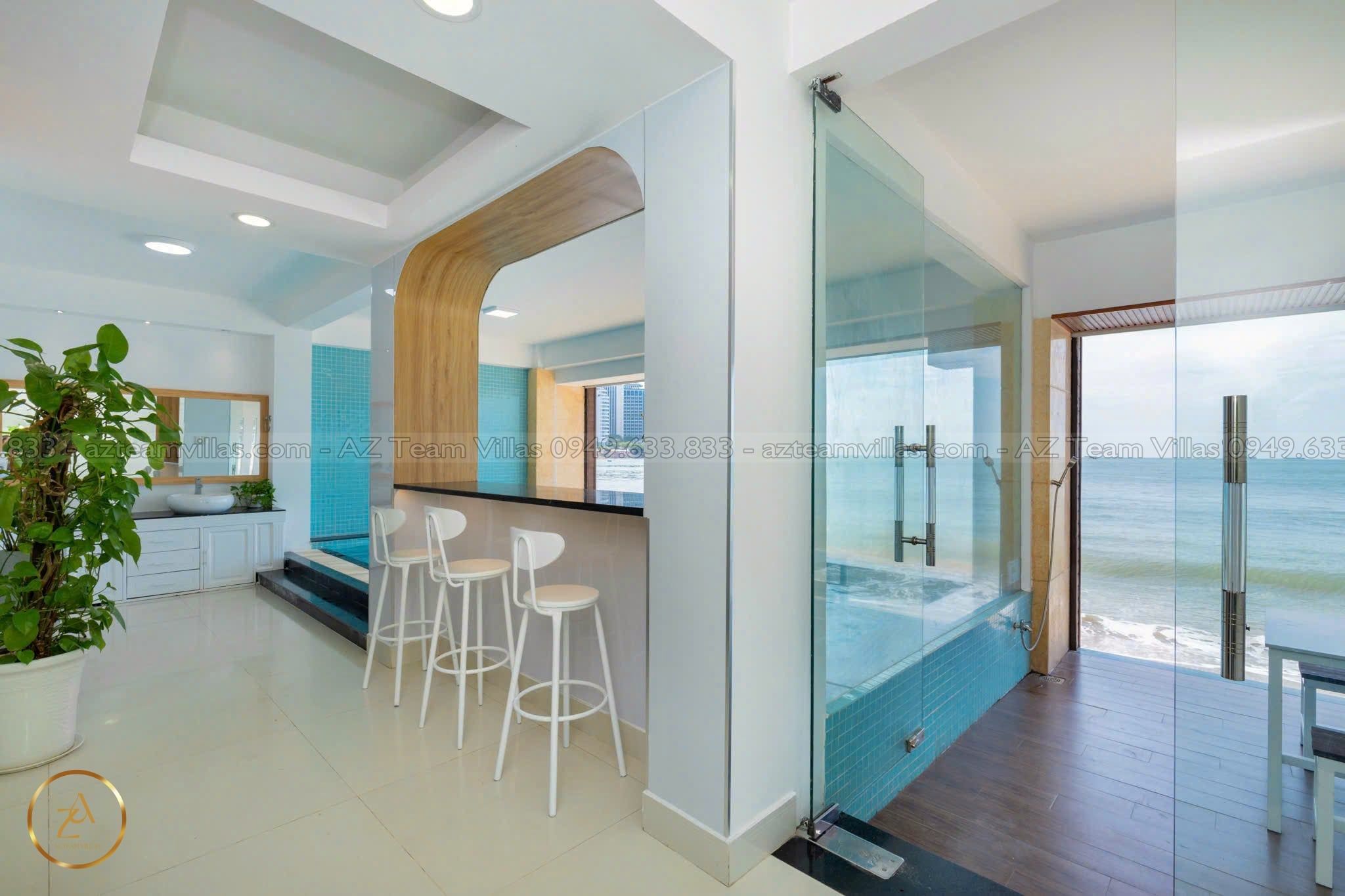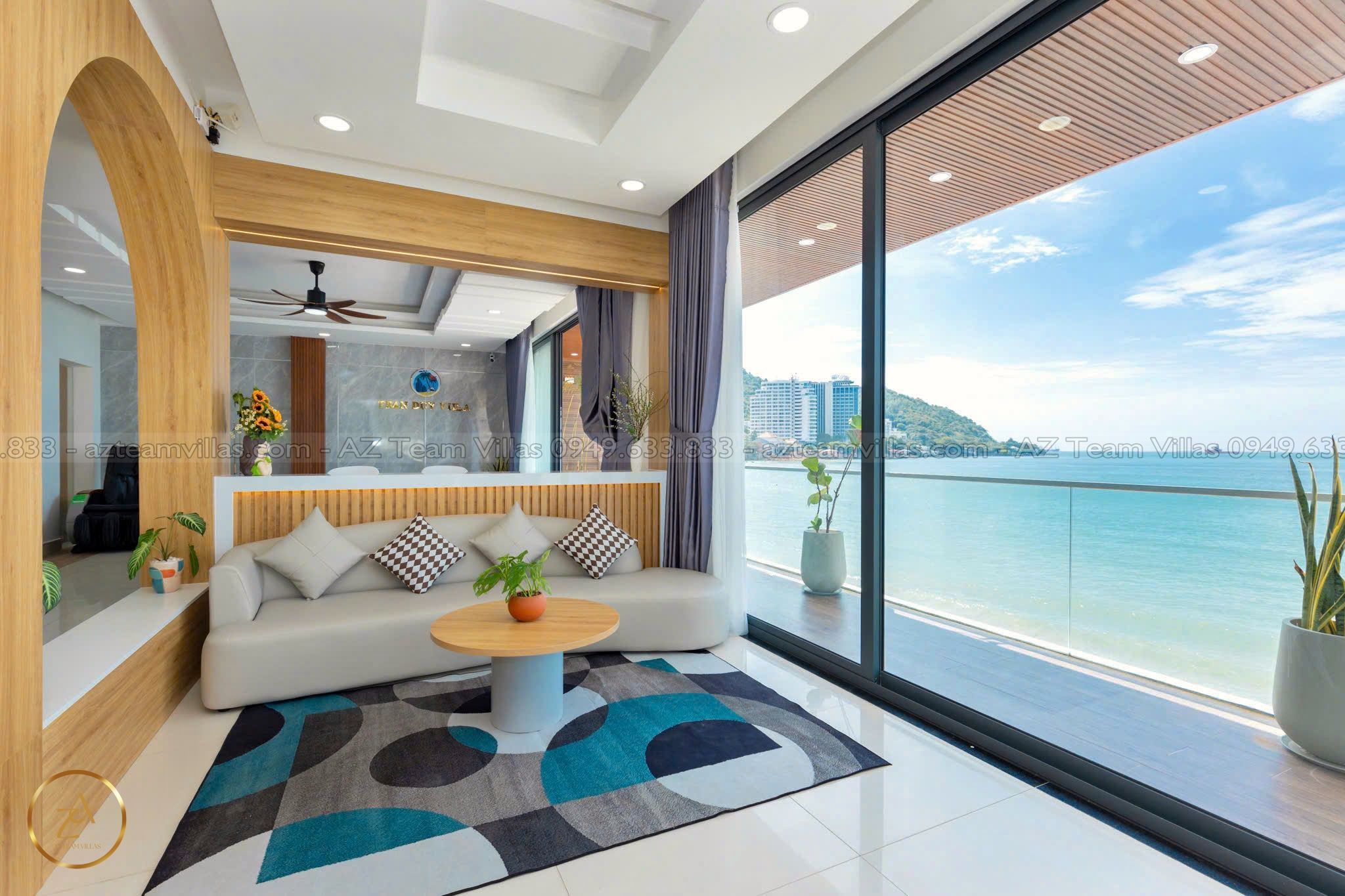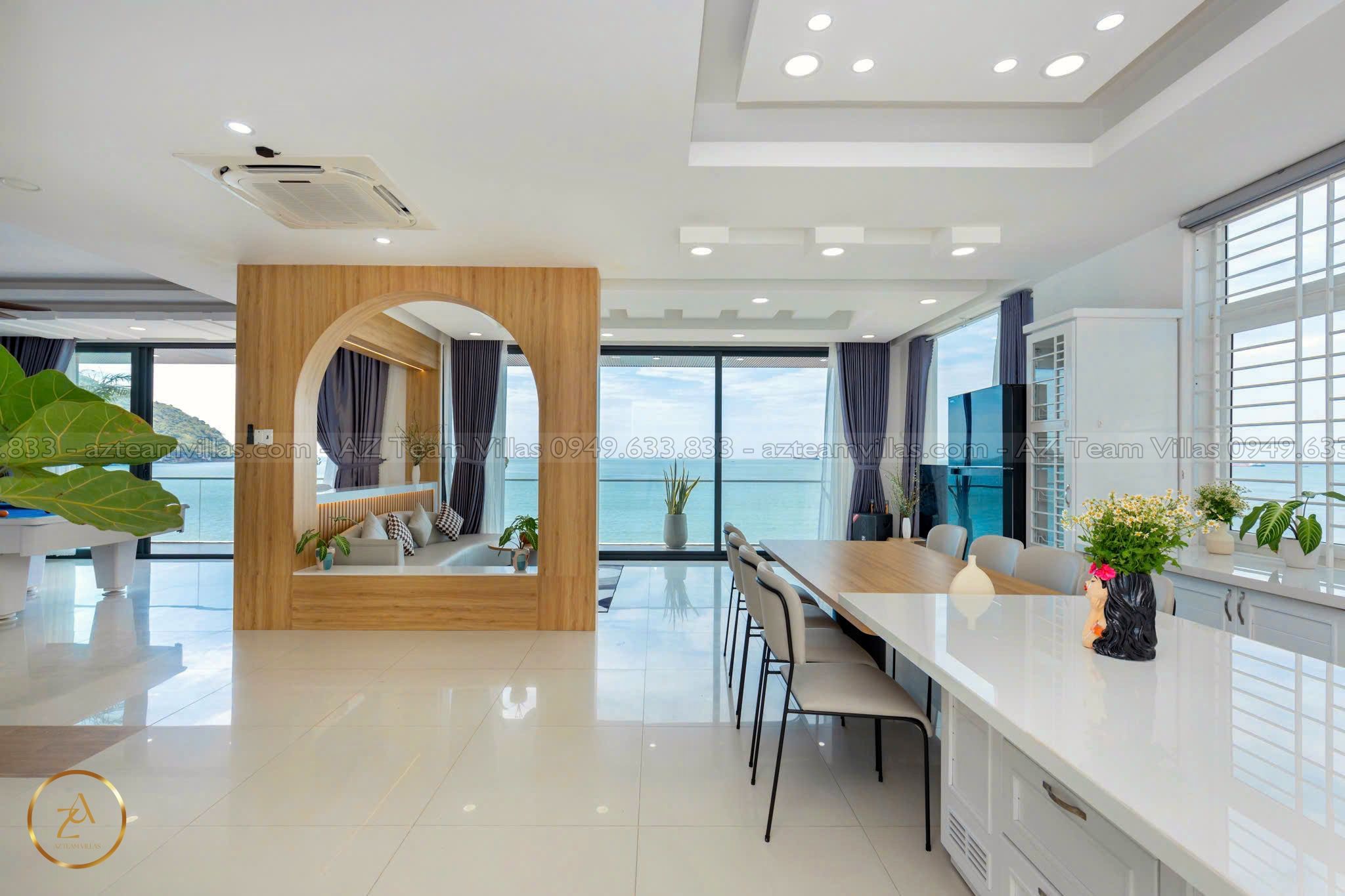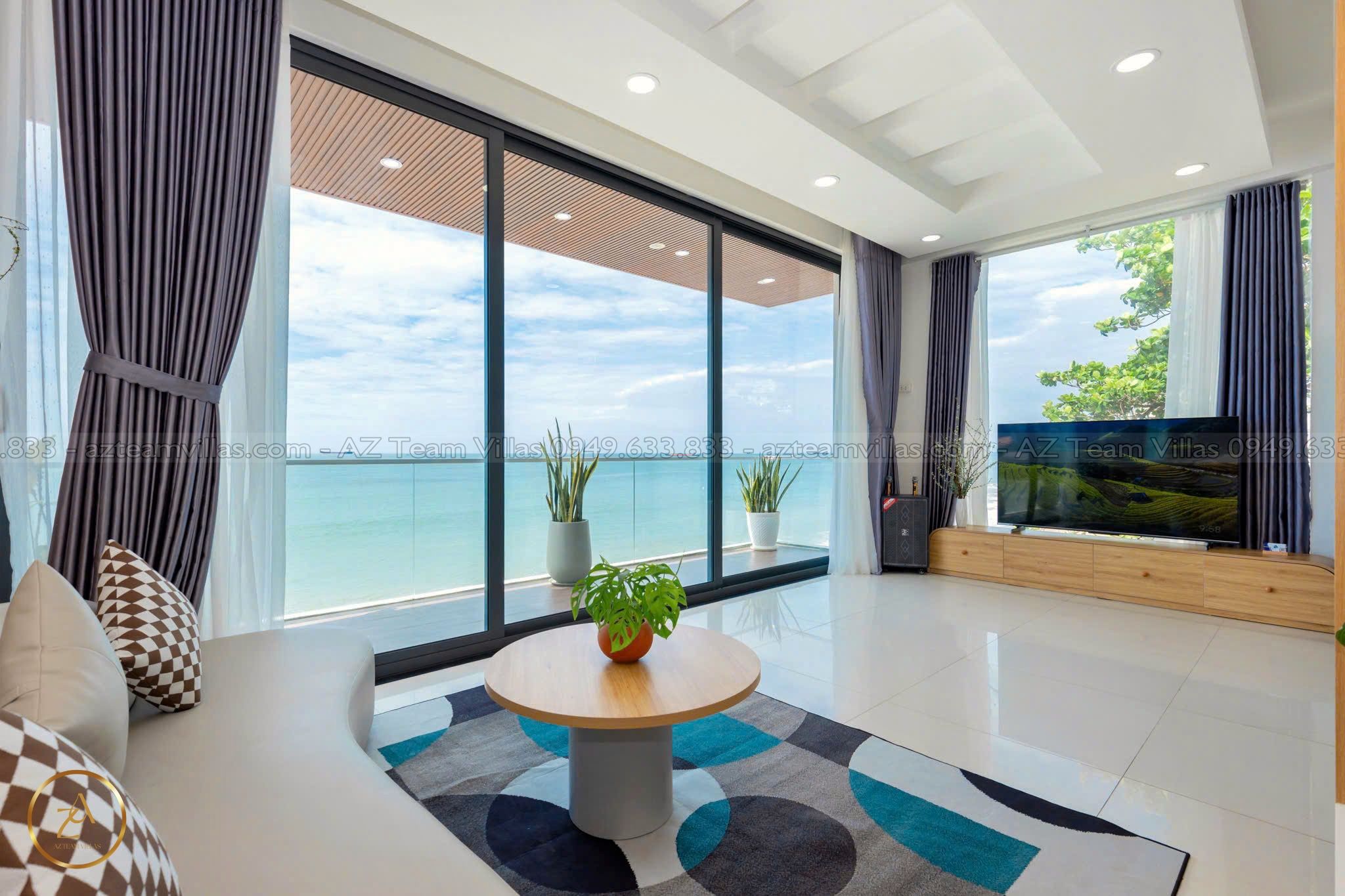 - Phòng khách rộng rãi: Cửa sổ lớn hướng hồ bơi & biển.