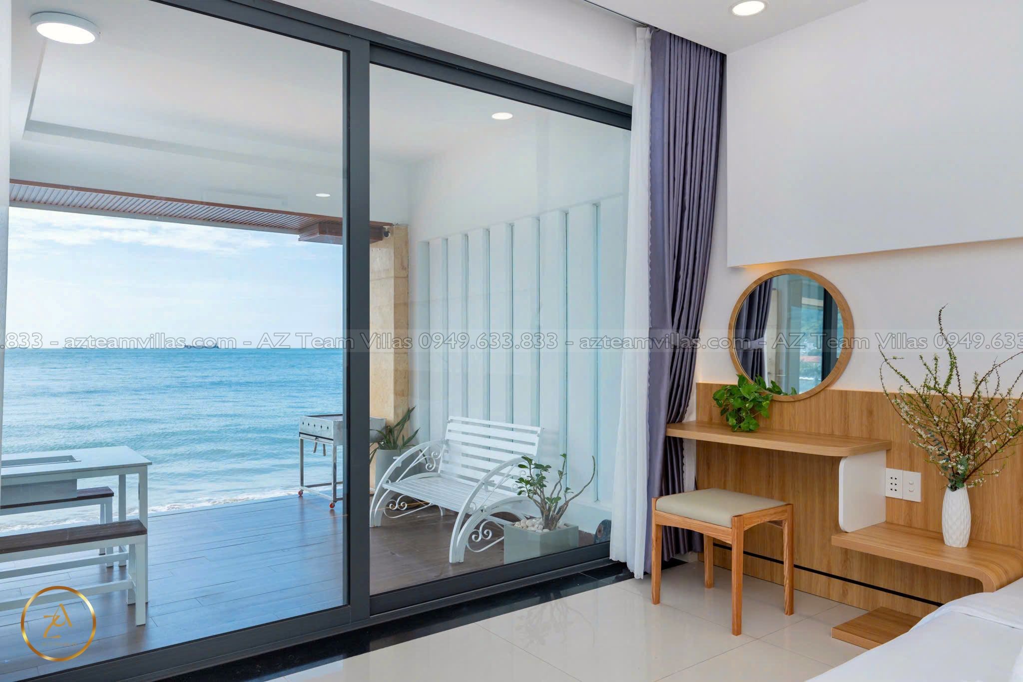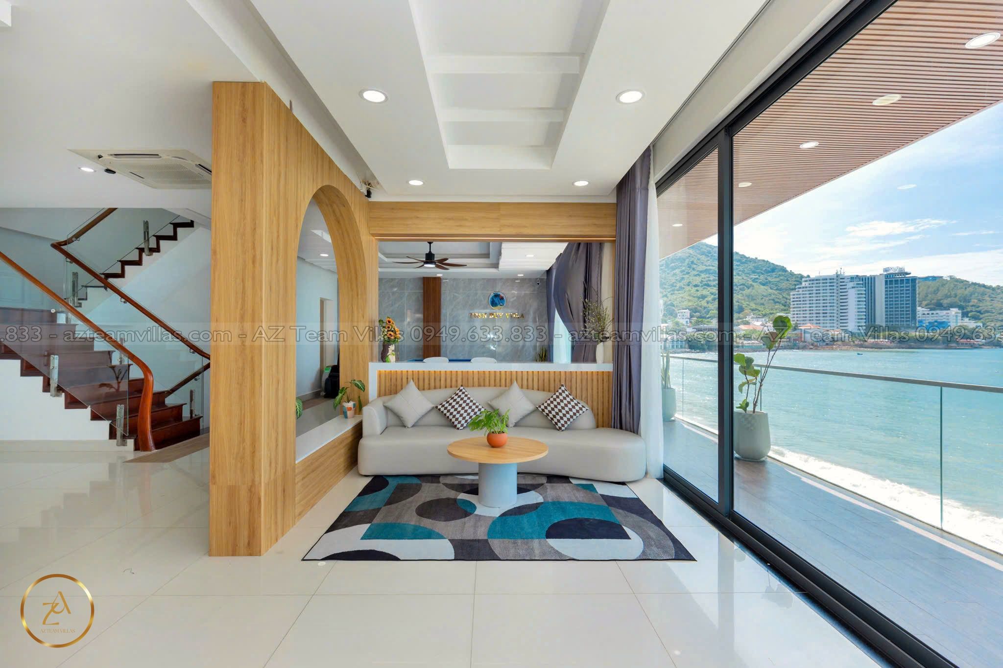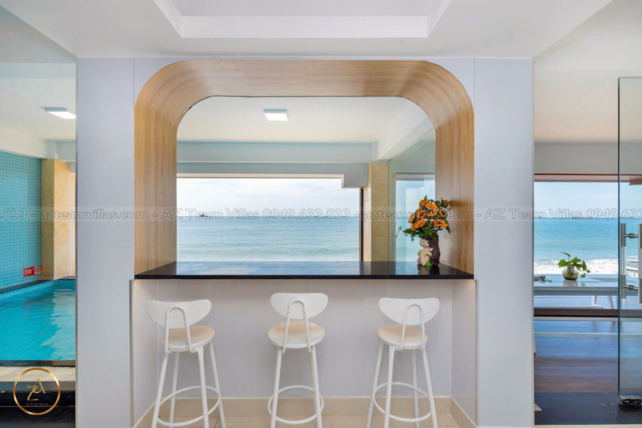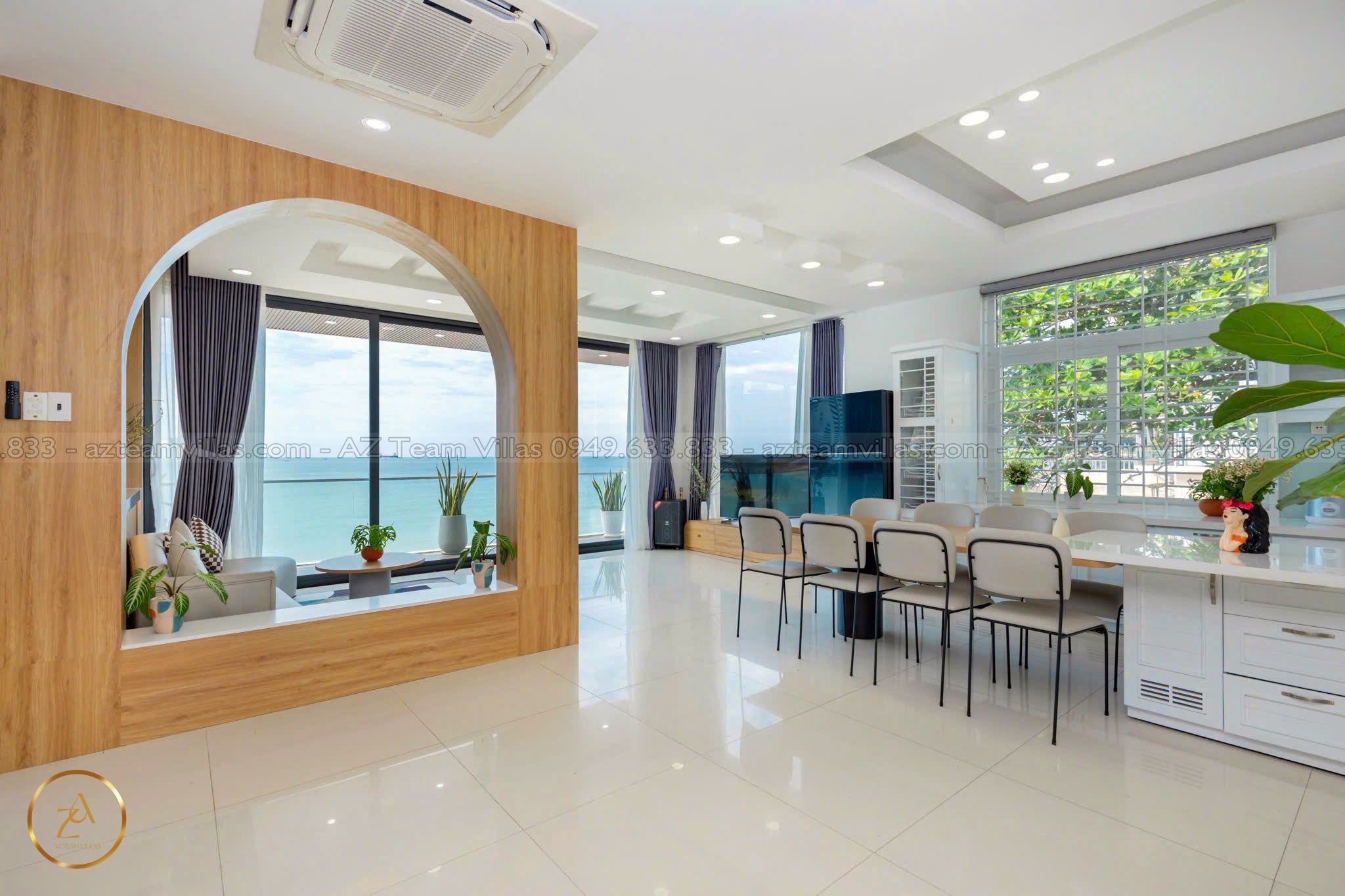 - Phòng khách rộng rãi: Cửa sổ lớn hướng hồ bơi & biển.