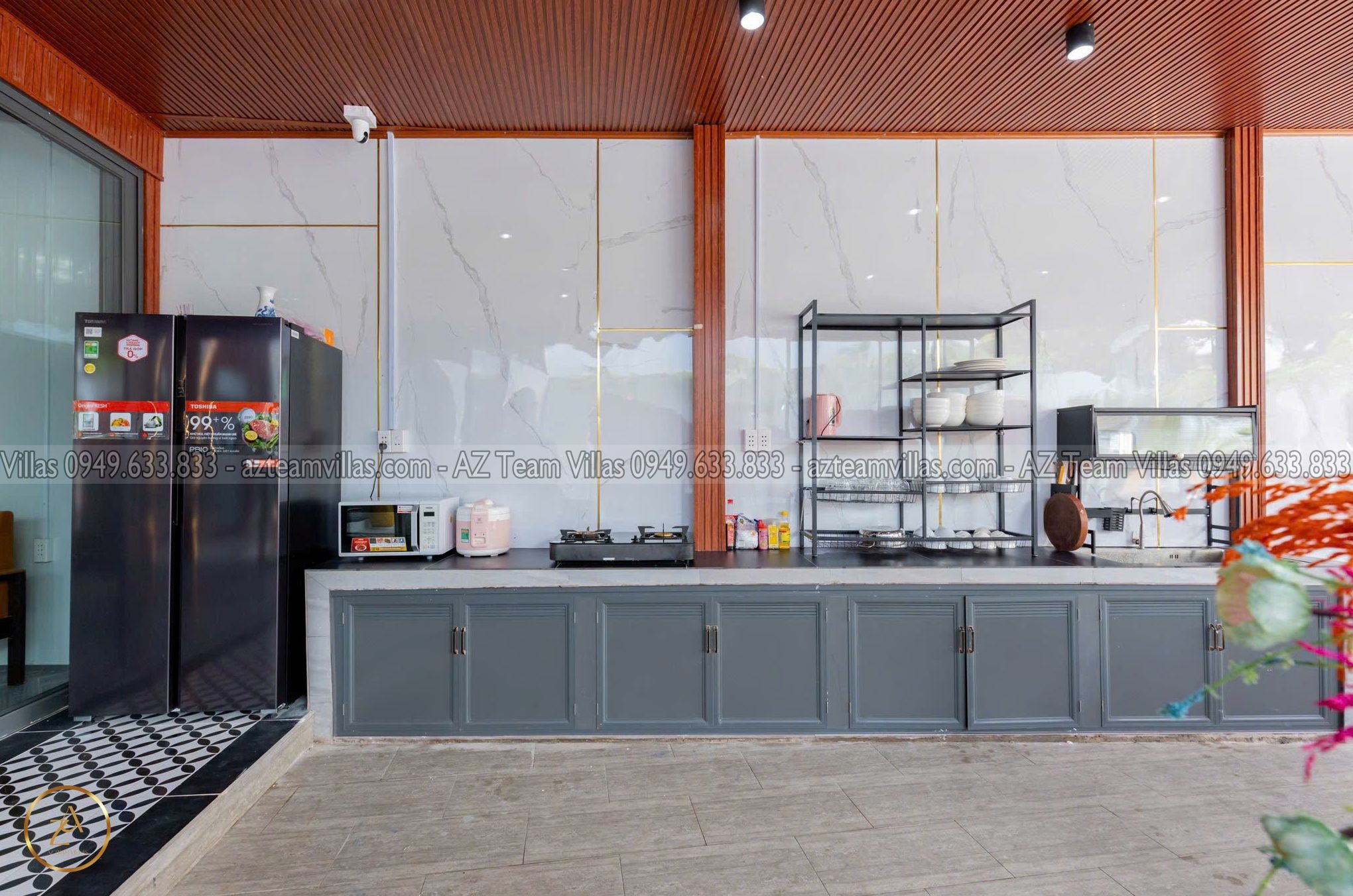 - Bếp cung cấp đầy đủ dụng cụ nấu ăn: lò vi sóng, lò nướng, nồi cơm điện, ấm đun nước điện, tủ lạnh, bát đĩa