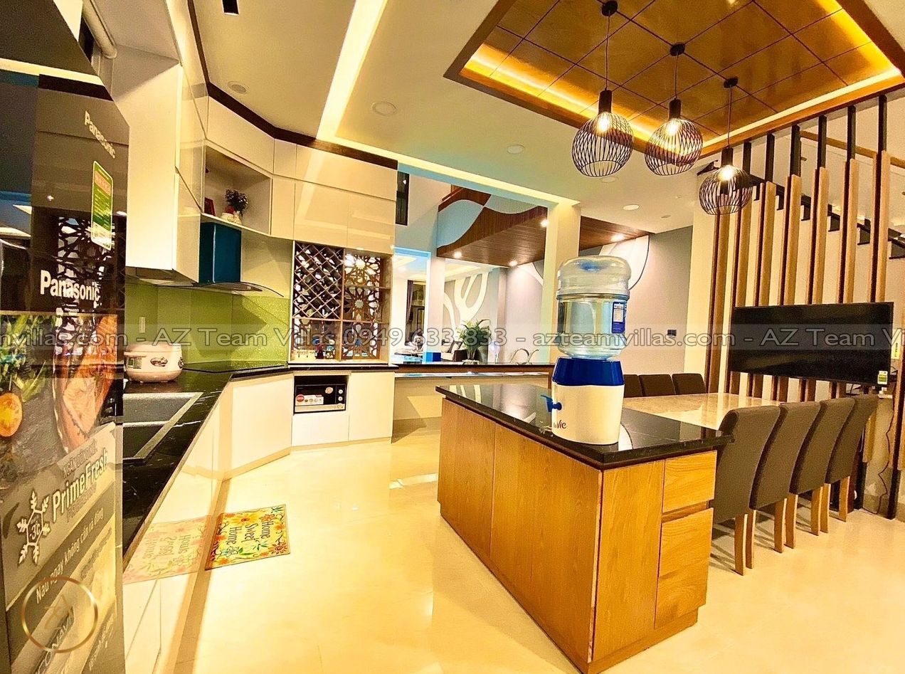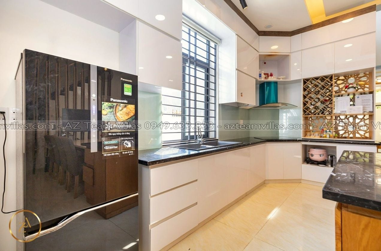 - Bếp cung cấp đầy đủ dụng cụ nấu ăn: lò vi sóng, lò nướng, nồi cơm điện, ấm đun nước điện, tủ lạnh, bát đĩa