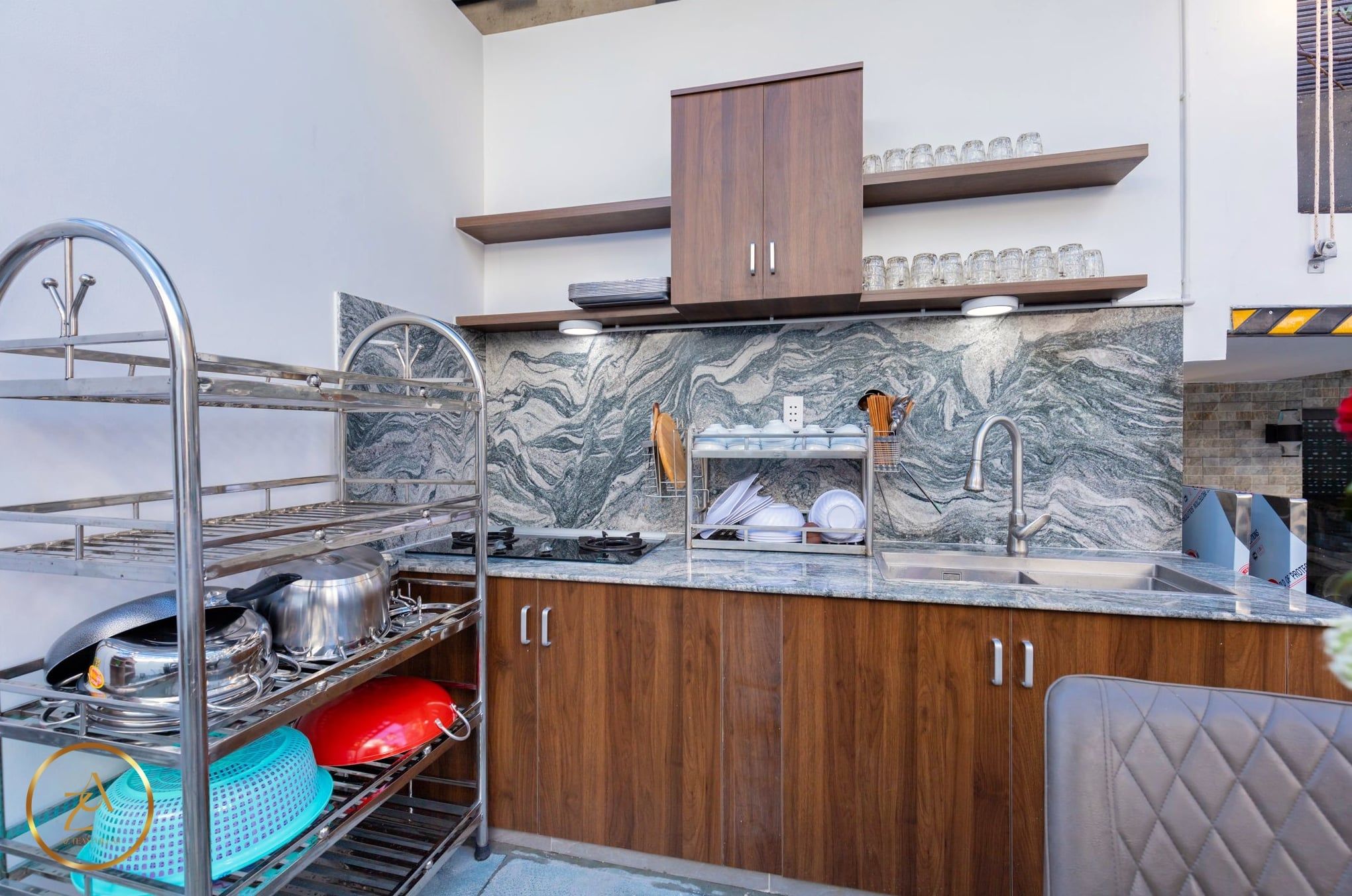 - Bếp cung cấp đầy đủ dụng cụ nấu ăn: lò vi sóng, lò nướng, nồi cơm điện, ấm đun nước điện, tủ lạnh, bát đĩa