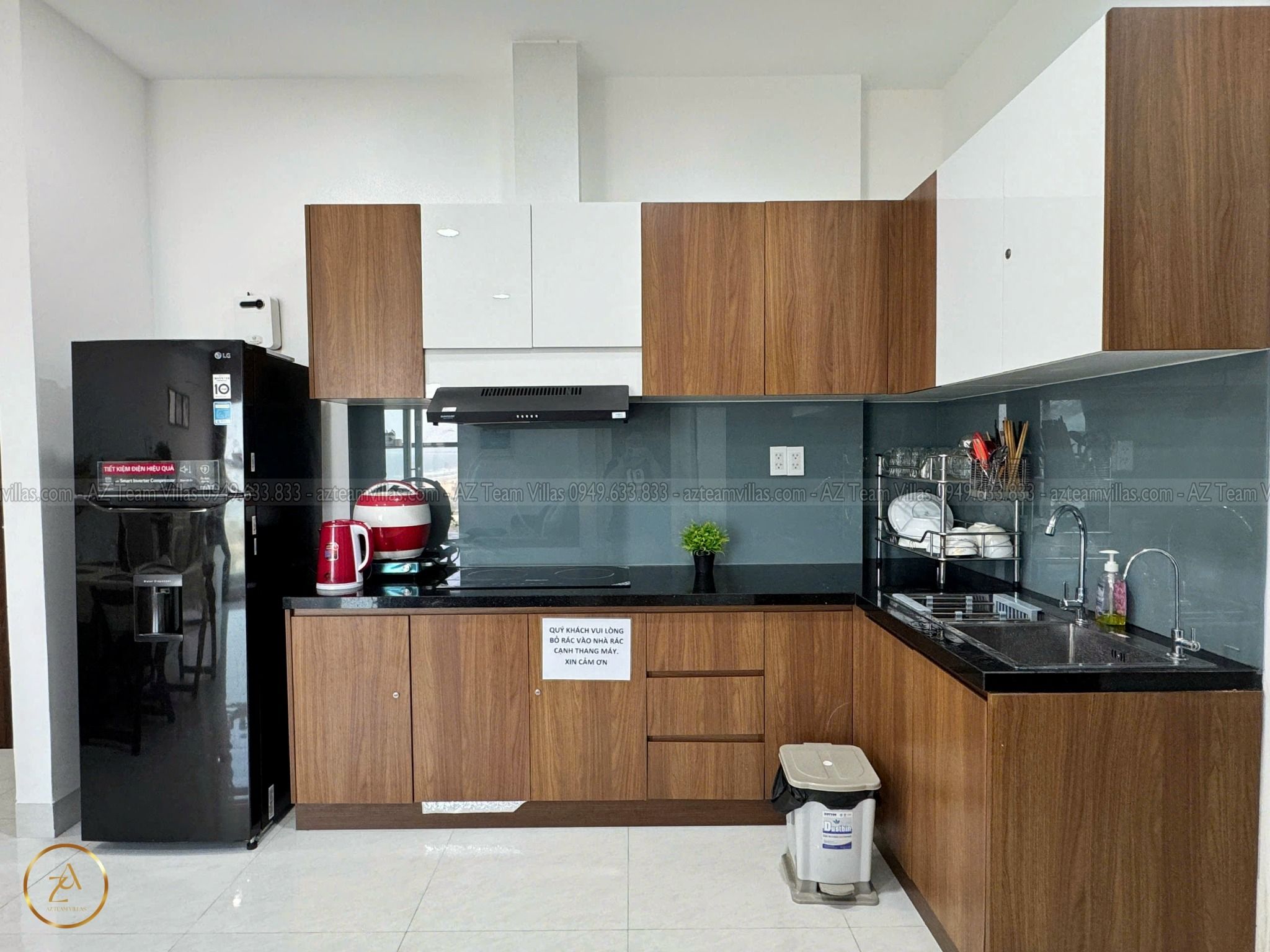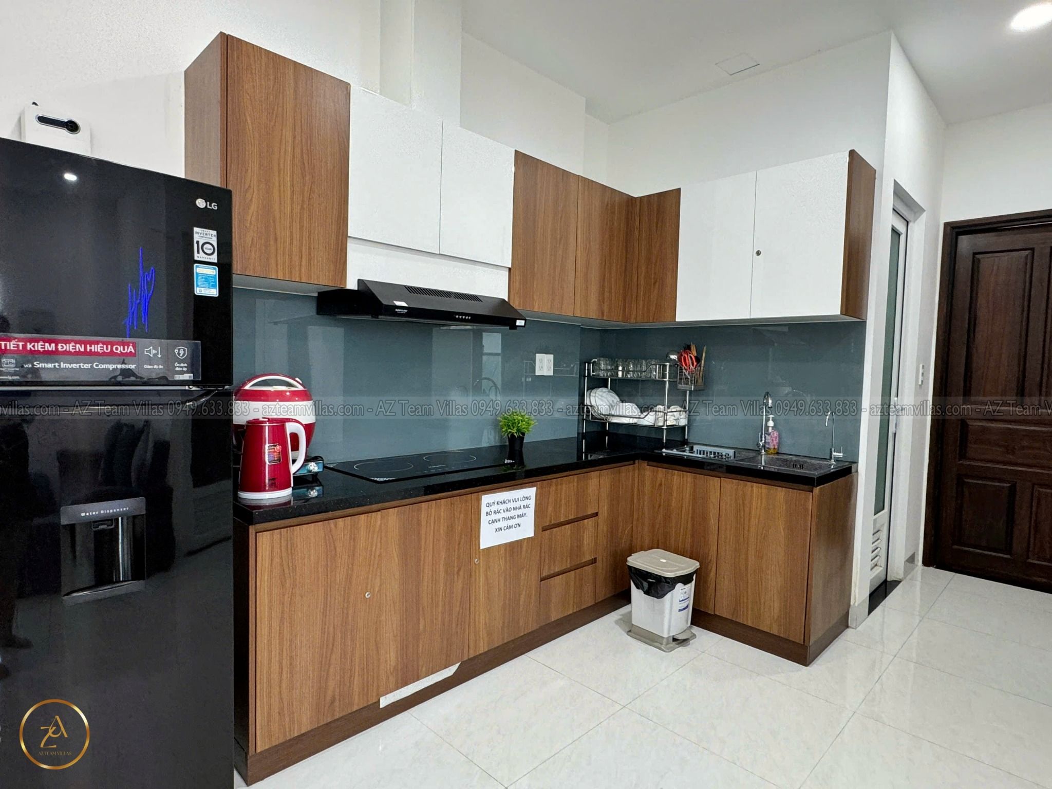 - Bếp đầy đủ tiện nghi: bếp từ, lò vi sóng, tủ lạnh, nồi cơm điện, chén dĩa,… giúp bạn dễ dàng nấu nướng như ở nhà.