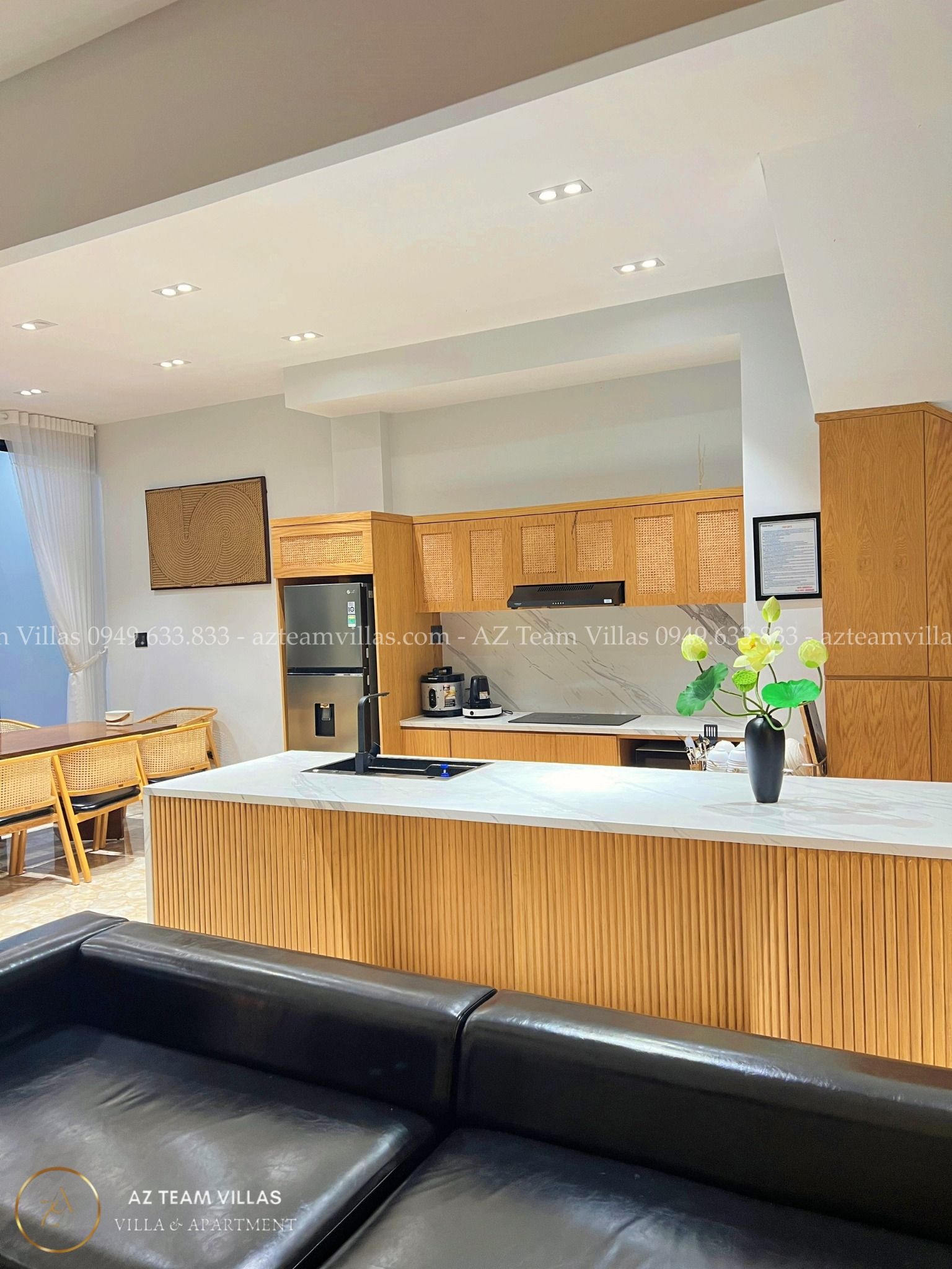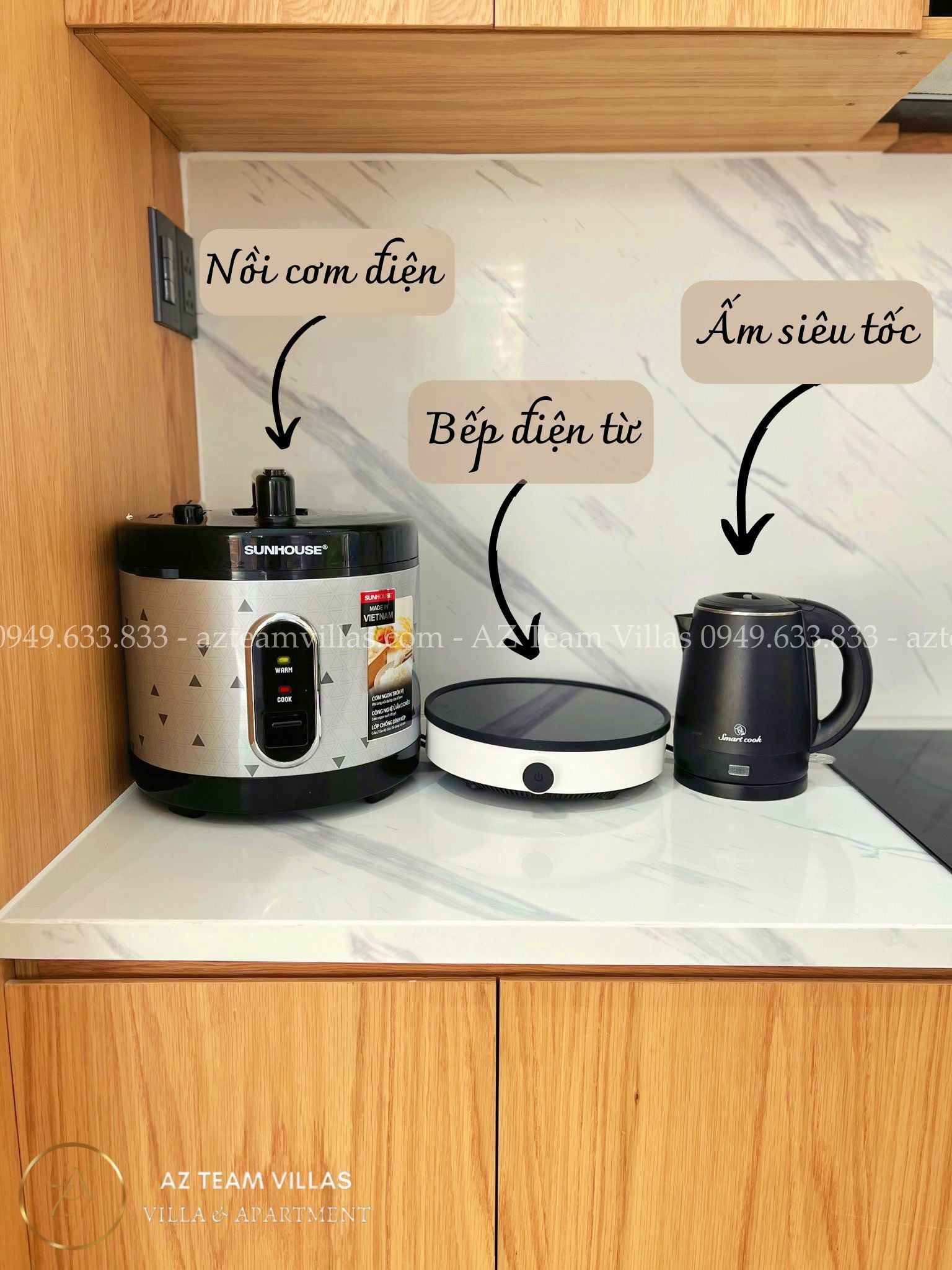 - Phòng bếp cung cấp đầy đủ đồ dùng nấu bếp: lò vi sóng, lò nướng, nồi cơm điện, bình siêu tốc, tủ lạnh, chén bát đĩa