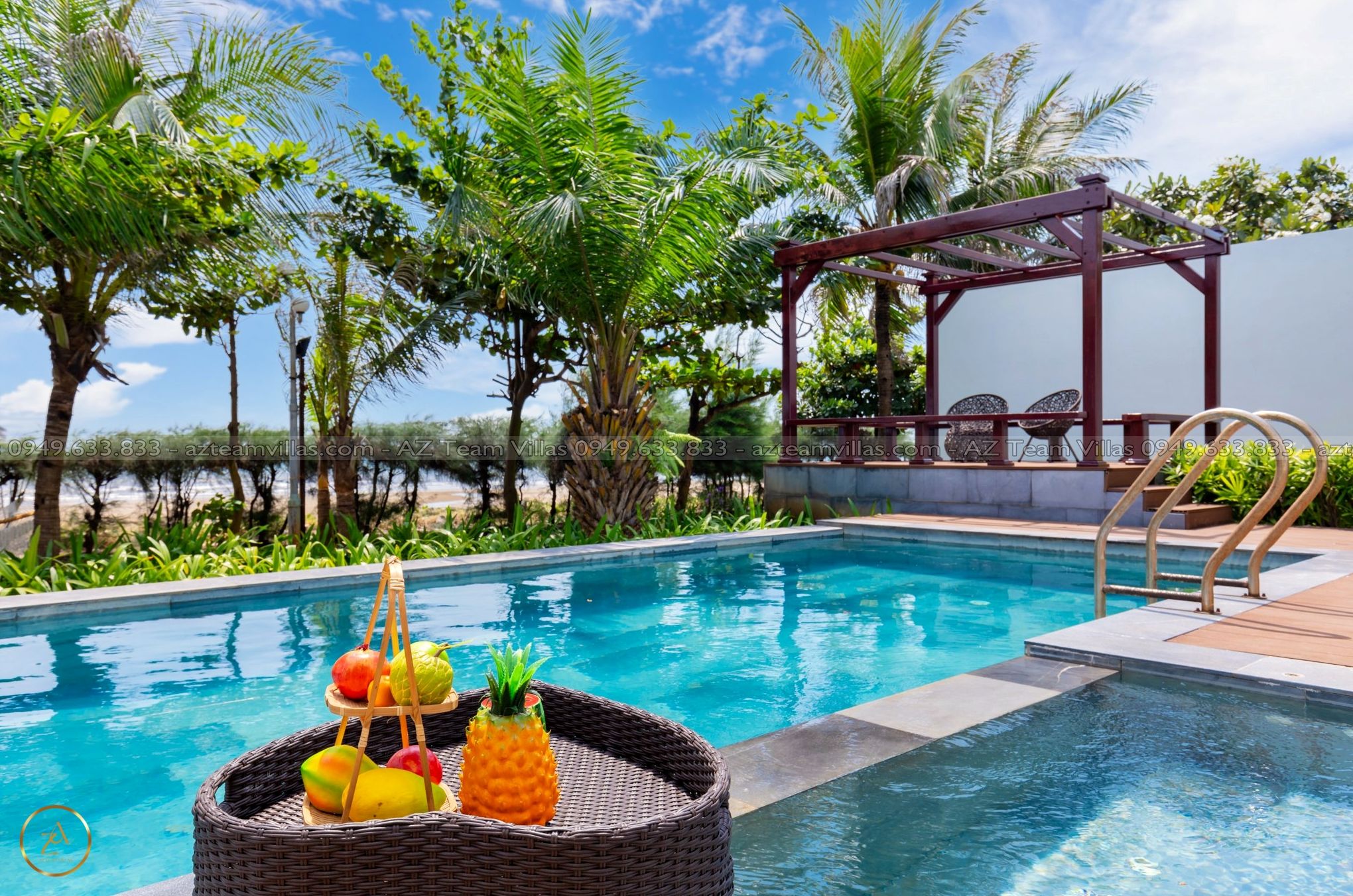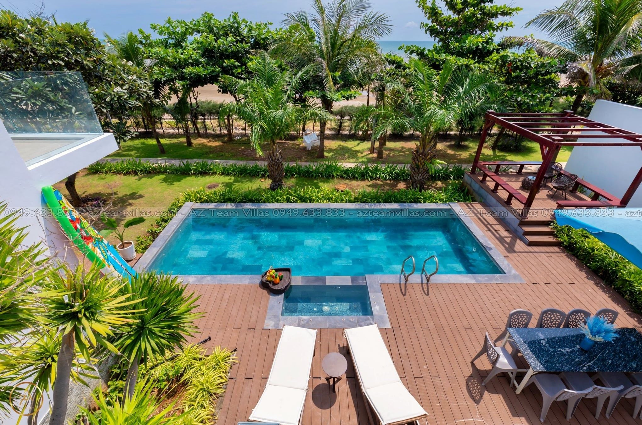- Hồ bơi 40 m2 có ghế tắm nắng, dù che cỡ lớn