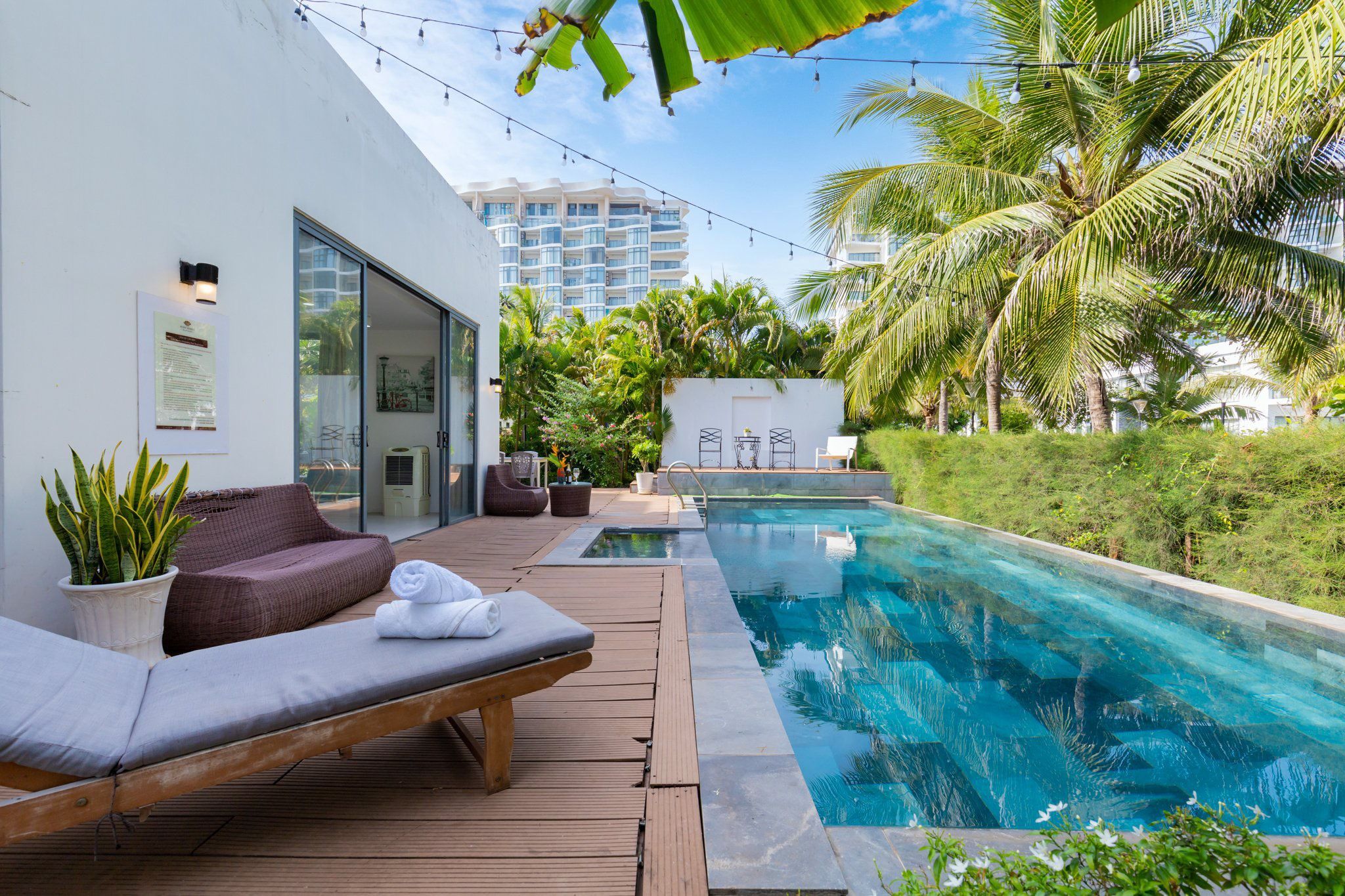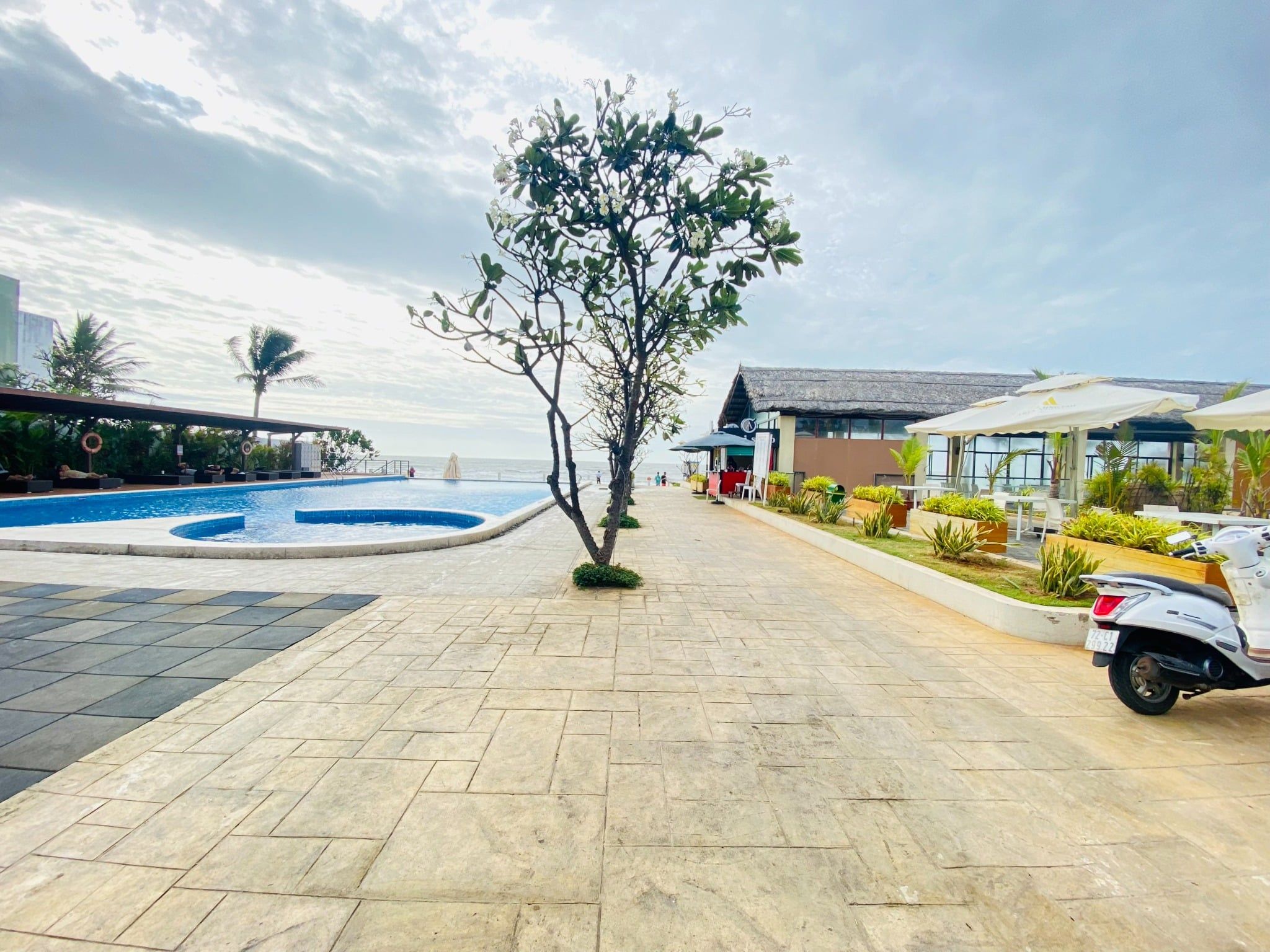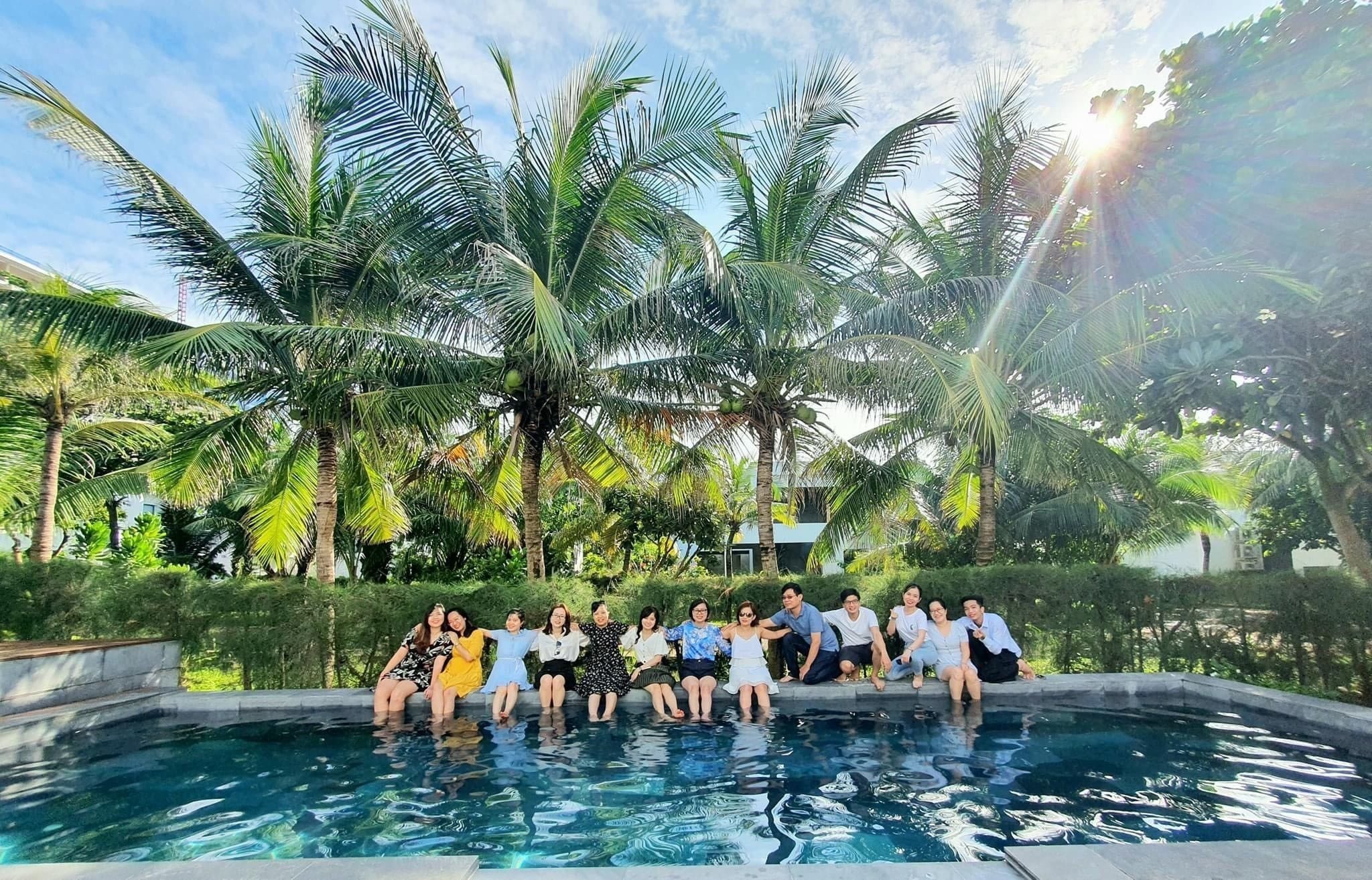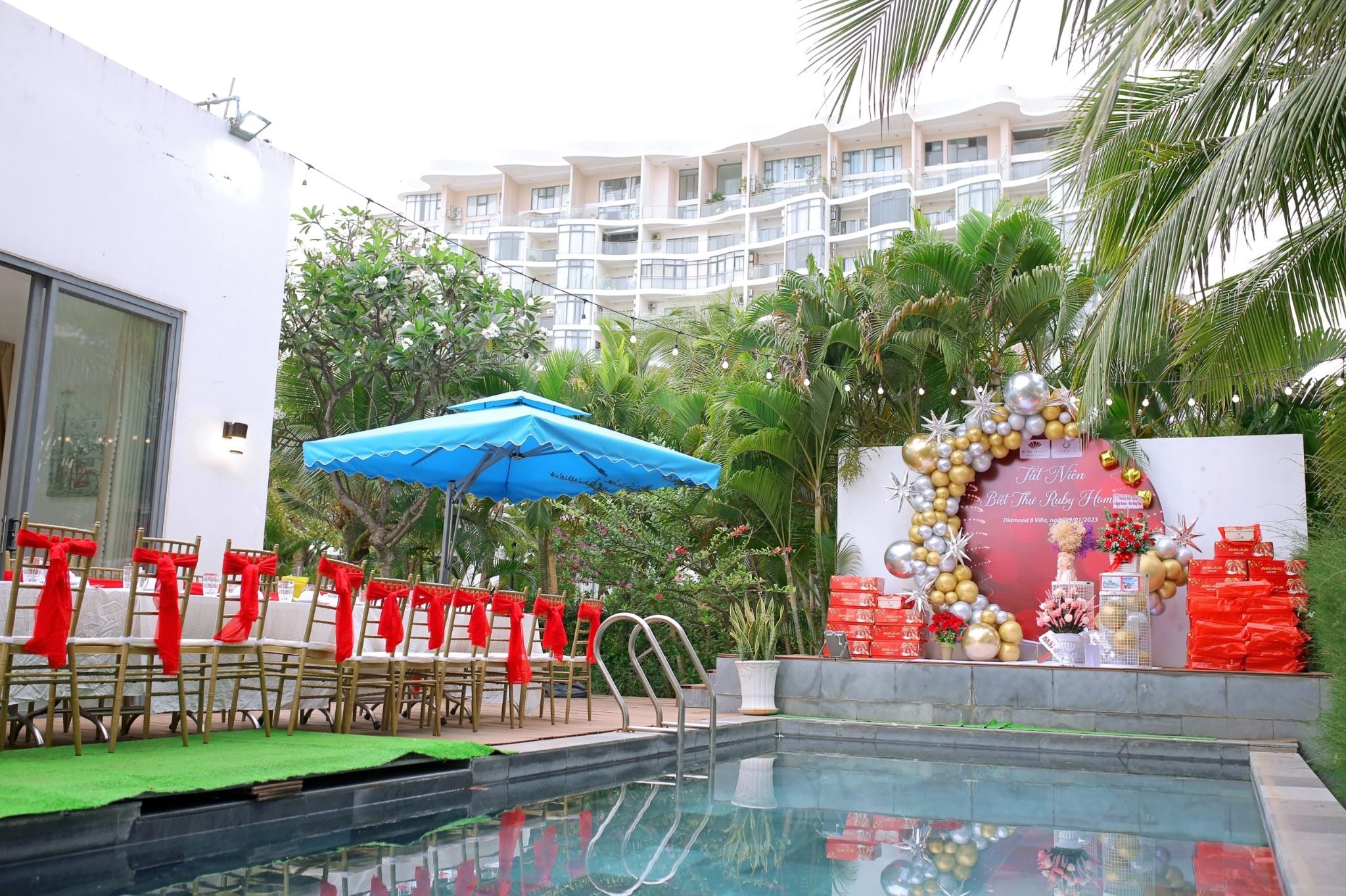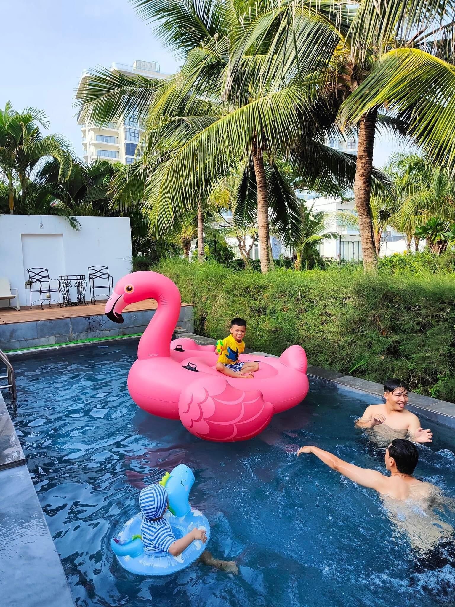 - Hồ bơi 40 m2 có ghế tắm nắng, dù che cỡ lớn