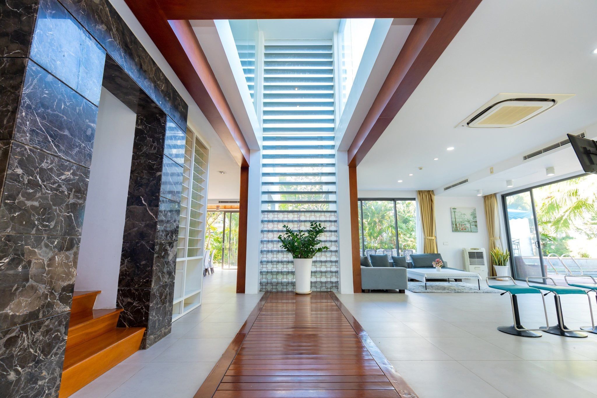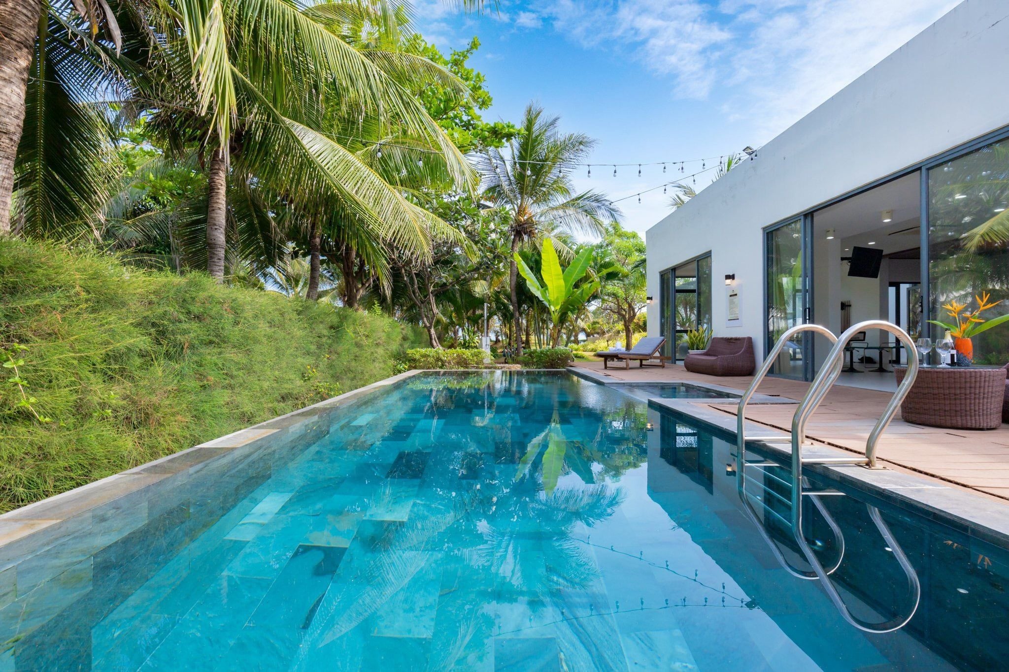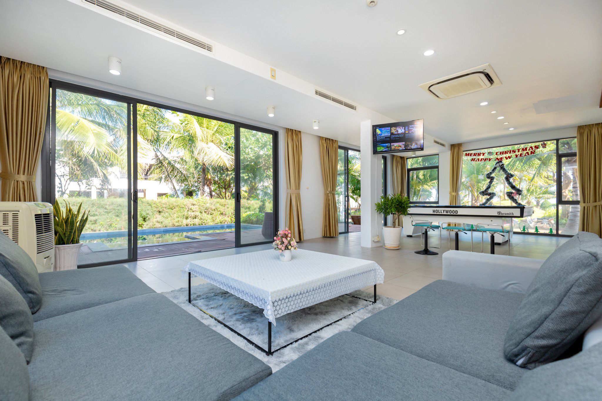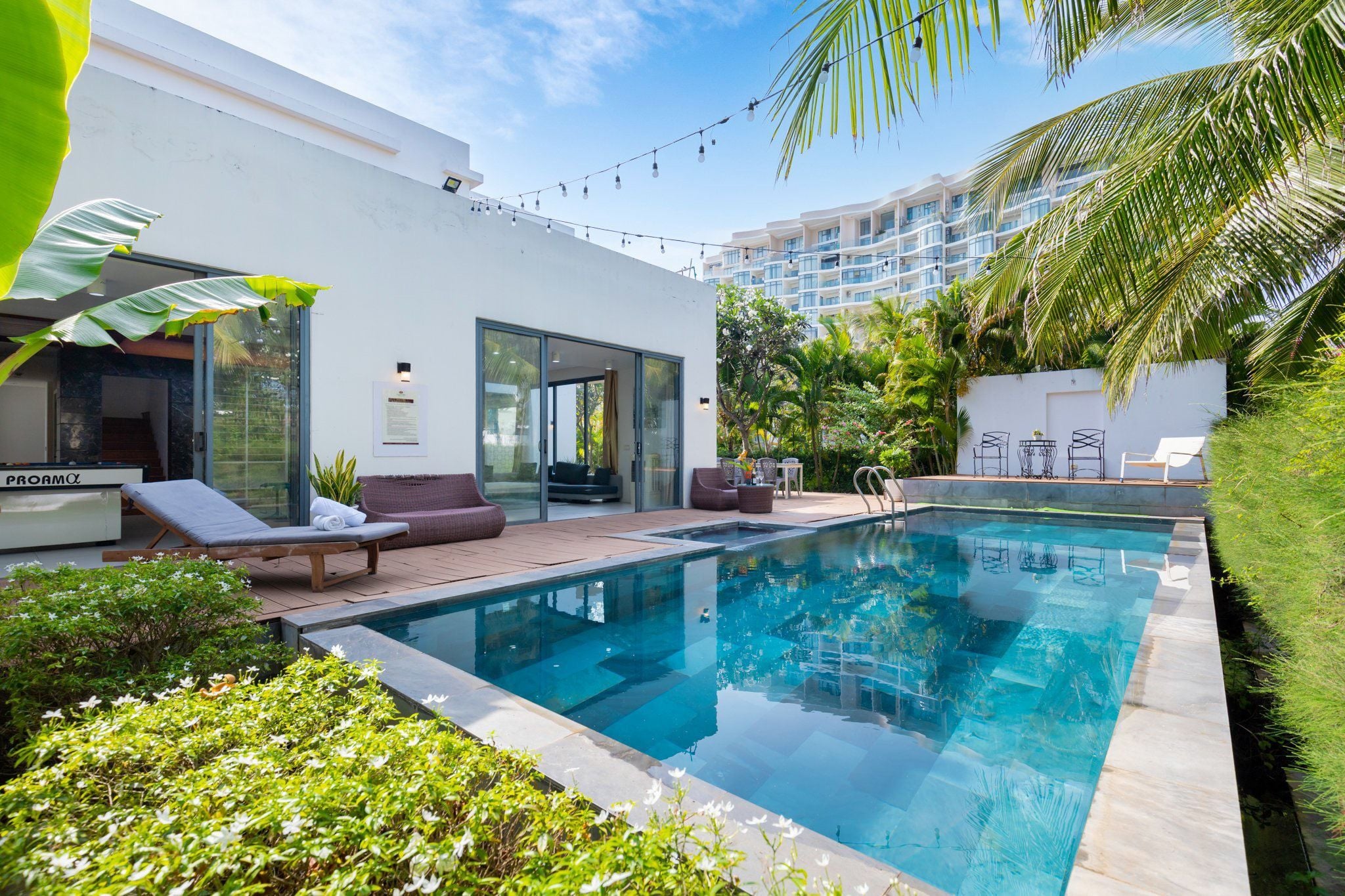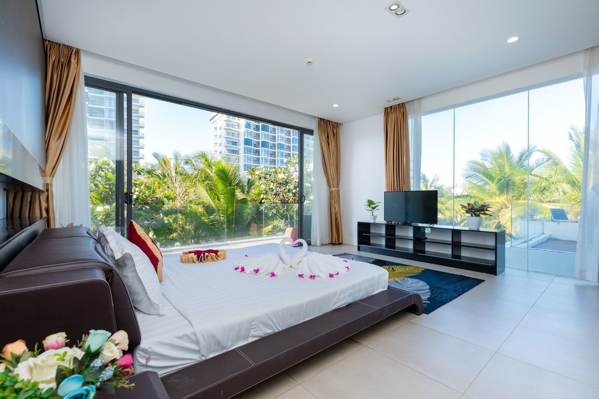 Là một biệt thự sang trọng và hiện đại, nằm trong khu nghỉ dưỡng cao cấp Aria Resort tại Vũng Tàu. Vị trí của villa là một ưu điểm lớn, vì nó nằm sát bãi biển Long Cung, một trong những bãi biển đẹp nhất Vũng Tàu. Từ villa, bạn chỉ cần đi bộ vài bước là có thể tận hưởng cảnh biển xanh mát, cát trắng mịn và nắng ấm áp. Bạn cũng có thể ngắm nhìn hoàng hôn tuyệt đẹp trên biển từ sân thượng của villa.