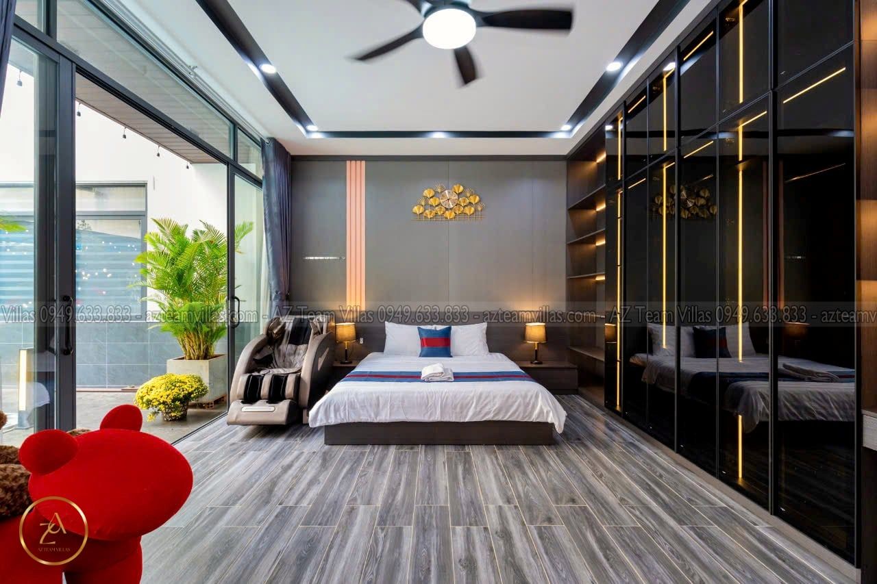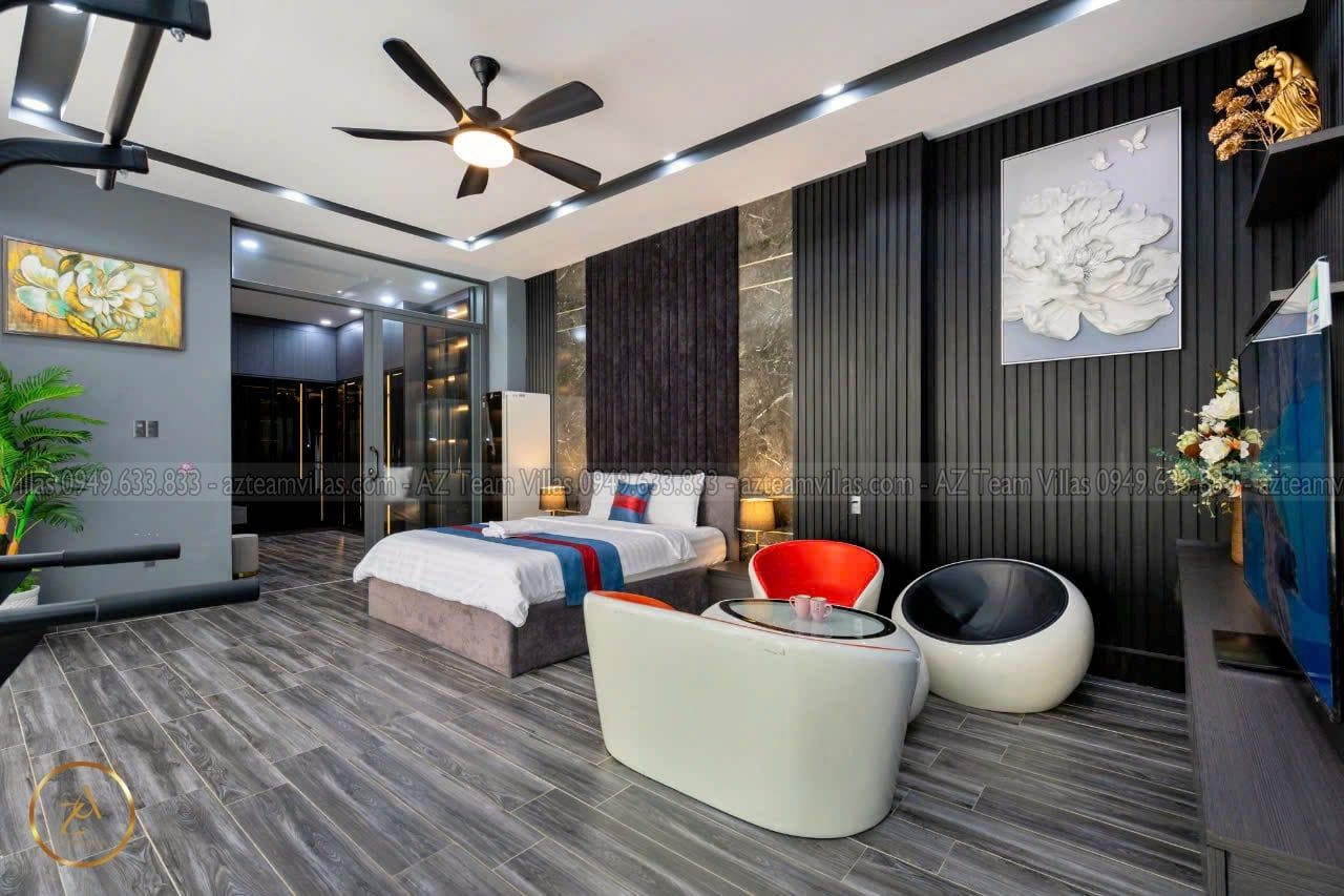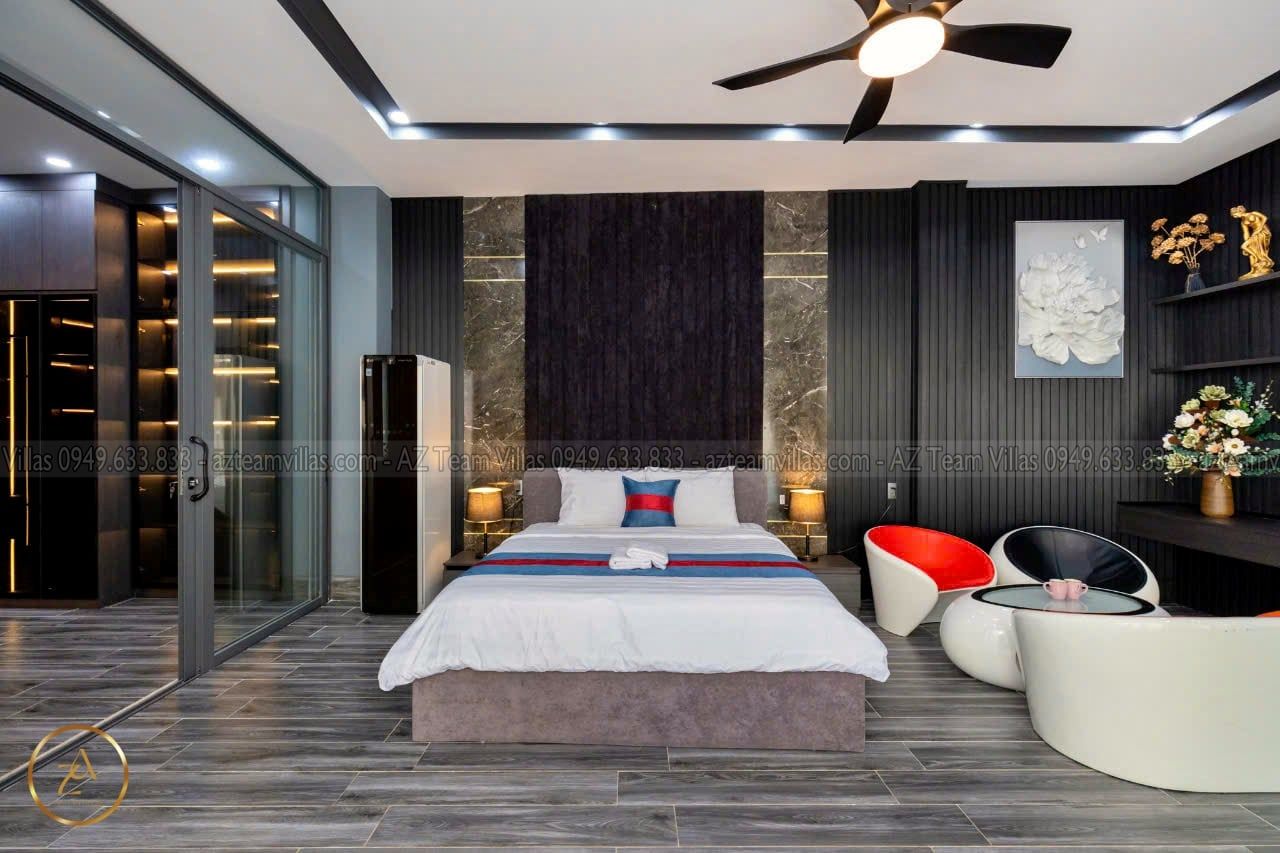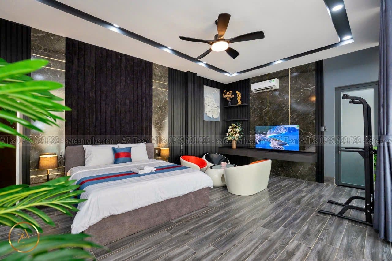 + Phòng Master 1 : 80m2 - giường 1m8, phòng thay đồ riêng biệt,Tivi internet, tolet riêng trong phòng có bồn tắm.