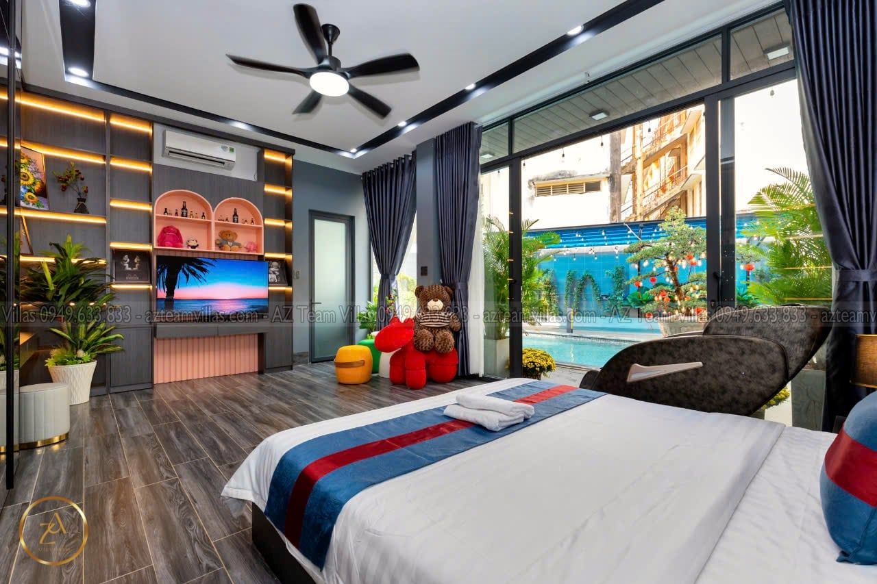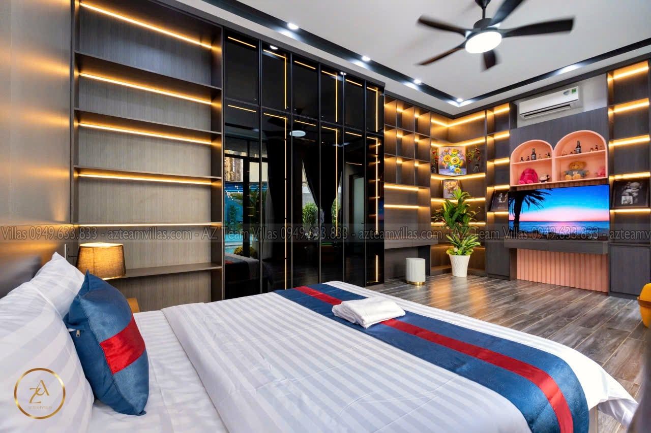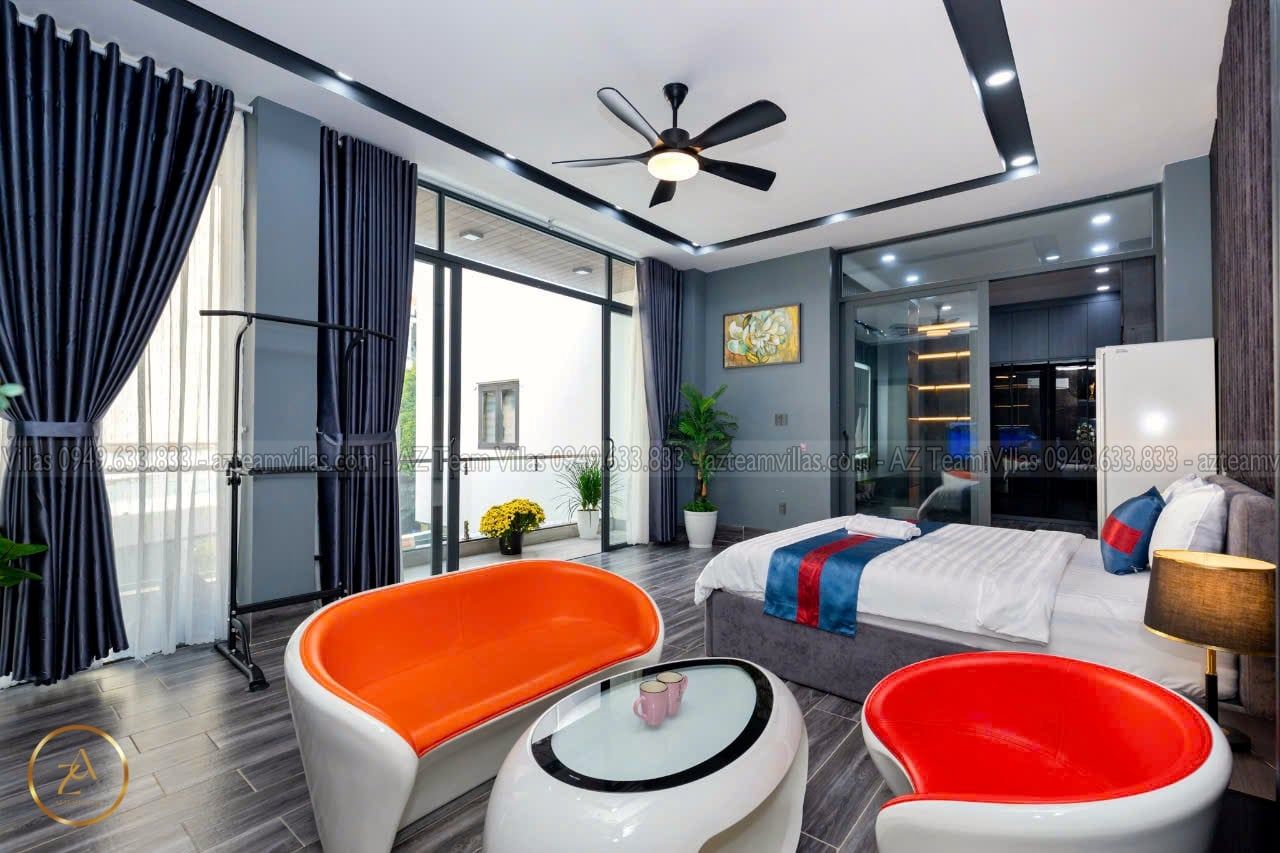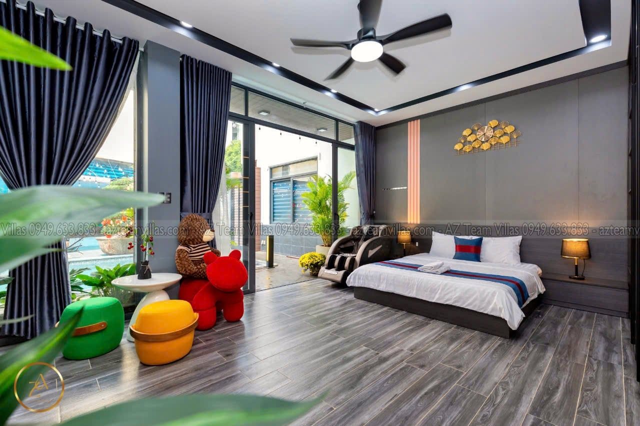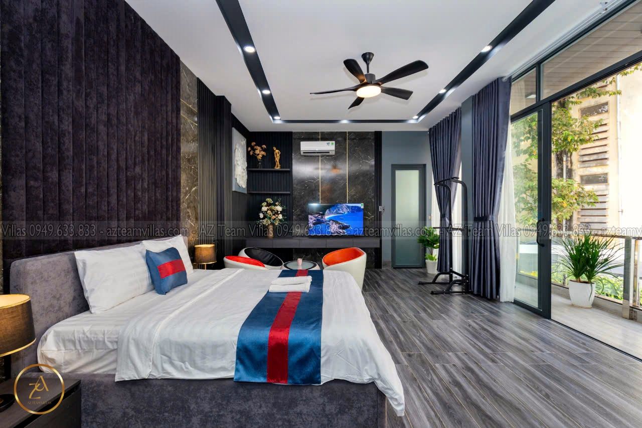 + Phòng Master 1 : 80m2 - giường 1m8, phòng thay đồ riêng biệt,Tivi internet, tolet riêng trong phòng có bồn tắm.