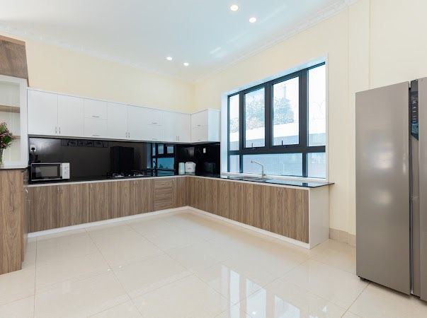 - Bếp cung cấp đầy đủ dụng cụ nấu ăn: lò vi sóng, lò nướng, nồi cơm điện, ấm đun nước điện, tủ lạnh, bát đĩa